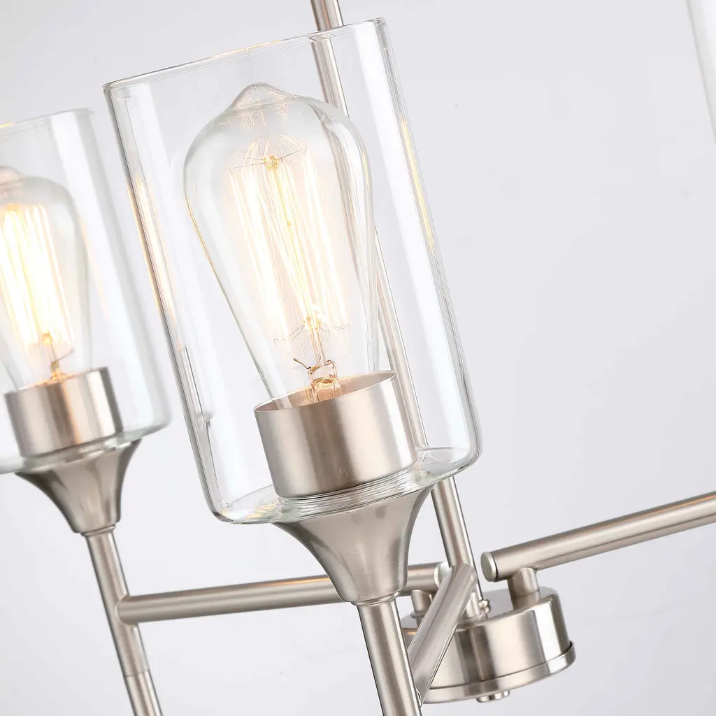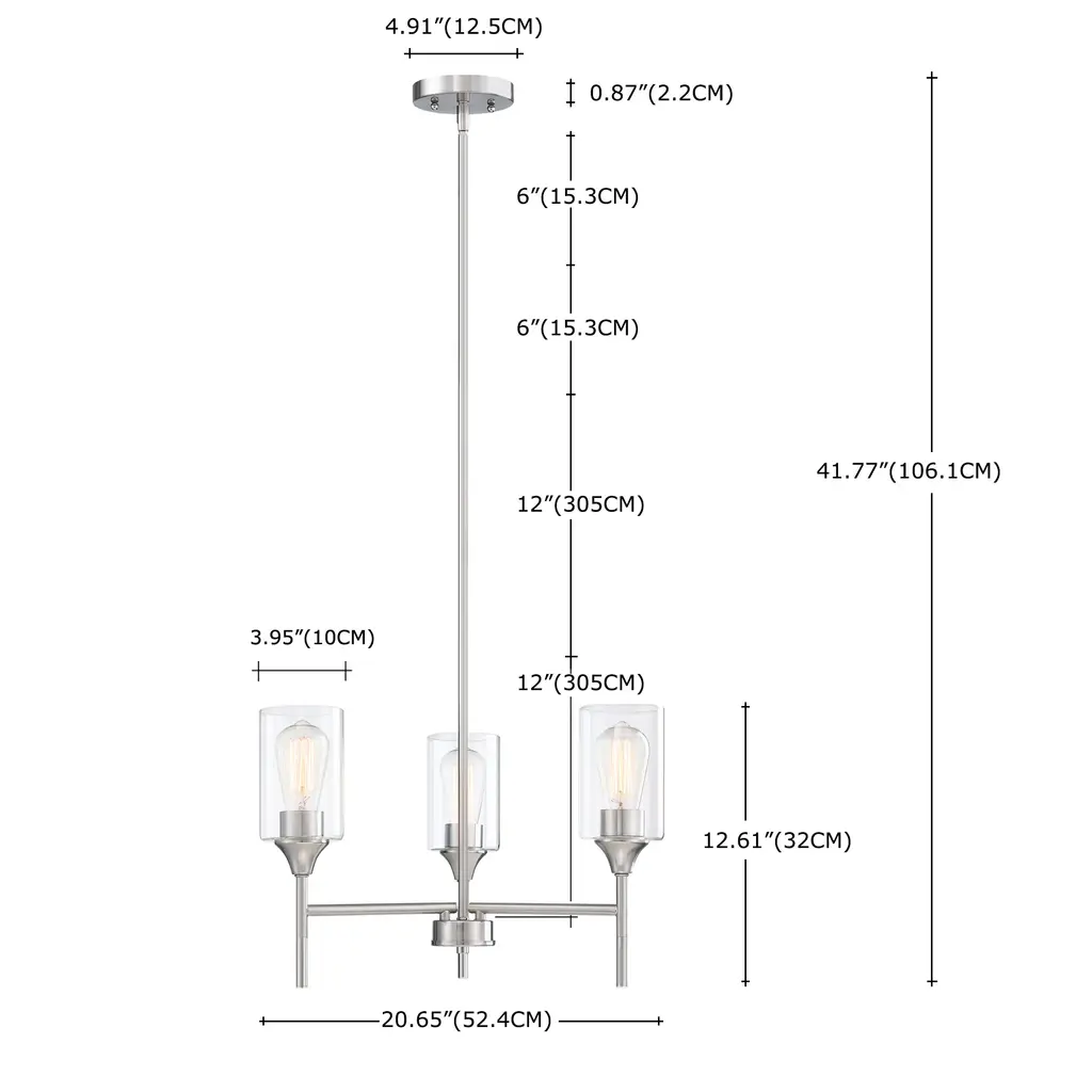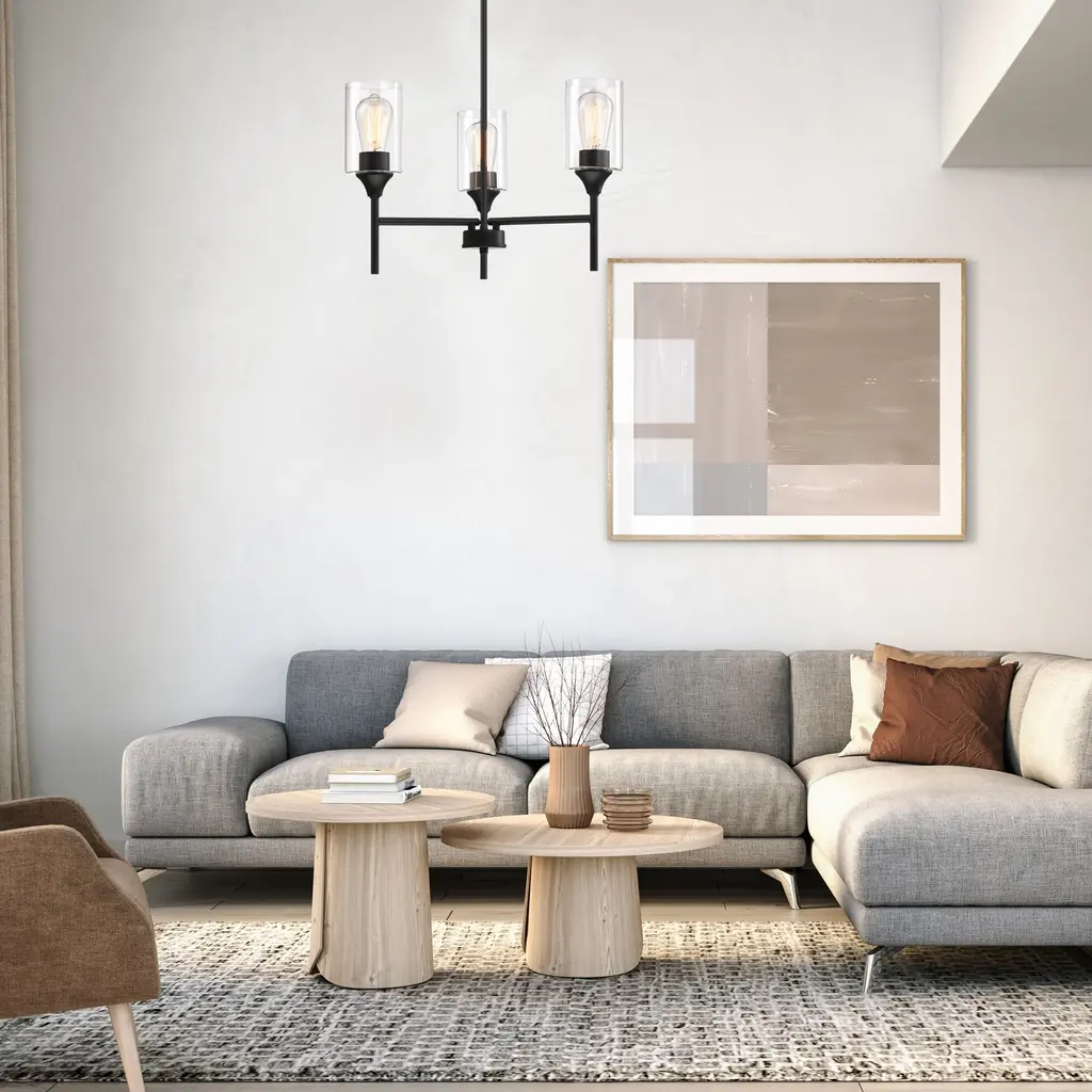 Brighten up your home with the elegant Hukoro 3-Light Chandelier. This fixture boasts a minimalist metal shade, perfect for a variety of rooms including the dining room, foyer, living room, bedroom, entrance, hallway, and kitchen. Utilizing 3 E26 bulbs, the chandelier's matte black finish and clear glass provide a warm modern-style glow. Glass shades with a matte black finish add an elegant touch, ideal for decorating entryways, hallways, dining rooms, foyers, kitchens, living rooms, and meeting rooms. Hang this beautifully crafted chandelier in any indoor space, perfect for a breakfast nook, above a kitchen island, over a dining room table, or in high-ceiling areas like foyers or entryways. Includes all mounting hardware and easy-to-follow assembly instructions for a hassle-free installation. 90 Days Limited Warranty Bulb Specification: Requires 3x E26/medium base, 60-Watt bulb; A or ST type bulbs are suitable (bulb not included). cETLus Listed: We guarantee the product is safe and fully functional to our consumer Plate Size:W:4.92"X H:0.87"