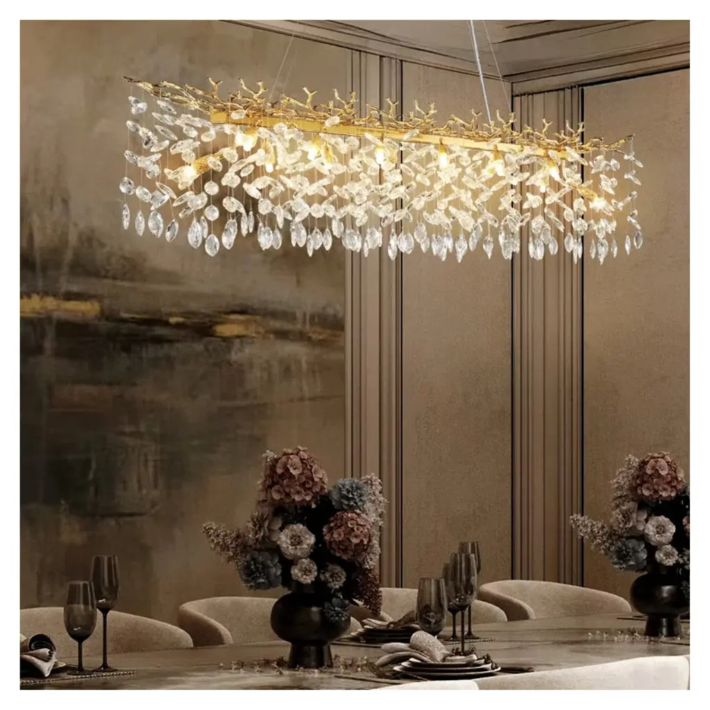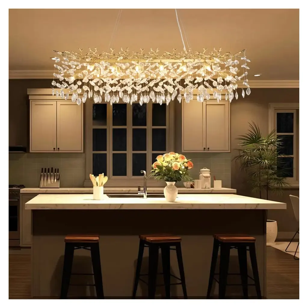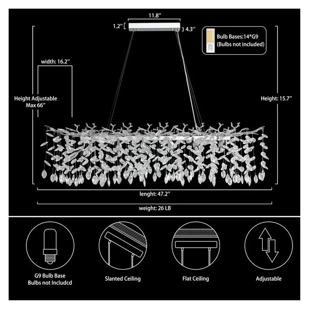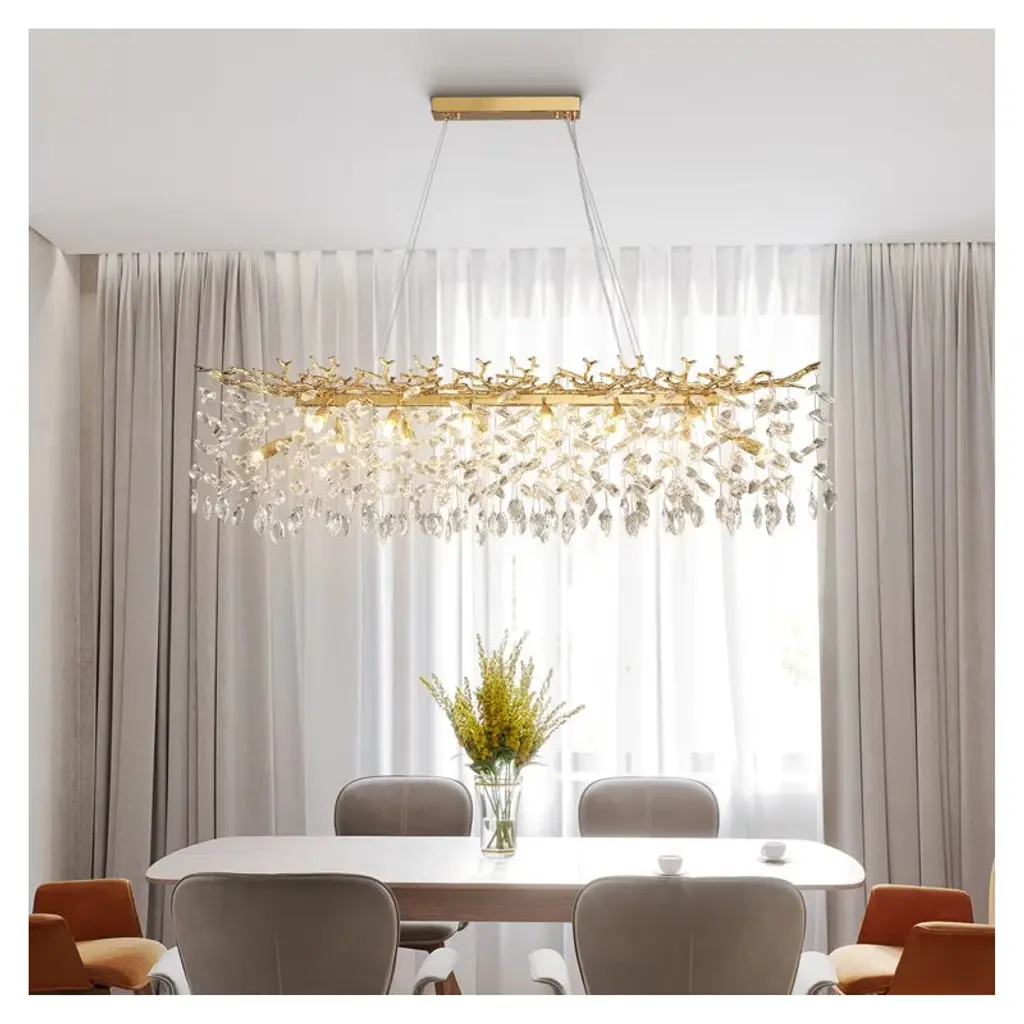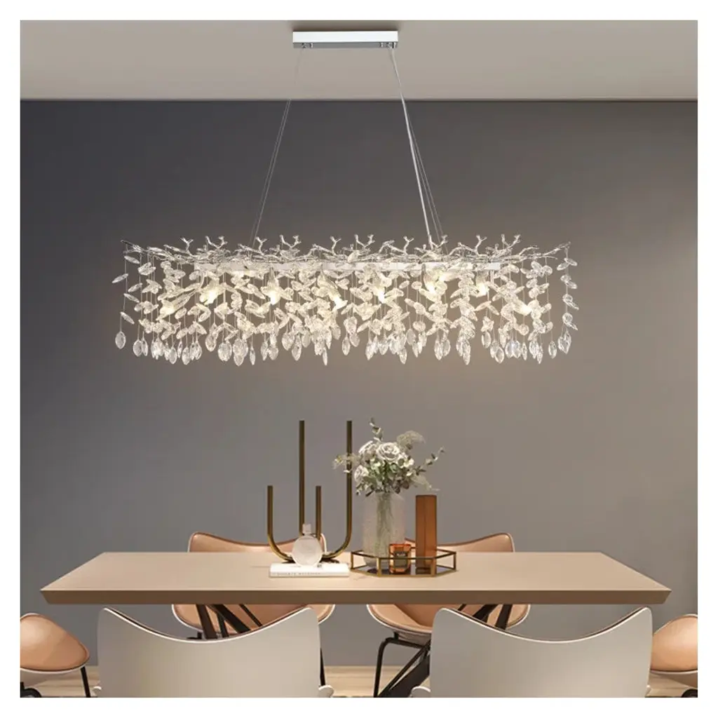 This is a luxurious and elegant Rectangular Crystal Pendant Chandelier, designed to add a touch of sophistication to any room. The crystal lights for dining room features an array of sparkling crystals that cascade down in a mesmerizing display, creating a stunning focal point above your dining table. The kitchen island chandelier's design is modern yet timeless, with its sleek lines and clean aesthetic. The crystal chandelier lighting is perfect for both traditional and contemporary interiors, adding a touch of glamour and elegance to any space. Whether you're looking for a statement piece or simply want to enhance the ambiance of your dining area, this rectangular crystal chandelier is sure to impress. Its warm glow will create a cozy atmosphere, making it the ideal choice for intimate dinners or large gatherings. Upgrade your dining room with this exquisite large crystal chandelier and transform your space into a truly magical environment.