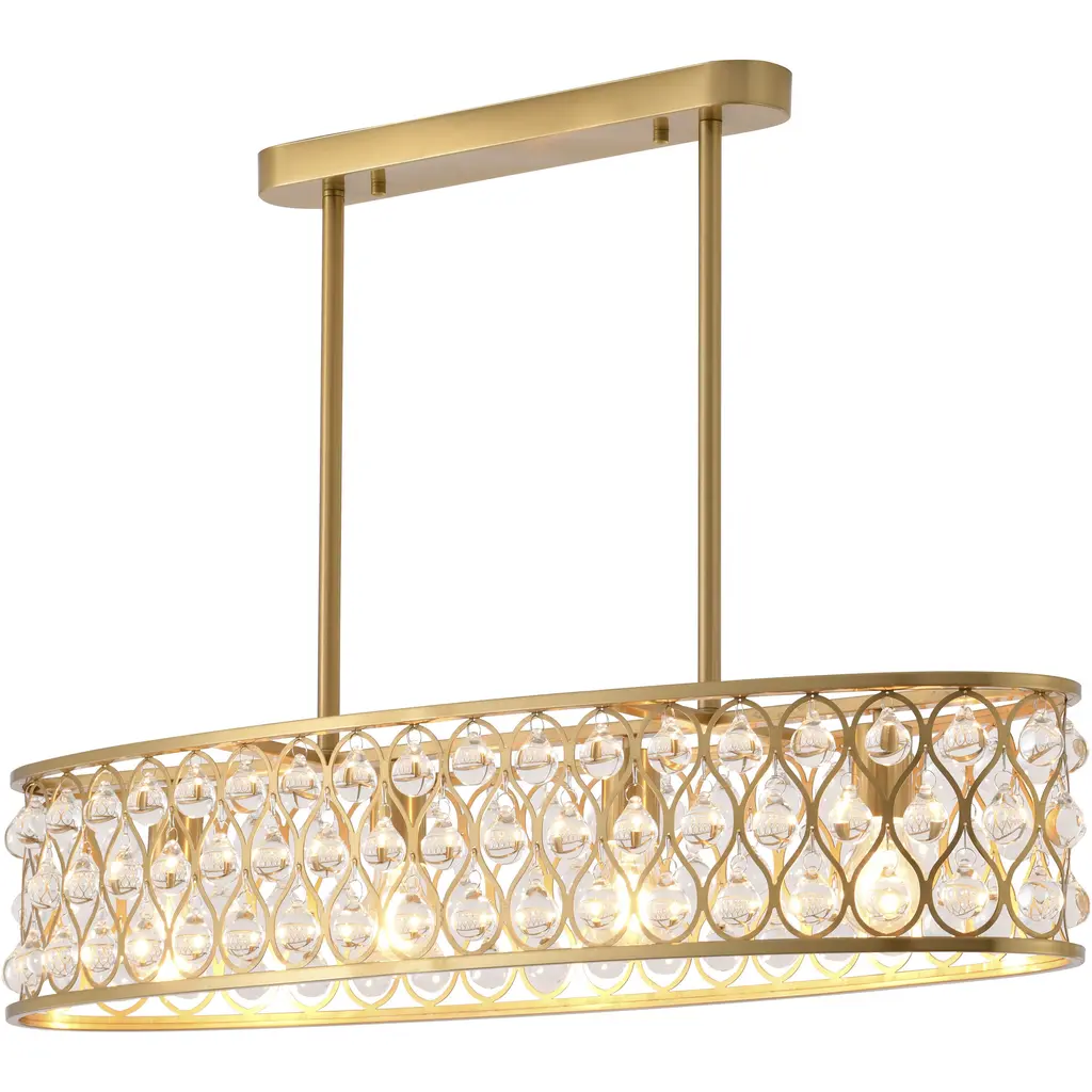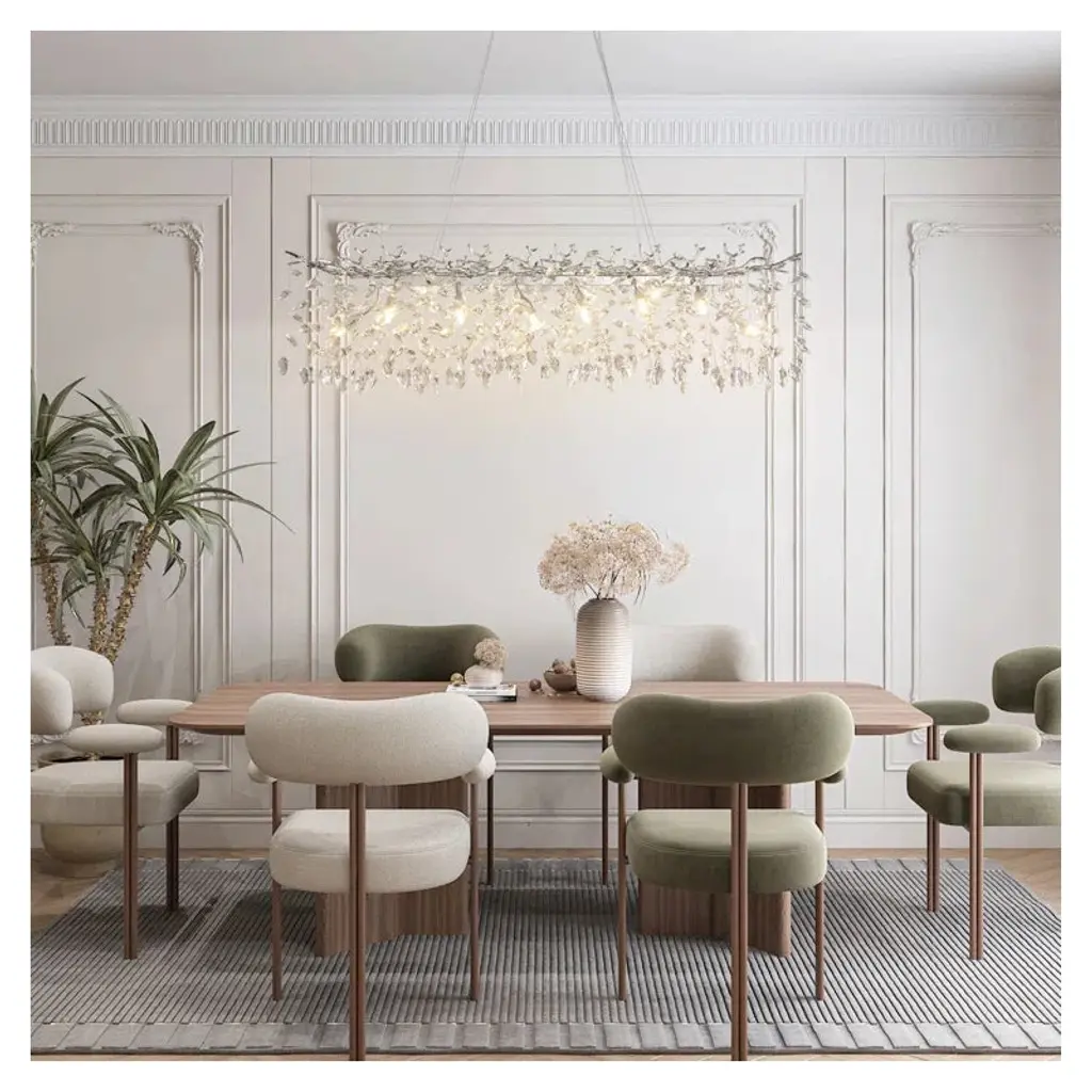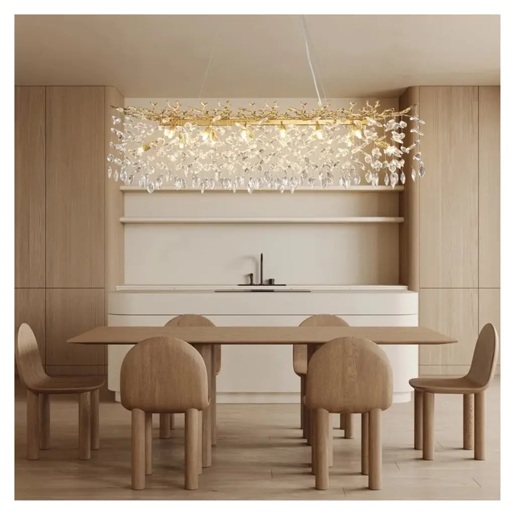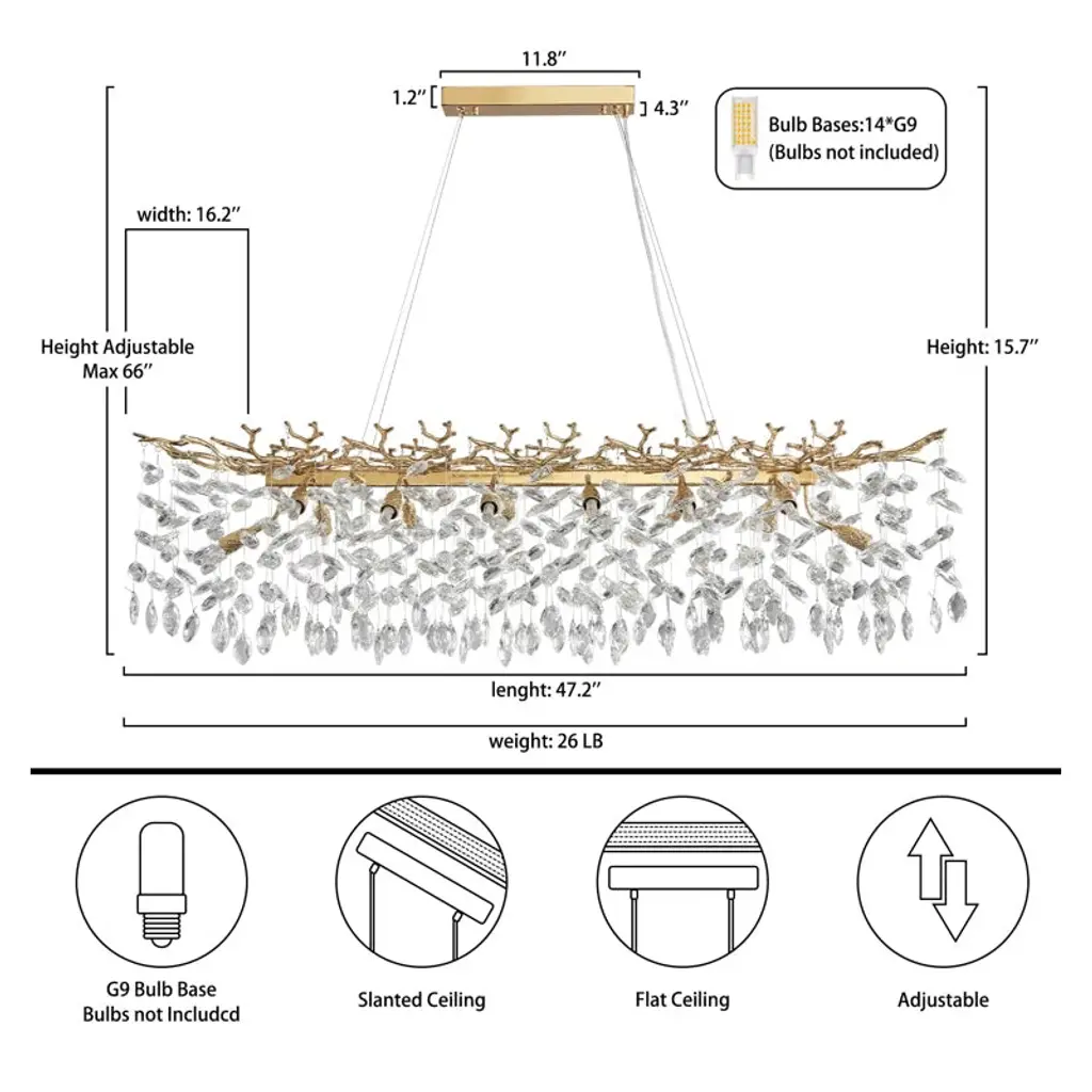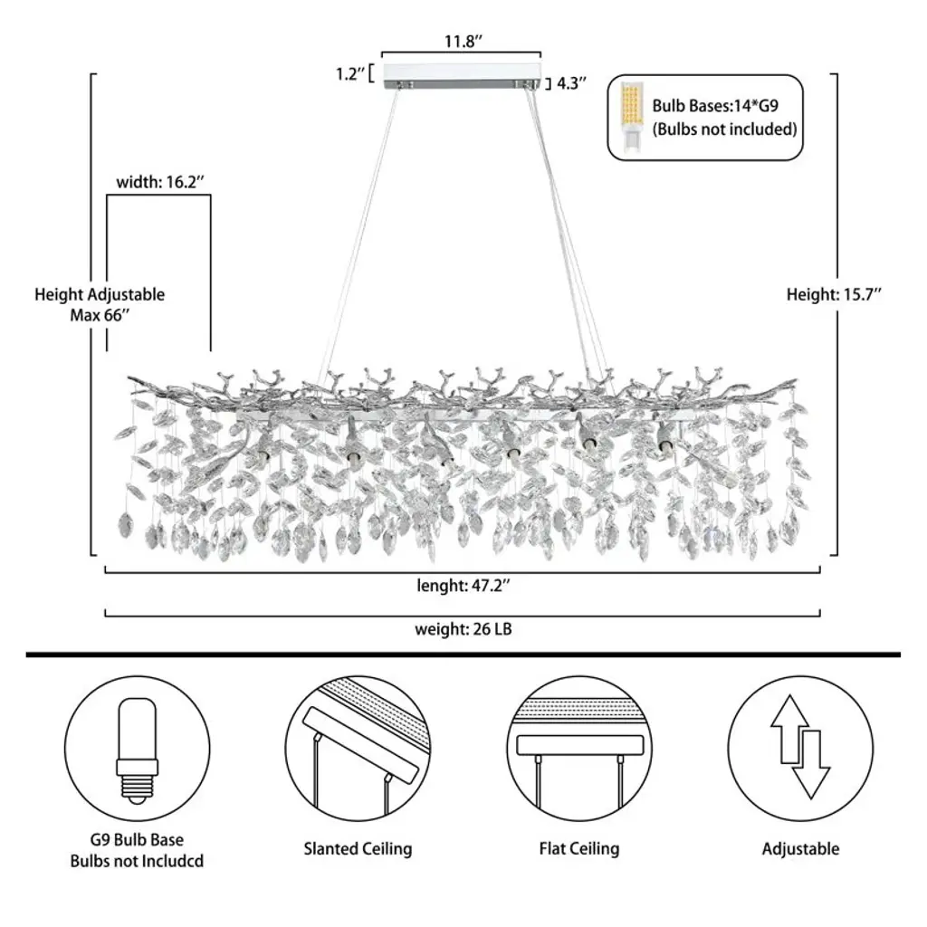 This is a luxurious and elegant Rectangular Crystal Pendant Chandelier, designed to add a touch of sophistication to any room. The crystal lights for dining room features an array of sparkling crystals that cascade down in a mesmerizing display, creating a stunning focal point above your dining table. The kitchen island chandelier's design is modern yet timeless, with its sleek lines and clean aesthetic. The crystal chandelier lighting is perfect for both traditional and contemporary interiors, adding a touch of glamour and elegance to any space. Whether you're looking for a statement piece or simply want to enhance the ambiance of your dining area, this rectangular crystal chandelier is sure to impress. Its warm glow will create a cozy atmosphere, making it the ideal choice for intimate dinners or large gatherings. Upgrade your dining room with this exquisite large crystal chandelier and transform your space into a truly magical environment.