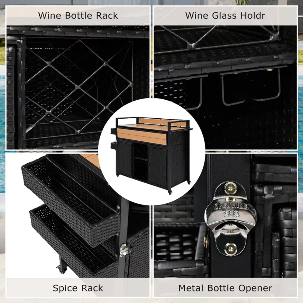 Product Dimension(Overall): 52.8 x 28.3 x 41.5 inches Product Weight: 87.3 LBS Package Dimension: 44 x 24.3 x 13.7 inches Package Weight: 99.2 LBS Tabletop Weight Capacity: 400 LBS Drop Leaf Weight Capacity: 100 LBS Each Shelf Weight Capacity: 75LBS Material: Wicker + Poly Wood + Powder-coated Steel Frame Outdoor Product Care Notice: To remove dirt and debris, vacuum with a dust-brush attachment or use a dry paintbrush. Clean with a mild soap solution, scrub with a sponge, rinse with cold water, and dry completely. When outdoor furniture is not in use, we recommend covering all the furniture to protect it against the elements. Assembly Notice: It is important to align the screw holes accurately and tighten the screws only after ensuring that all holes are properly aligned and secured. Removable Wine Rack: Wicker wrapped wine racks are available for you to place your beloved variety of wines. Horizontal and secure, you don't have to worry about tipping or falling. When you don't need it, you can take it out and use it as a storage cabinet.