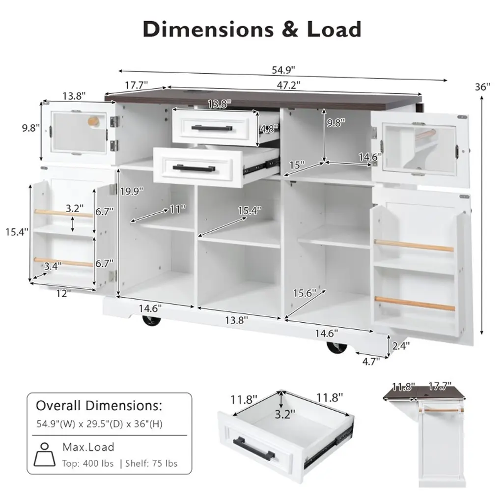 Embrace the enduring charm of traditional farmhouse design while incorporating contemporary trends. This rolling kitchen island features classic double-cross barn doors elegantly complemented by modern transparent glass accents, seamlessly merging rustic allure with sophisticated elegance to enhance your kitchen and dining decor.