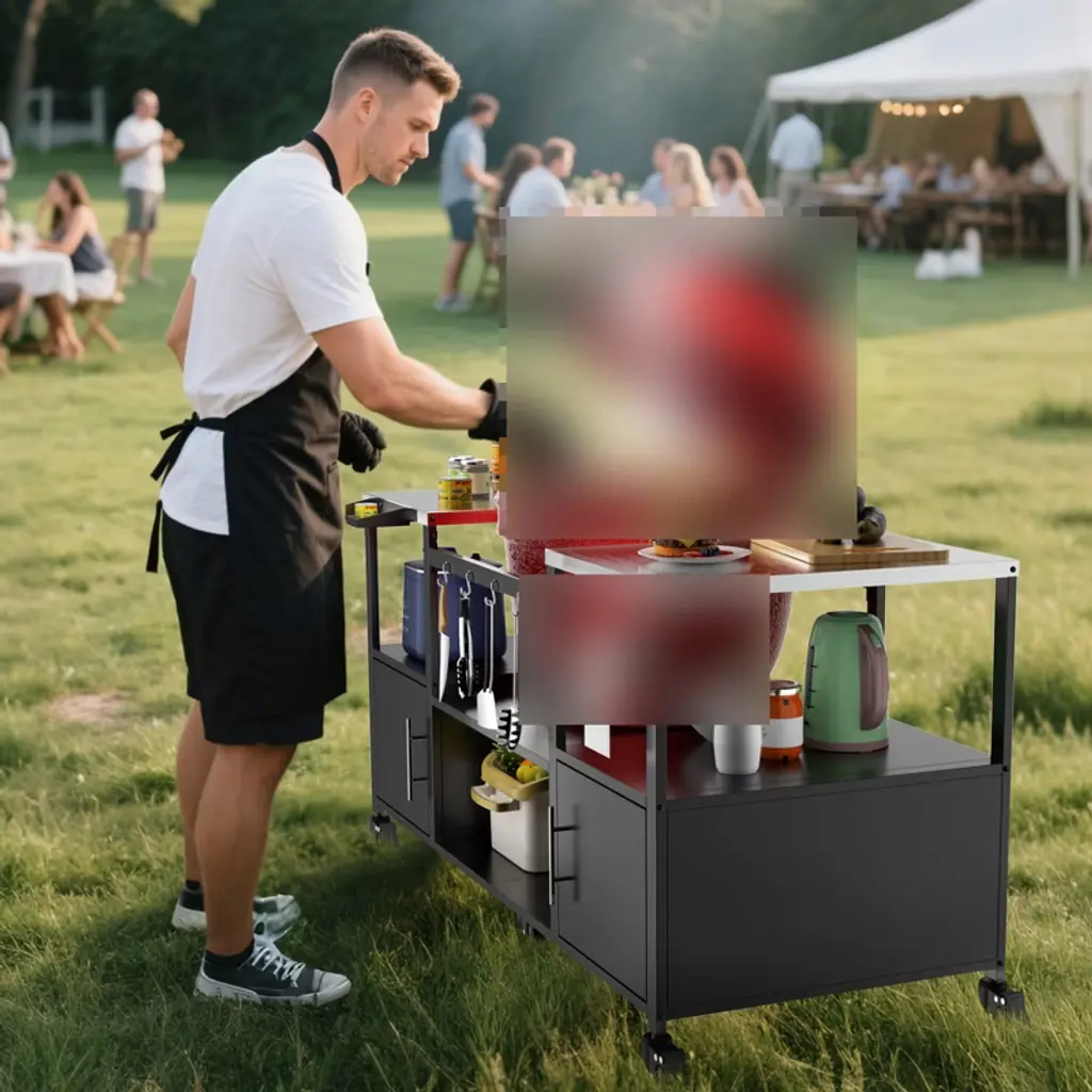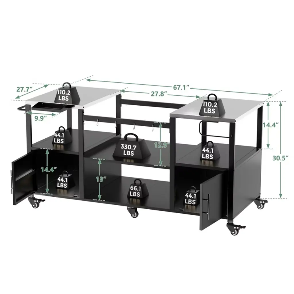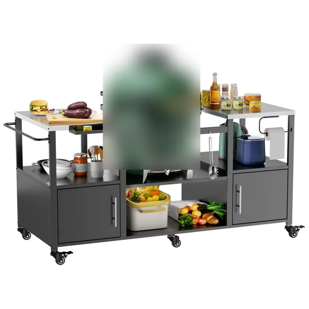 67.1"w Outdoor Grill Cart, Rolling Kitchen Island On Wheels With Storage, Metal Patio Bar Cart With Lockable Wheels For Backyard Garden Poolside