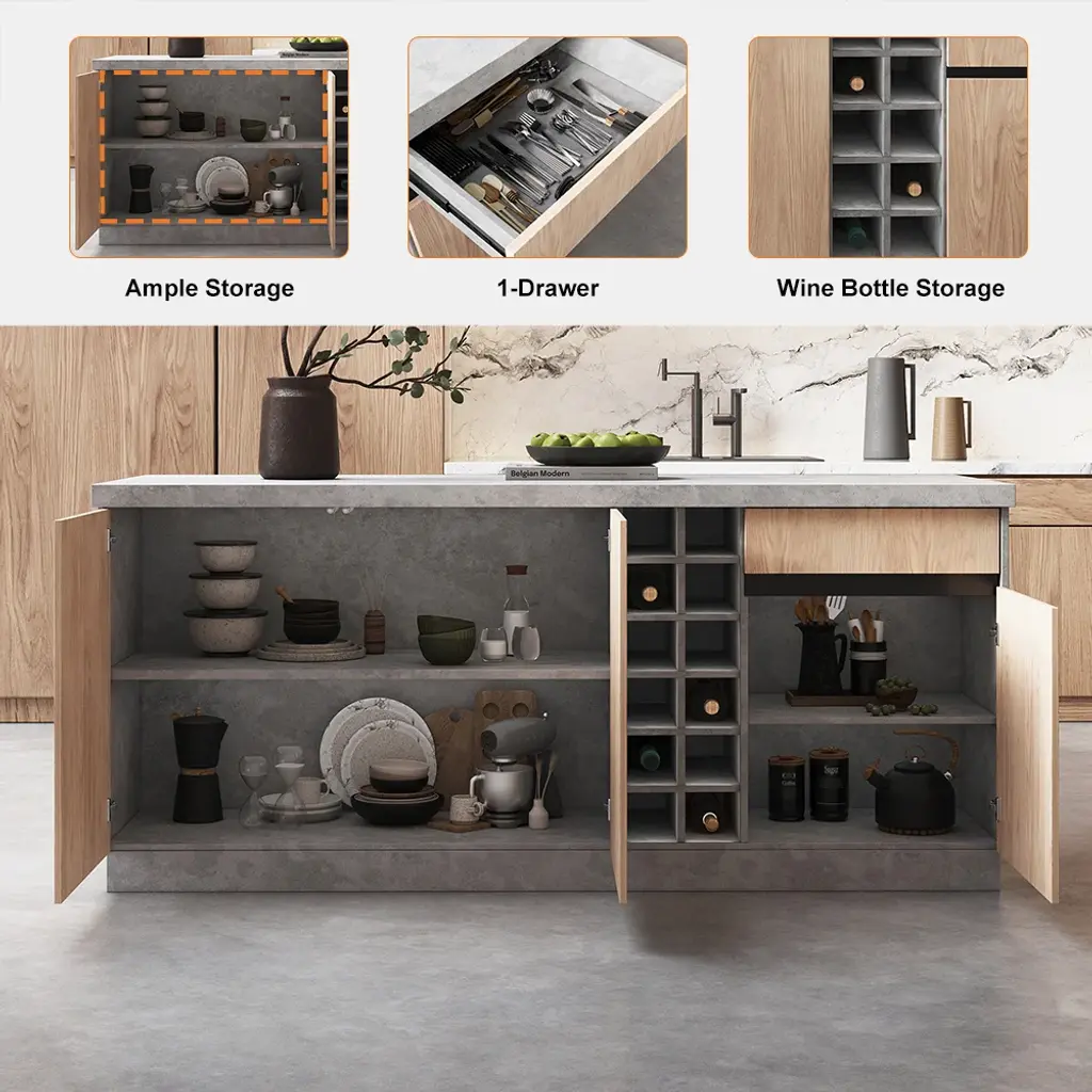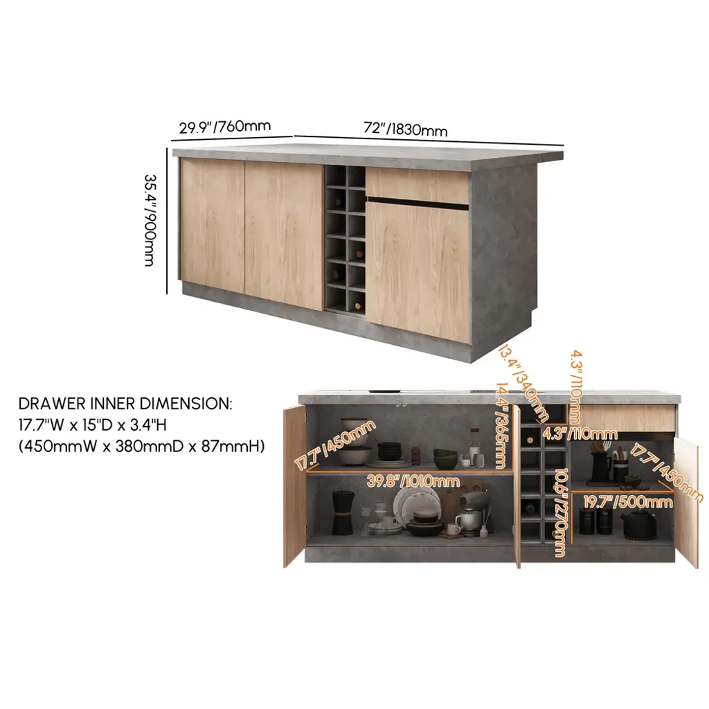 This kitchen island harmoniously merges modern functionality with rustic charm. The gray wood top and natural finish add warmth and a touch of earthiness to your space. A roomy interior provides an open shelf and 1 drawer and 3 doors for ample storage. This kitchen island with its sleek, rectangular design is what you need if you pursue a totally modern kitchen or dining area to make sure convenience and style blend under one roof.