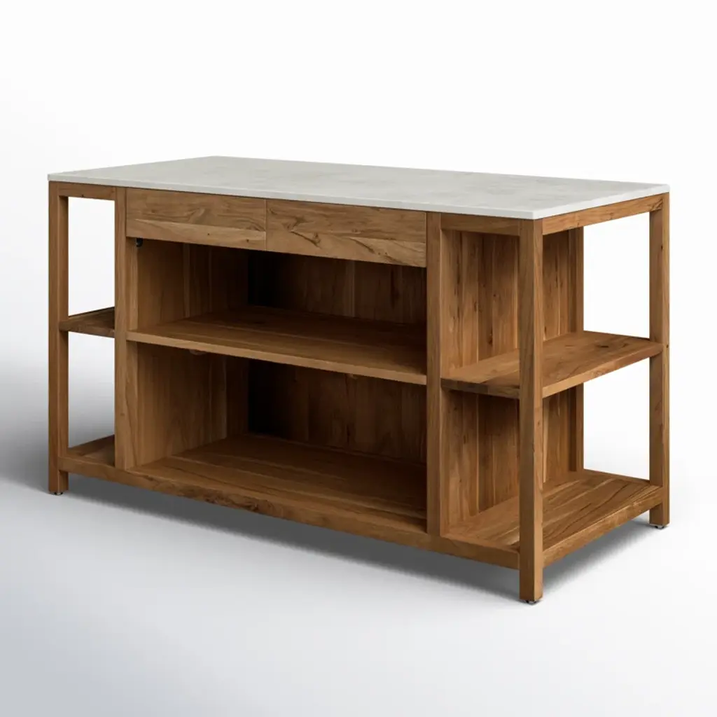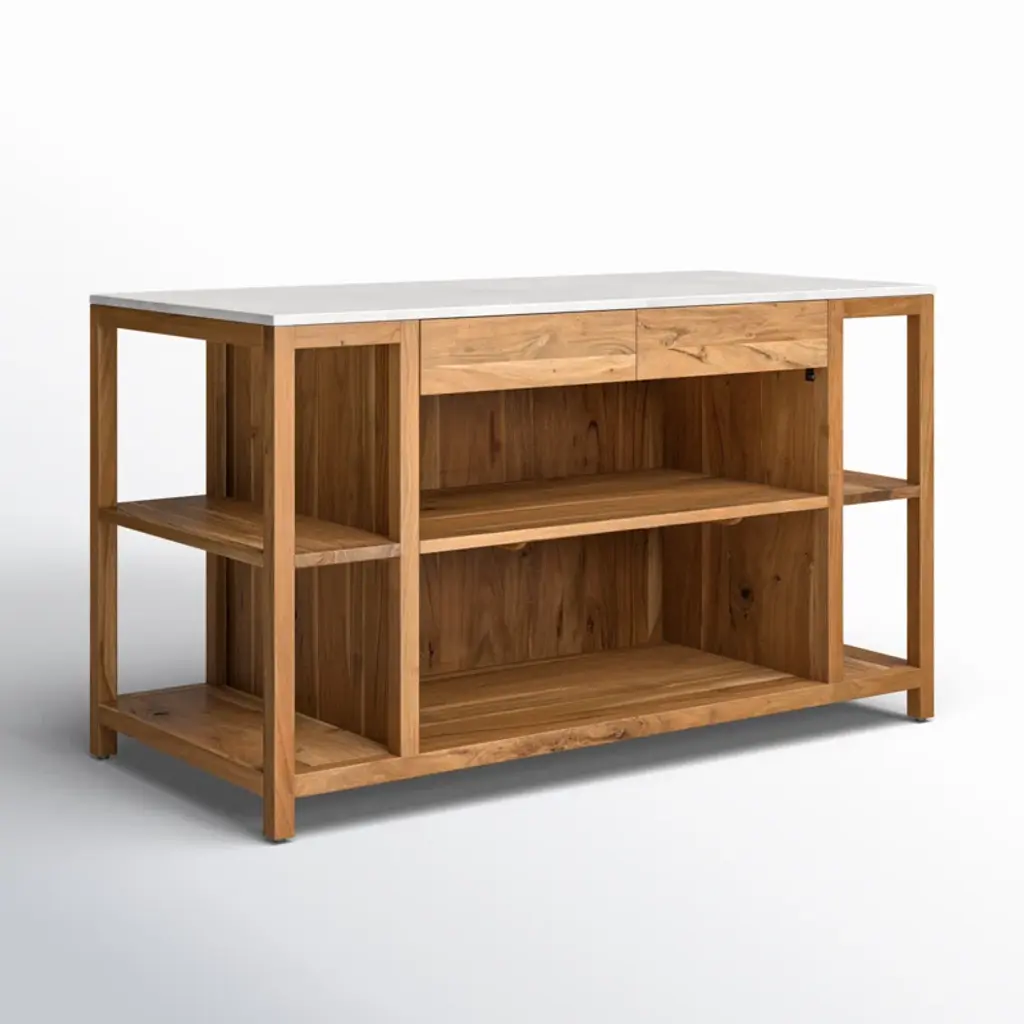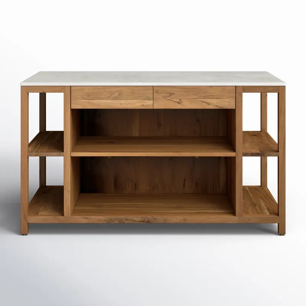 Upgrade your culinary space with our contemporary kitchen island. Designed with a sophisticated marble countertop that combines both elegance and durability, this island offers generous storage solutions. It includes two spacious drawers and six exterior shelves, providing ample room for all your kitchen essentials. The frame, crafted from premium smoked acacia wood and finished in a crisp white, adds a touch of modernity and style to your home. It's not just about functionality; this kitchen island is also a social hub, comfortably seating a crowd.