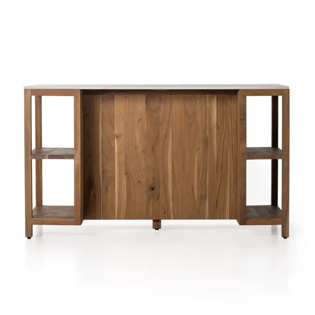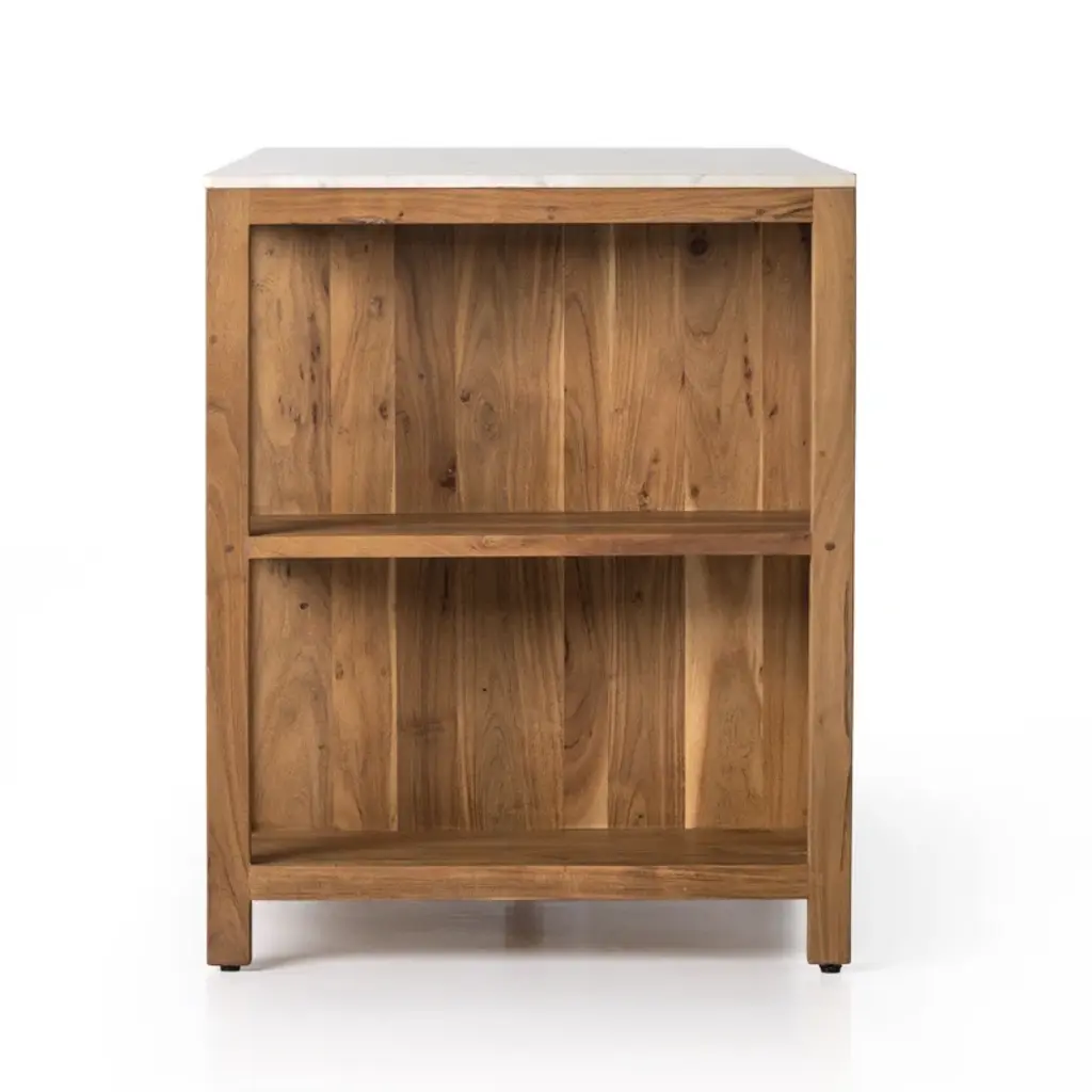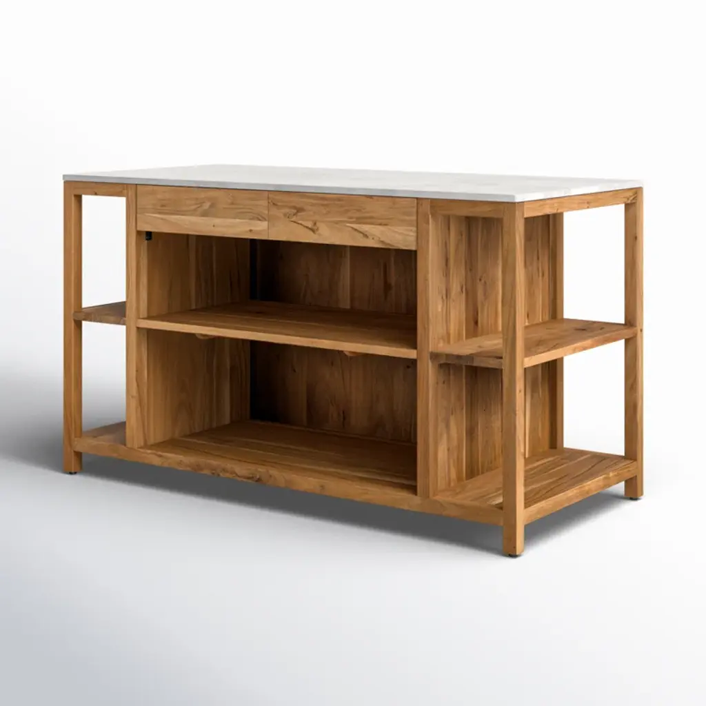 Upgrade your culinary space with our contemporary kitchen island. Designed with a sophisticated marble countertop that combines both elegance and durability, this island offers generous storage solutions. It includes two spacious drawers and six exterior shelves, providing ample room for all your kitchen essentials. The frame, crafted from premium smoked acacia wood and finished in a crisp white, adds a touch of modernity and style to your home. It's not just about functionality; this kitchen island is also a social hub, comfortably seating a crowd.