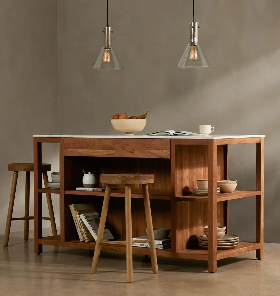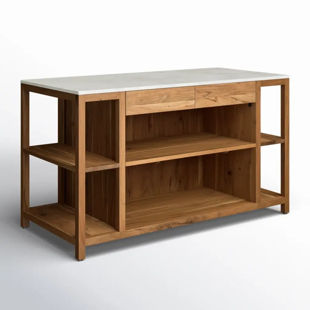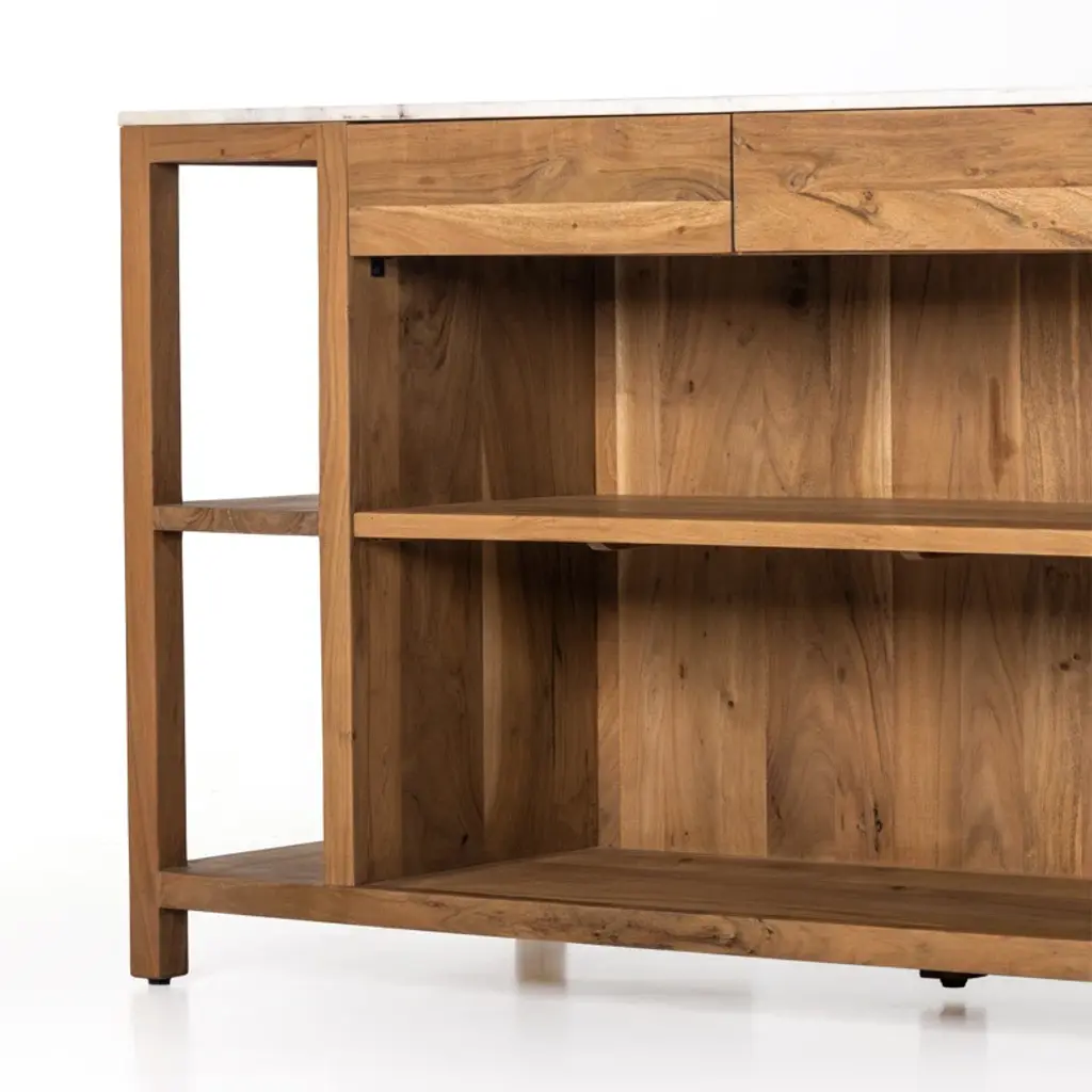 Create space and style with a kitchen island made from smoked acacia and solid white marble. Roomy open shelving offers ample options for storage and display, while dual drawers keep frequently used items within reach.