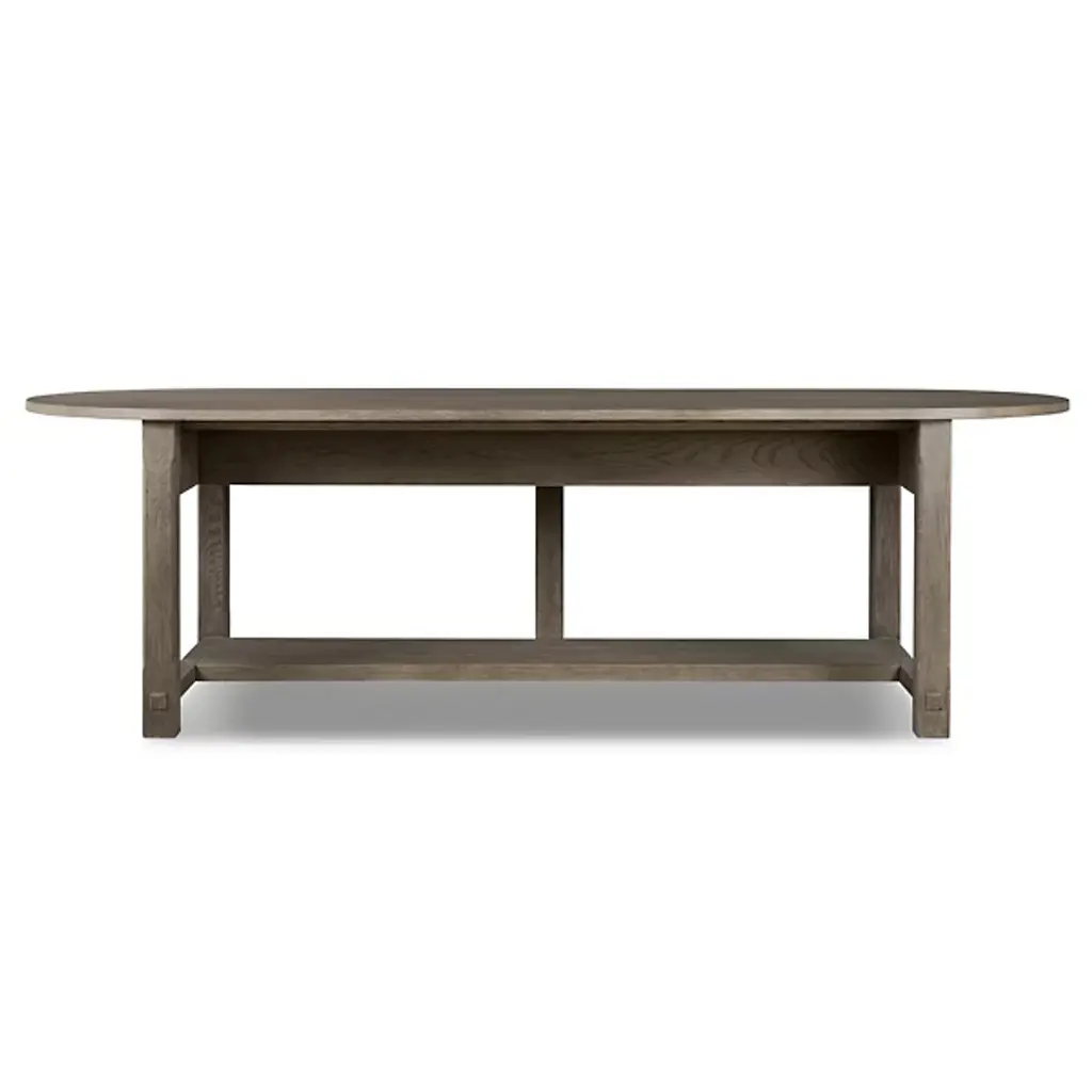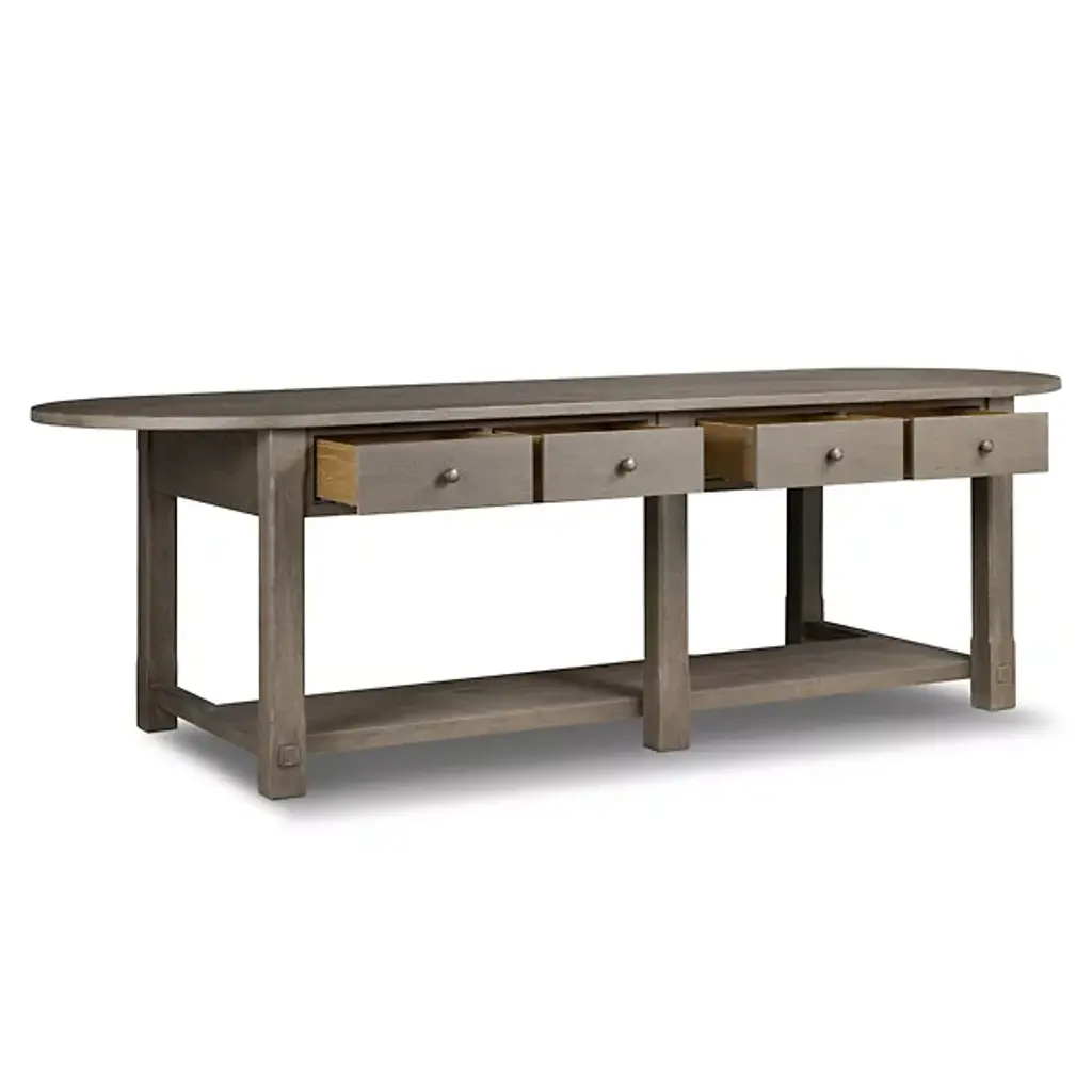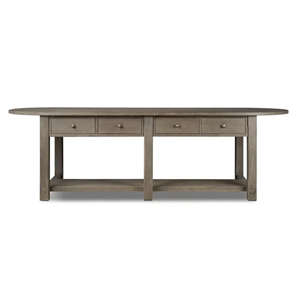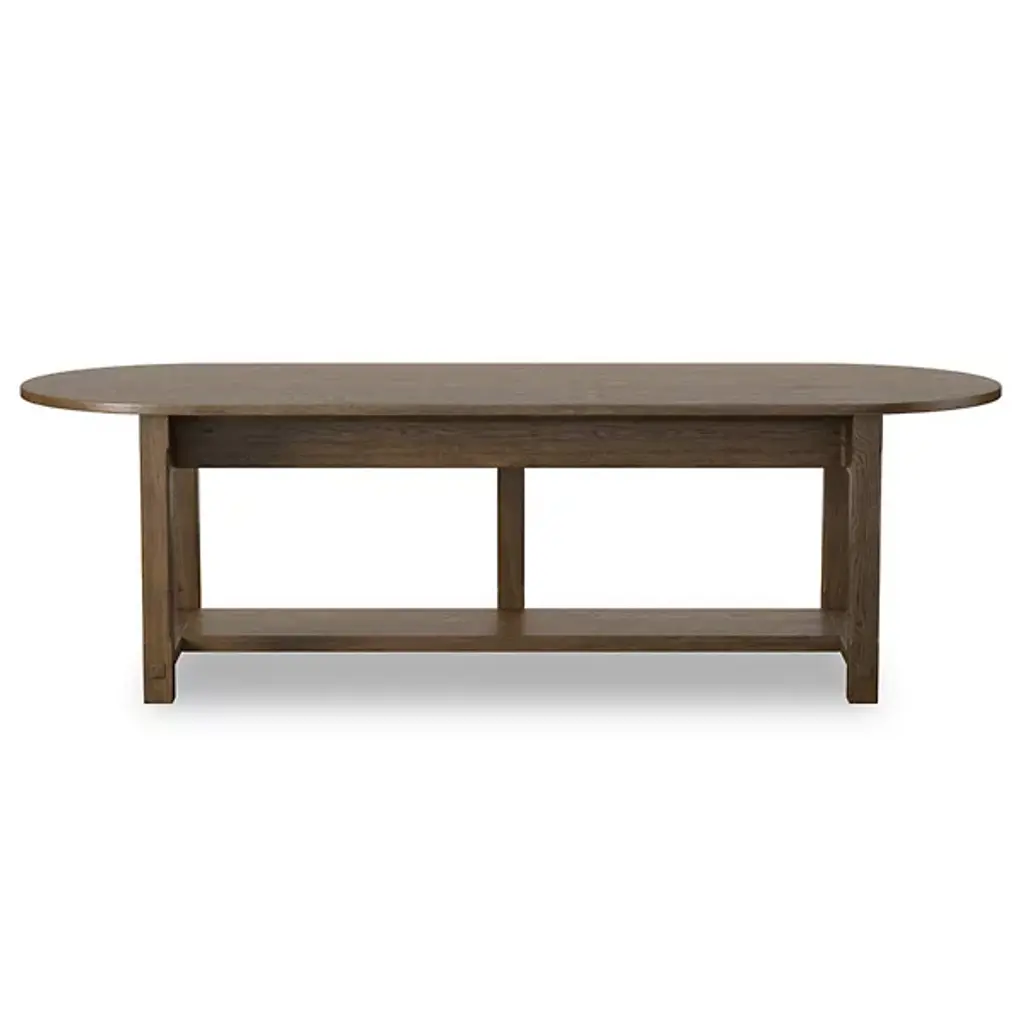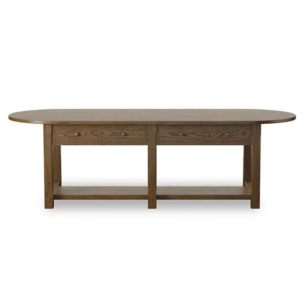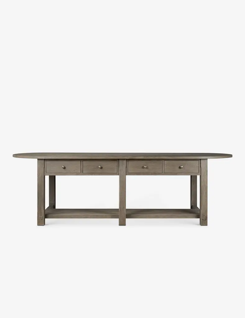 The Amber Lewis x Four Hands Elise Kitchen Island Table from Four Hands showcases a contemporary design that seamlessly blends elegance with solid functionality. A balanced assembly of oak veneer, brass, and solid wood, the table features a wide oval top that overlaps a sturdy understructure of solid wood and veneer. The curved sides of the tabletop create a striking contrast with the angular elements, while the subdued, rounded drawer pulls in rich brass add a touch of sophistication. With its vibrant texture and modern aesthetic, this kitchen island table embodies contemporary style, making it a versatile and memorable addition that doesn't overpower its surroundings.