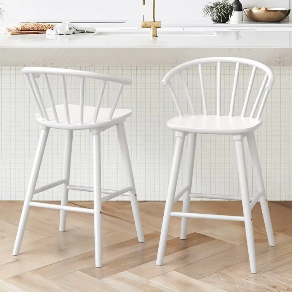 Comfortable Circle Backrest: Designed with a semi-circular shape, the backrest conforms to the natural curve of the spine, providing excellent support and comfort during extended periods of sitting; this ergonomic design encourages natural arm resting positions and helps to minimize fatigue Stylish and Versatile: Graceful curves enhance the elegance of any space; these bar stools complement both modern and mid-century decor styles; ideal for dining rooms, living rooms, entertainment areas, lounges, cafes, and bars Sturdy and Stable: The frame and legs are constructed from solid rubberwood for durability; supports up to 350 pounds; thickened back flare legs enhance stability and safety for all users; floor protectors prevent scratches on flooring Simple Assembly: Requires only three steps for installation; can be completed in approximately five minutes; support is available around the clock to assist with any difficulties; contact us via email for prompt assistance and solutions.