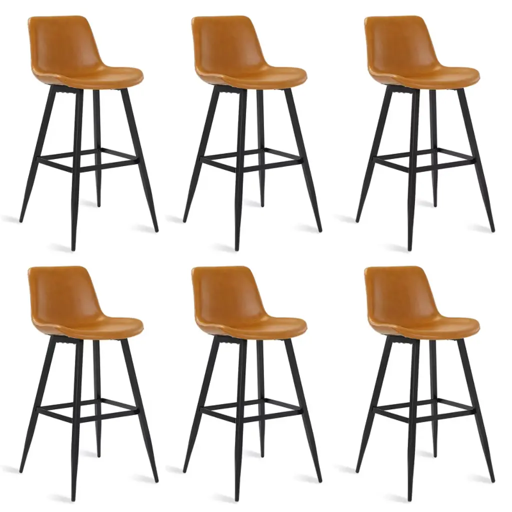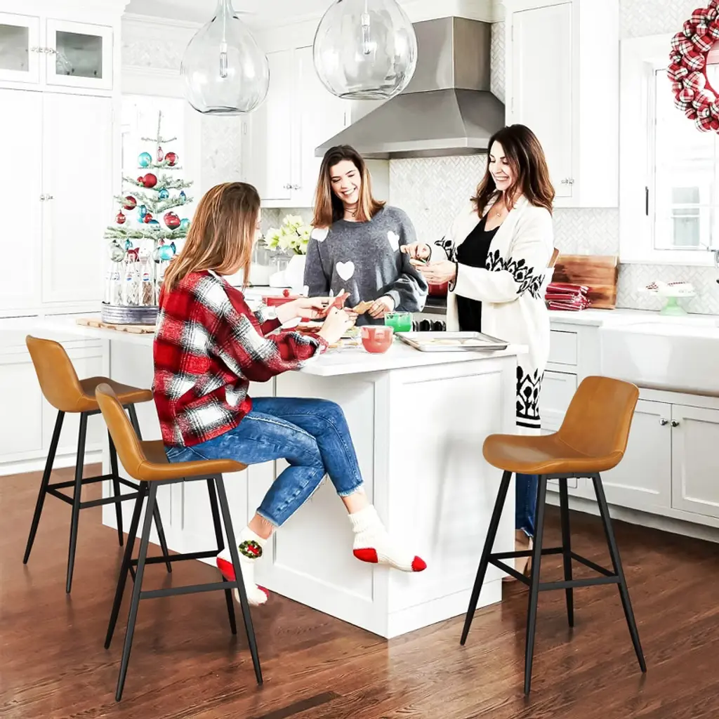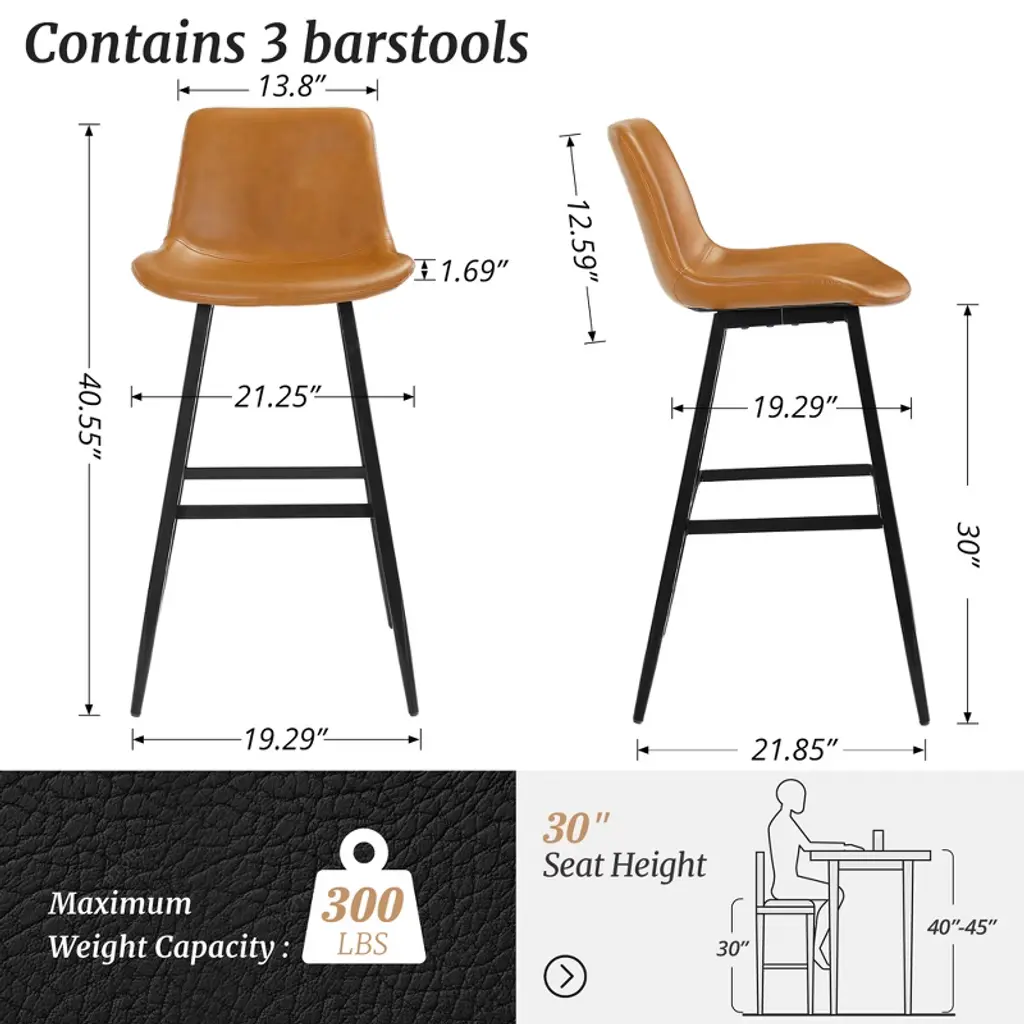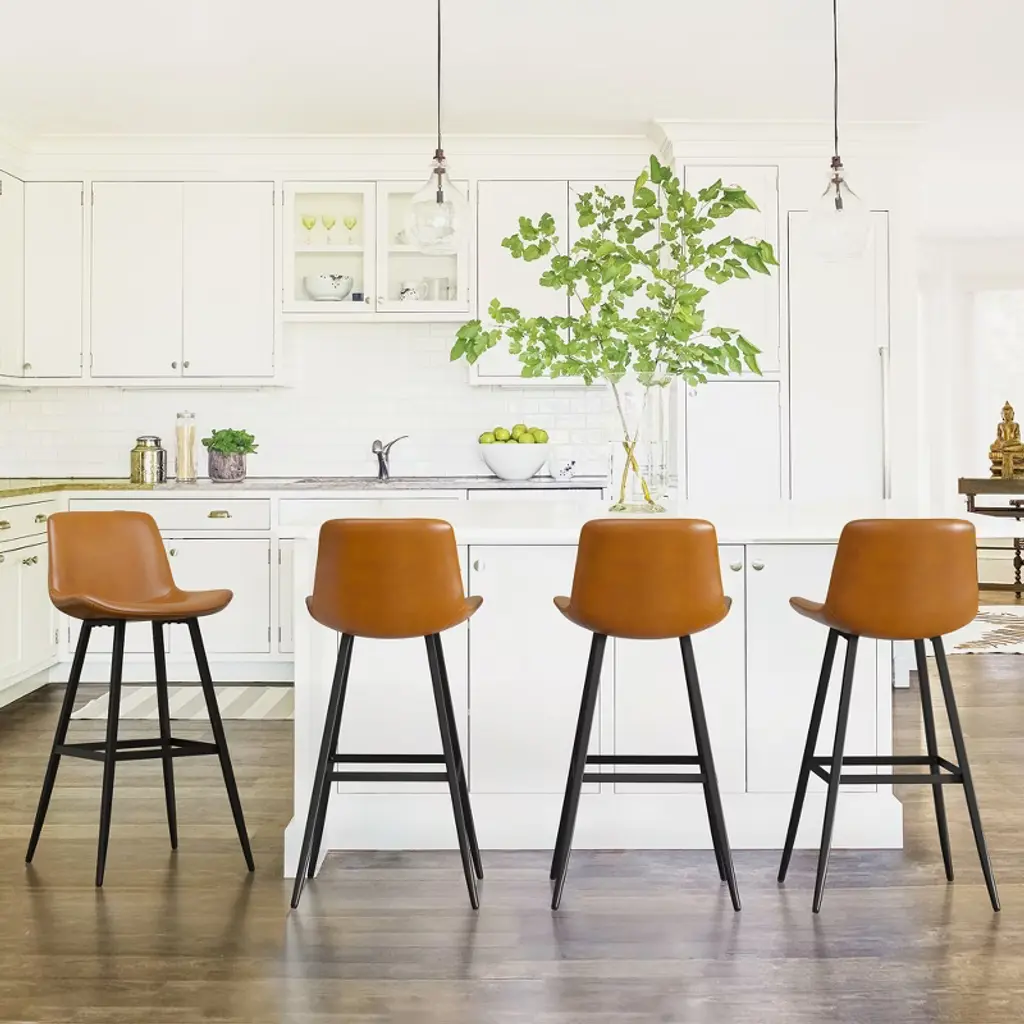 1. Comfortable Ergonomic Design Wide and Soft Seat: The stool features a generously padded seat, providing ample comfort for extended sitting periods. Ergonomic Backrest: The curved backrest is designed to support the natural curve of your back, contributing to overall comfort and better posture. Sturdy and Supportive Legs: The thick leg structure ensures a stable seating experience, making the stool reliable and sturdy for various activities at the bar or counter. 2. Easy Assembly Straightforward Setup: The stool is designed for simple assembly, making it hassle-free to put together. Tools and Instructions Included: Everything you need, including detailed instructions and necessary tools, is provided, ensuring a smooth setup process. Durable Construction: The metal frame supports up to 300 lbs, ensuring the stool can accommodate a wide range of users. 3. Upholstered Faux Leather Material Easy to Clean: The faux leather upholstery is not only stylish but also practical. Spills and stains can be wiped away with a damp cloth, keeping the stool looking clean and fresh. Firm and Comfortable Cushioning: The large, shell-shaped seat and fine stitching offer both firmness and comfort, ensuring the cushion retains its shape and provides a supportive seat. 4. Mid-Century Modern Style Minimalist Design: The stools feature a clean, modern aesthetic that blends well with various types of interior decor, particularly in contemporary or mid-century modern spaces. Coordinated Look: This set of four stools enhances the overall coordination of your space, offering both functionality and style. Purposeful Design: Every element is carefully considered to contribute to both the visual appeal and practical use of the stools. 6. Customer Support Comprehensive Assistance: The company offers helpful customer support for any inquiries, whether it's for installation assistance or replacement parts. Prompt Response: Customers can expect quick and effective support if needed, ensuring a positive experience with the product. Ideal For: Kitchen Islands or Bar Counters: Perfect for seating at your kitchen island or bar counter, offering comfort and style. Modern and Contemporary Spaces: The minimalist design and faux leather material make these stools a great fit for modern, mid-century, or even industrial-themed interiors.