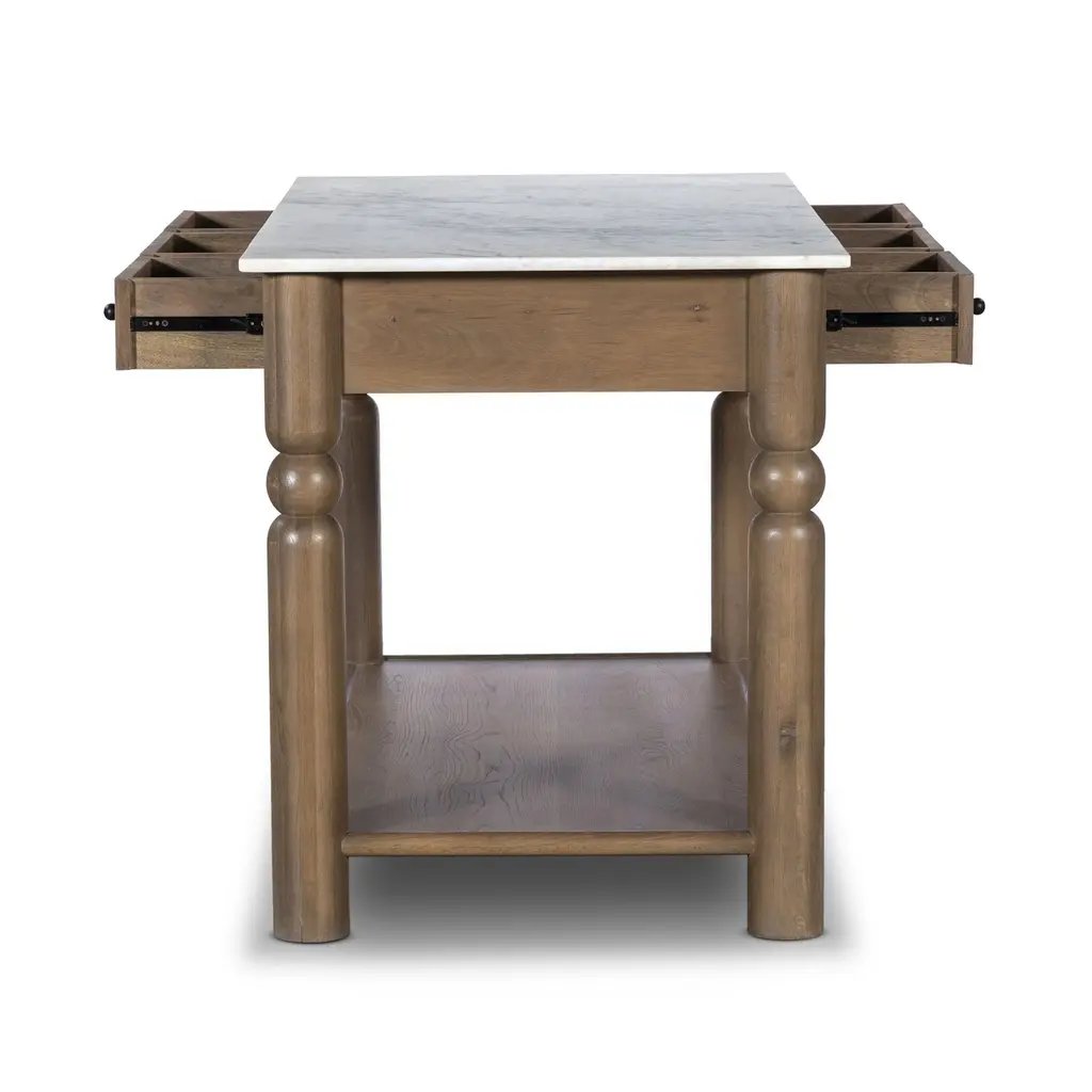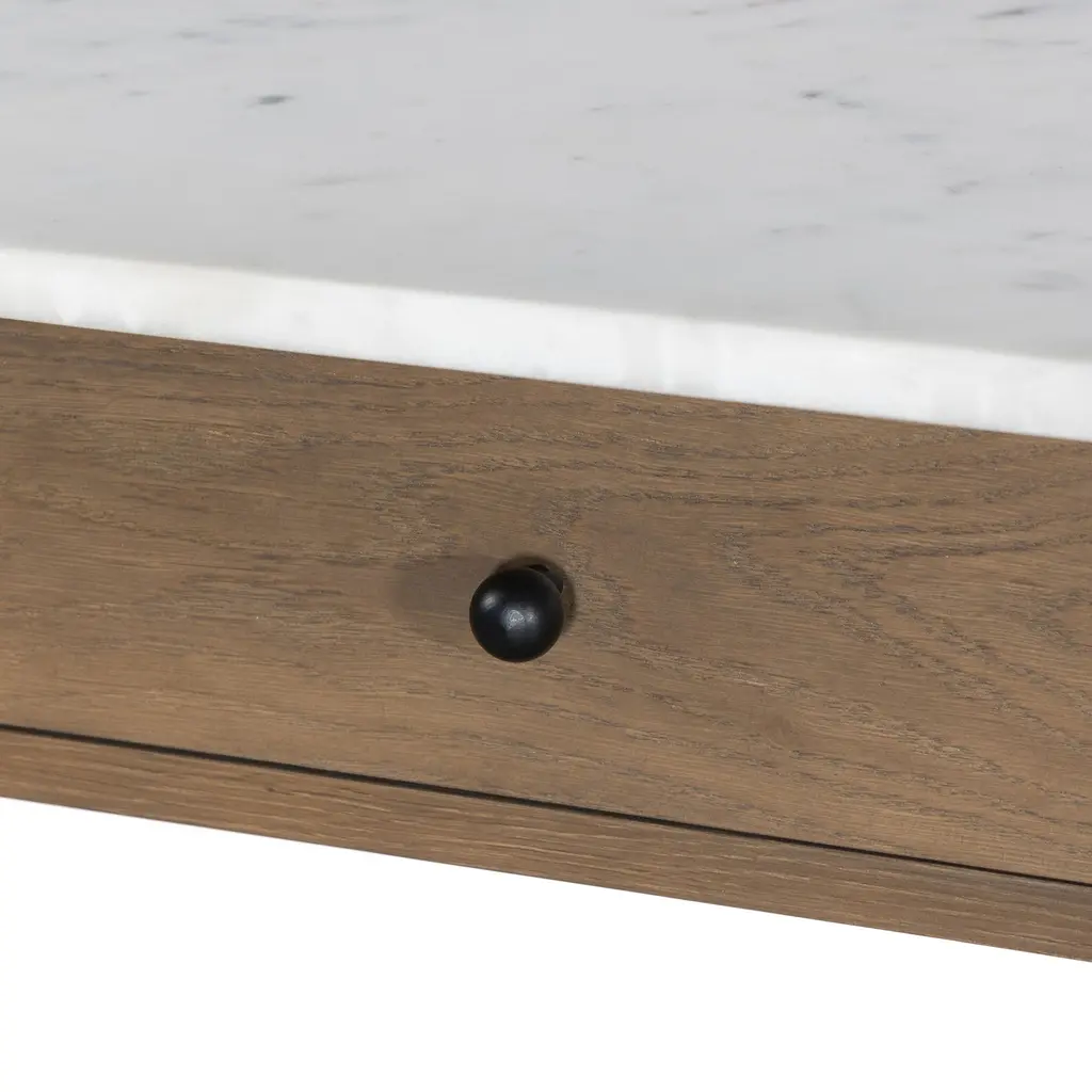 Sleek white marble countertop offers both beauty and durability. Equipped with drawers on each side and a spacious shelf to keep essentials organized. Rich, warm wood tones create a sophisticated and inviting presence. Antique-inspired design, reimagined with a modern twist.