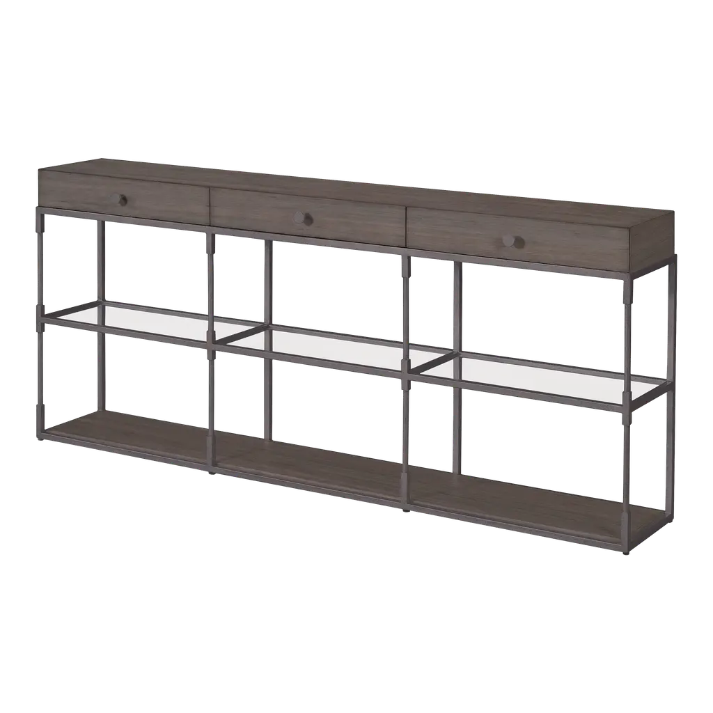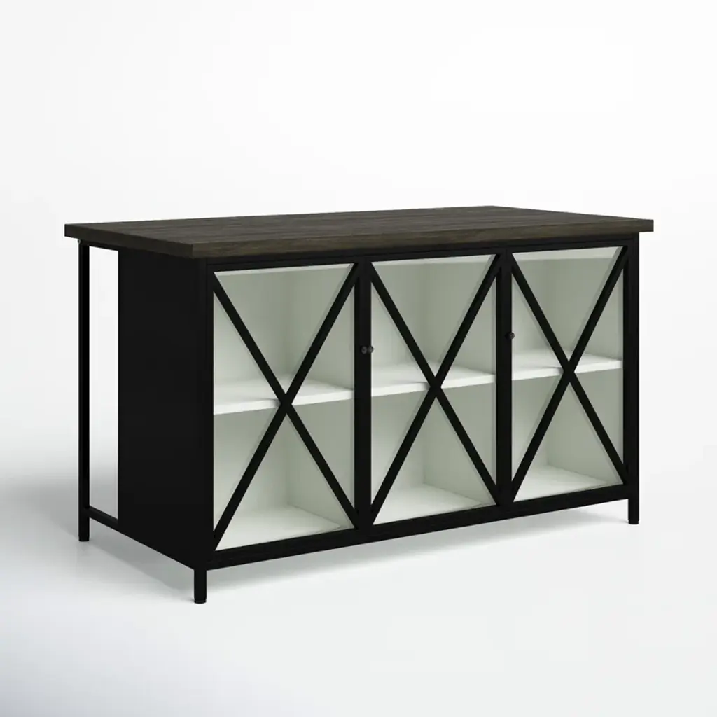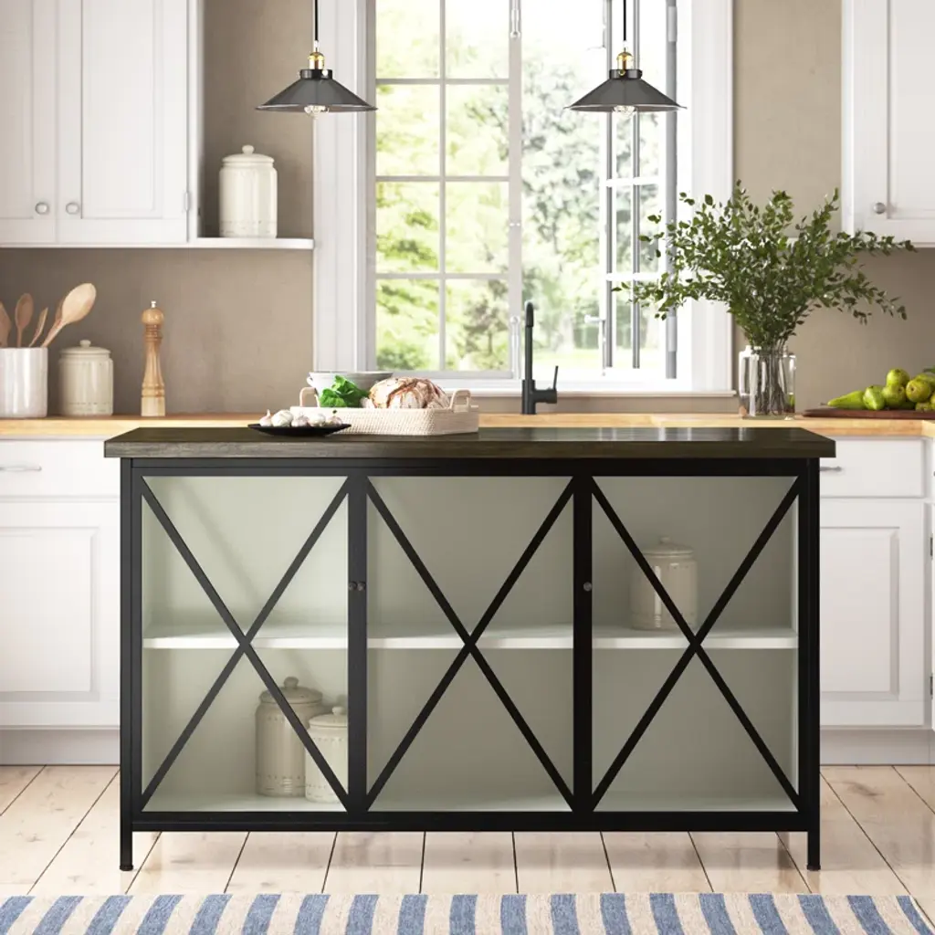 A kitchen island composed of wood, metal, and glass, featuring see through storage display.