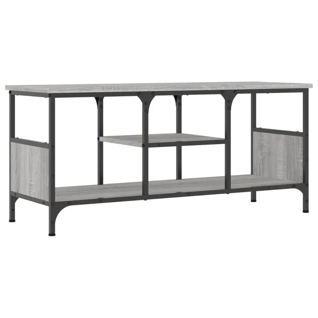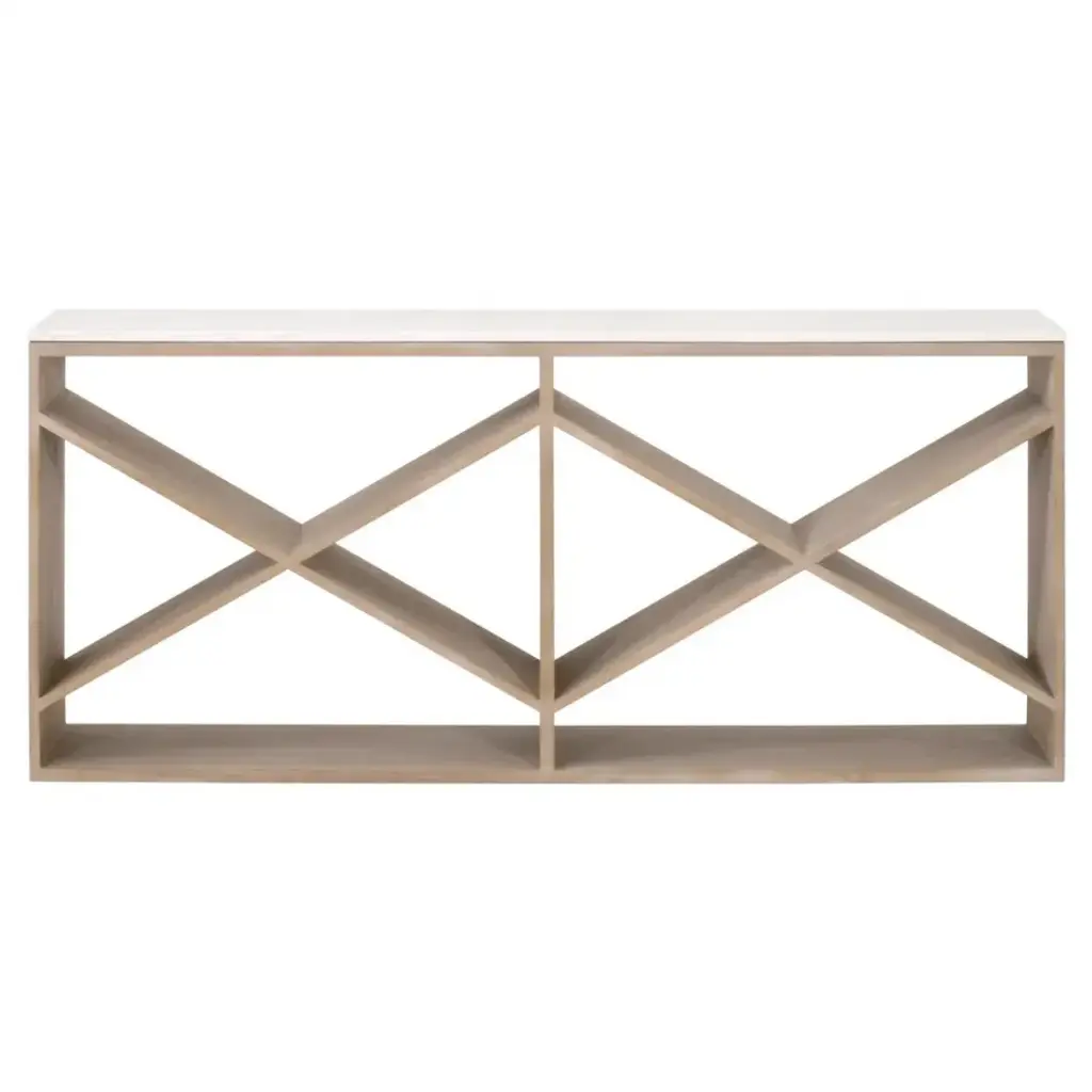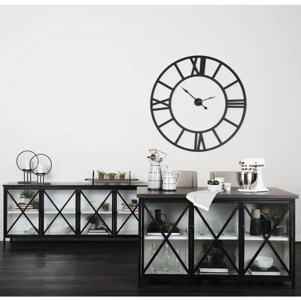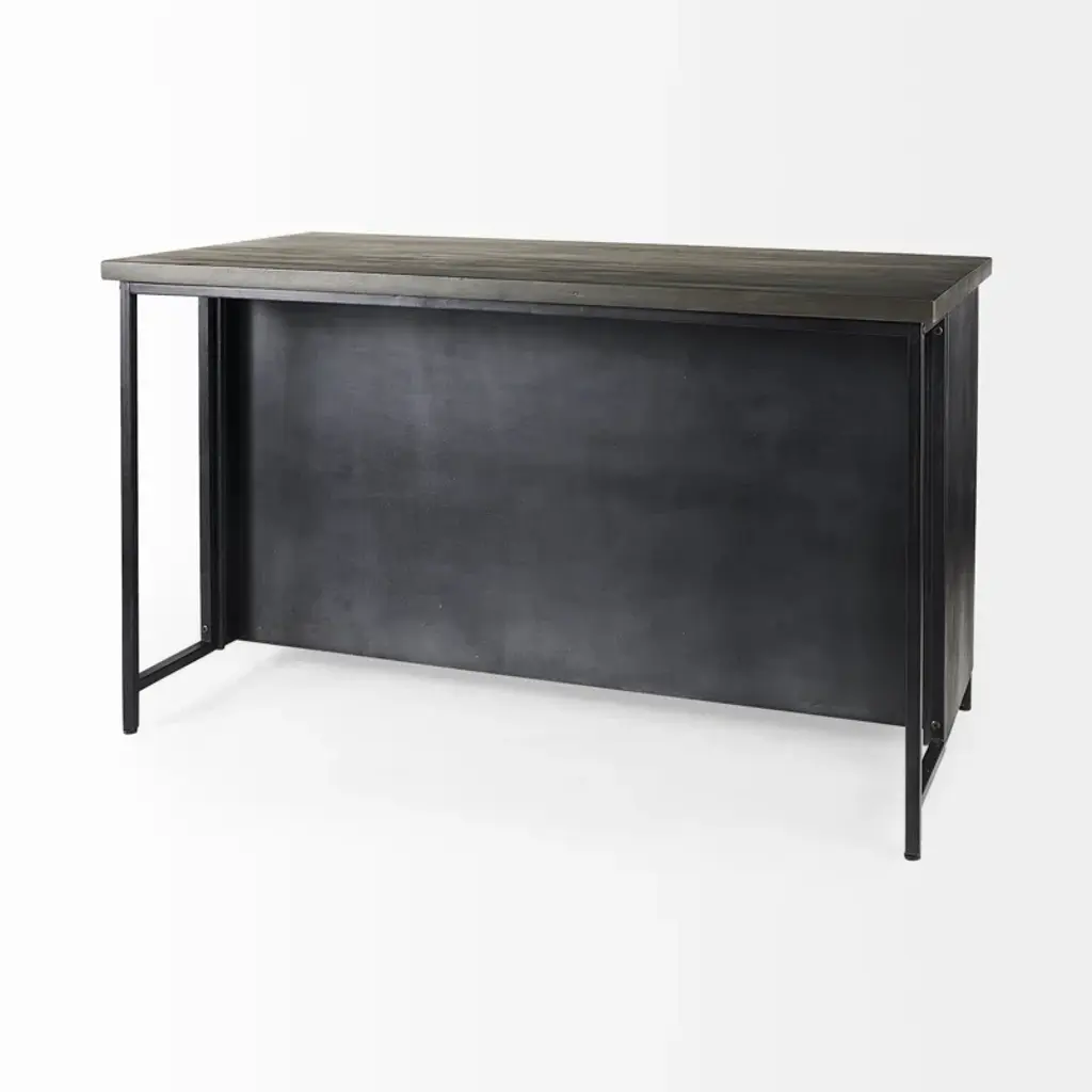 A kitchen island composed of wood, metal, and glass, featuring see through storage display.
