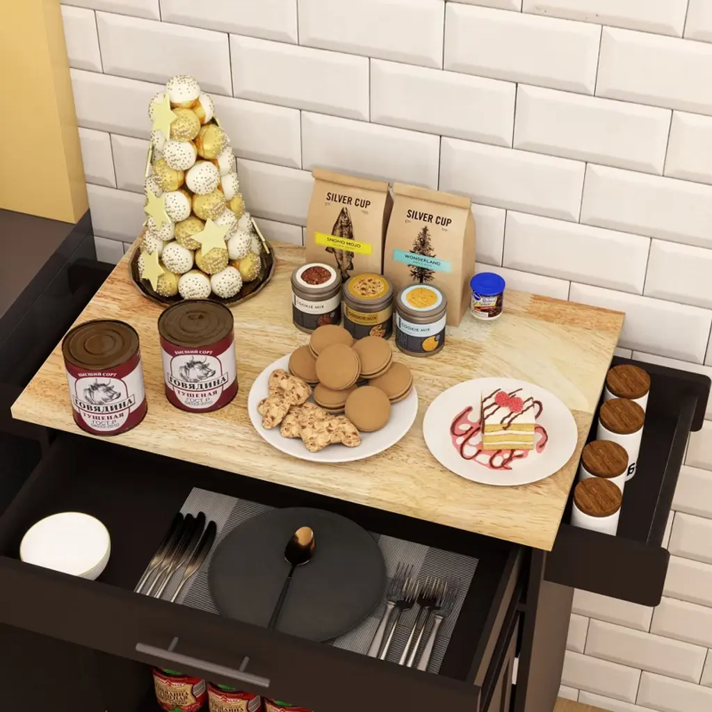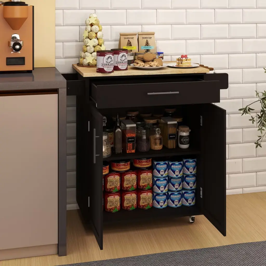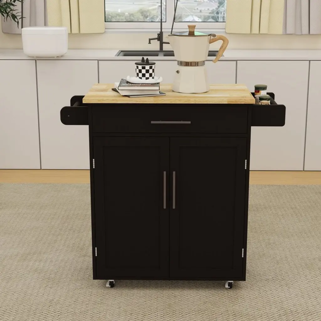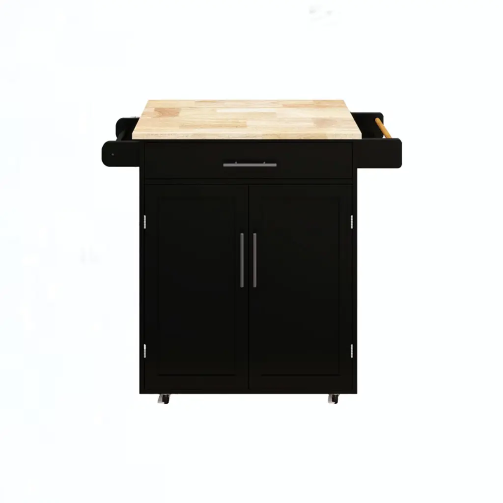 Elevate your culinary space with our versatile Kitchen Island Trolley Cart. Featuring a durable rubber wood top, this rolling cart is designed for both functionality and style. It offers convenient storage options, with one drawer, two doors, and adjustable shelves for customizable organization. The towel rack and seasoning rack enhance usability, making essentials easily accessible. Equipped with wheels for mobility and locking casters for stability, this kitchen island is perfect for any kitchen or dining area. Its modern black finish and high-quality E1 MDF construction ensure longevity and aesthetic appeal, making it a must-have addition to your home. Experience the perfect blend of convenience and elegance with this practical kitchen trolley.
