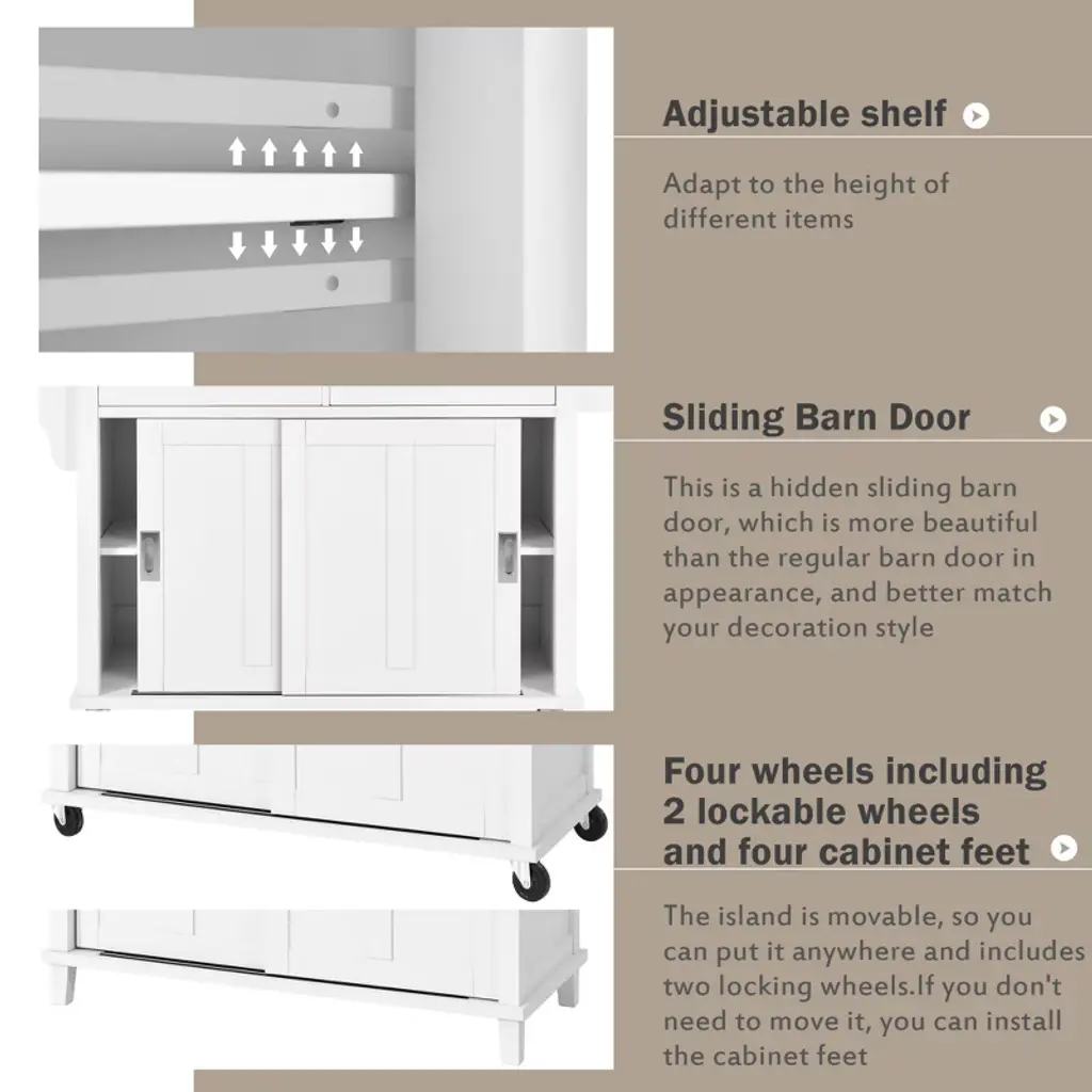Transform your kitchen space with this stylish and functional Kitchen Cart. Featuring a beautiful rubber wood drop-leaf countertop, it serves both as a food prep area and a dining table. The innovative sliding barn door adds a touch of elegance while providing efficient storage options. Equipped with four smooth-rolling wheels, including two locking ones, this cart is designed for easy mobility and stability. With ample storage thanks to its two drawers and adjustable shelves, it's the perfect addition for keeping your kitchen organized and tidy. Its contemporary design fits seamlessly into any décor, making it the ideal kitchen solution.