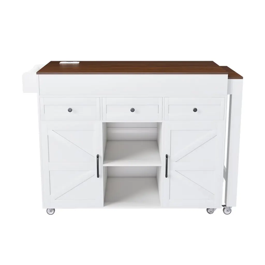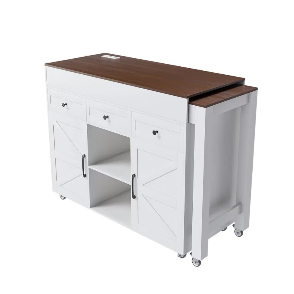 Transform your kitchen with this versatile Kitchen Island featuring an extendable dining table and integrated power outlet. Designed for modern living, it effortlessly converts from a compact prep station to a spacious dining area in seconds, making it perfect for entertaining or family meals. With ample storage options, including four-door cabinets and two spacious drawers, you can keep your kitchen organized and functional. The mobile design allows for easy movement on six removable wheels, ensuring stability when needed. Crafted from durable MDF, this stylish island combines functionality with sleek design, while hassle-free assembly ensures you can enjoy it in no time. Upgrade your culinary space with this essential kitchen piece!