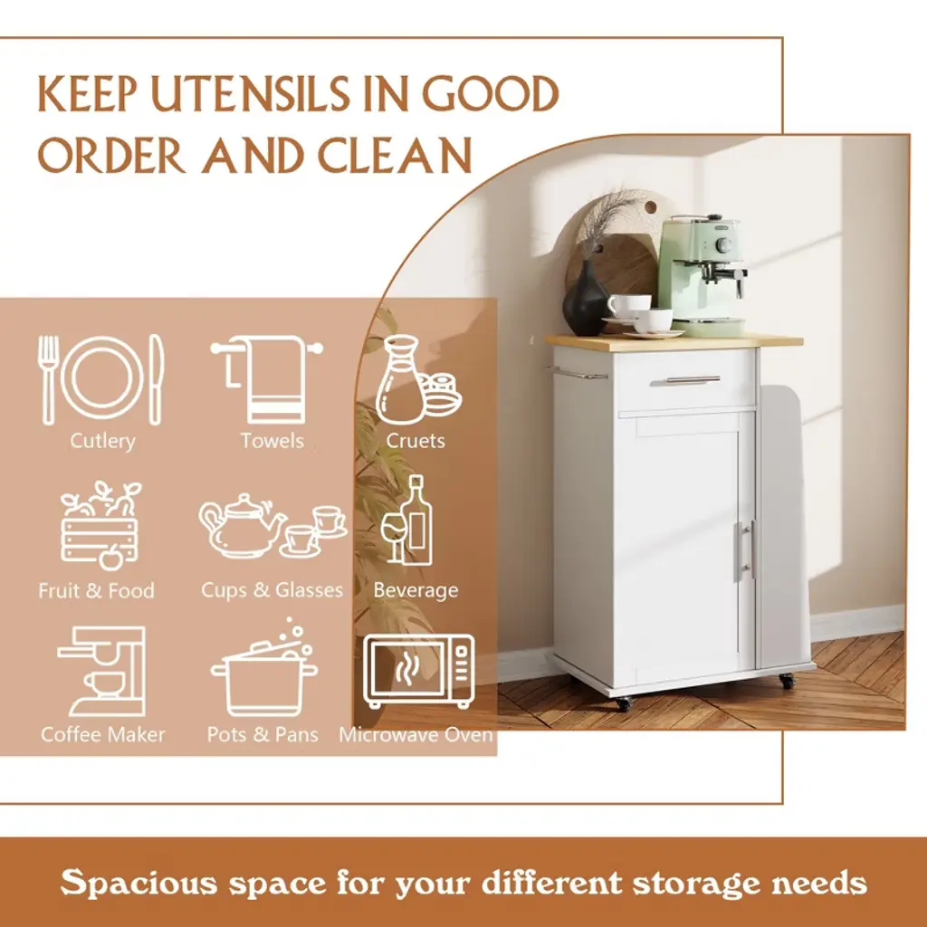 This kitchen island cart is a practical and stylish addition to any culinary space. The frame is crafted from engineered wood to support a solid wood countertop. The cart includes a drawer, adjustable shelves, and a towel rack, providing ample storage options. Its rolling casters with locking wheels offer easy mobility and secure placement. The scratch- and water-resistant surface ensures easy maintenance, making it ideal for kitchens, dining rooms, or living rooms.