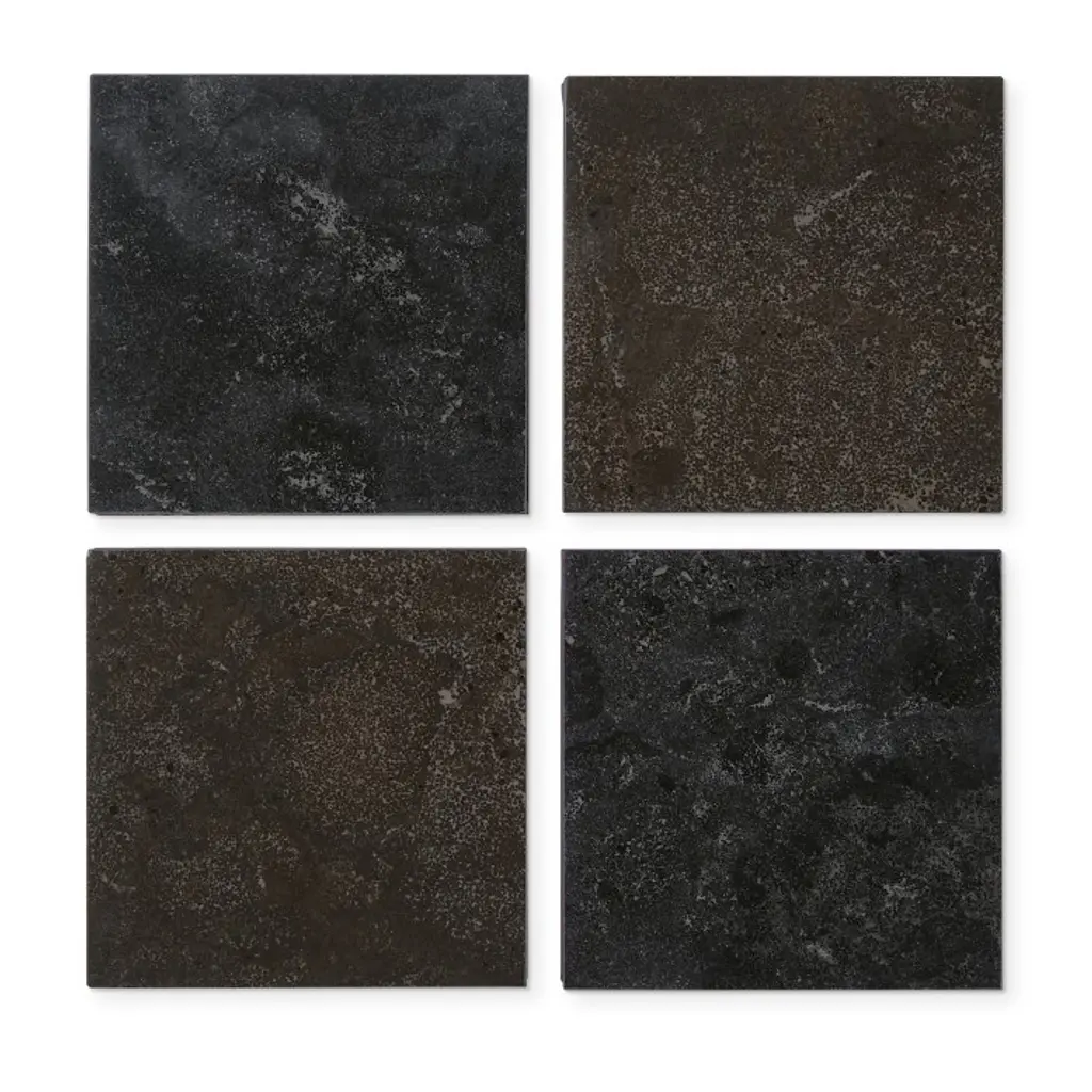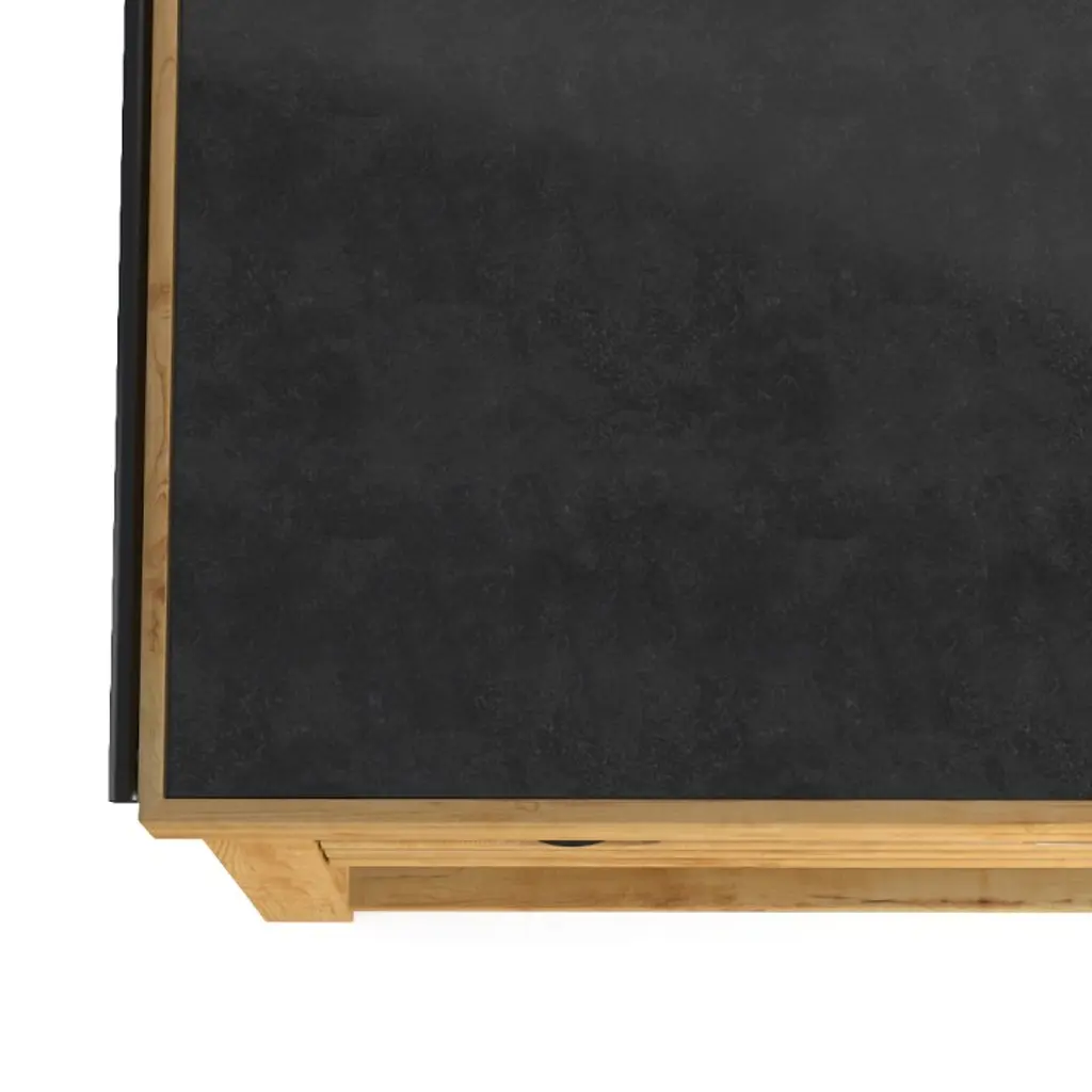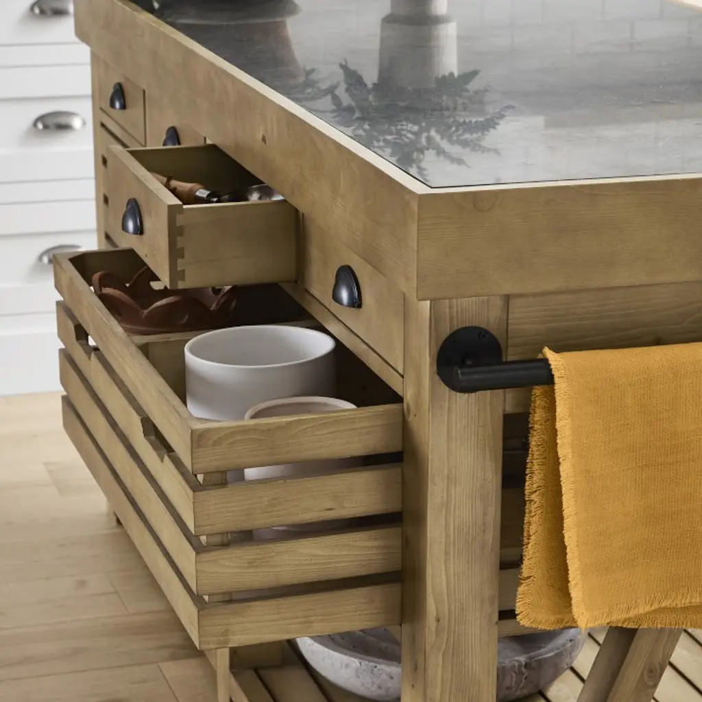 Our handcrafted island pairs polished limestone with solid spruce, creating a beautiful, functional focal point for the kitchen. Open shelves and drawers on both sides offer ample storage for everything from prep tools to cutlery and dinnerware.