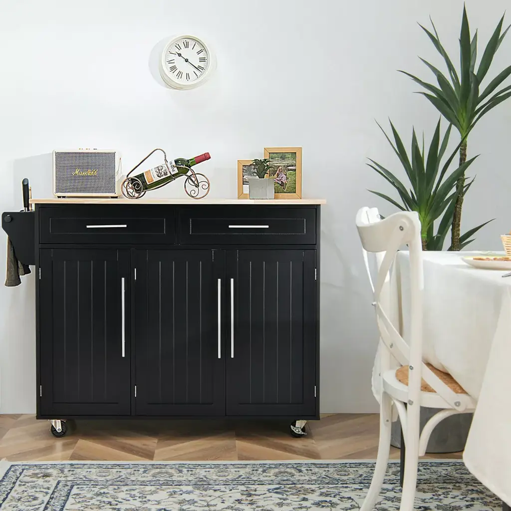 This is our brand new kitchen trolley cart which is an excellent addition for your kitchen or dining room. Constructed of high quality MDF boards and solid rubber wood top, the kitchen trolley cart is sturdy and durable enough for long time use. Featuring two drawers, a knife block and two large cabinets with adjustable shelf, this rolling kitchen cart will meet your different needs for storing and make a good use of space. A convenient handle makes it more effortless for push or you can use it as a towel rack. 4 universal wheels ensure you can move it smoothly and silently, and two of which have brakes for safe use. What's more, simple and elegant appearance blends perfectly with most decorative styles!FeaturesColor: Black Main material: MDF, rubber wood Overall dimension: 48'' x 18'' x 36.5'' (L x W x H) Tabletop dimensions: 44'' x 18'' (L x W) Net weight: about 49 lbs Weight capacity of tabletop: 132 lbs Weight capacity of each drawer: 17.5 lbs Weigh capacity of each shelf: 22 lbs Package includes: 1 x kitchen cart 1 x instruction