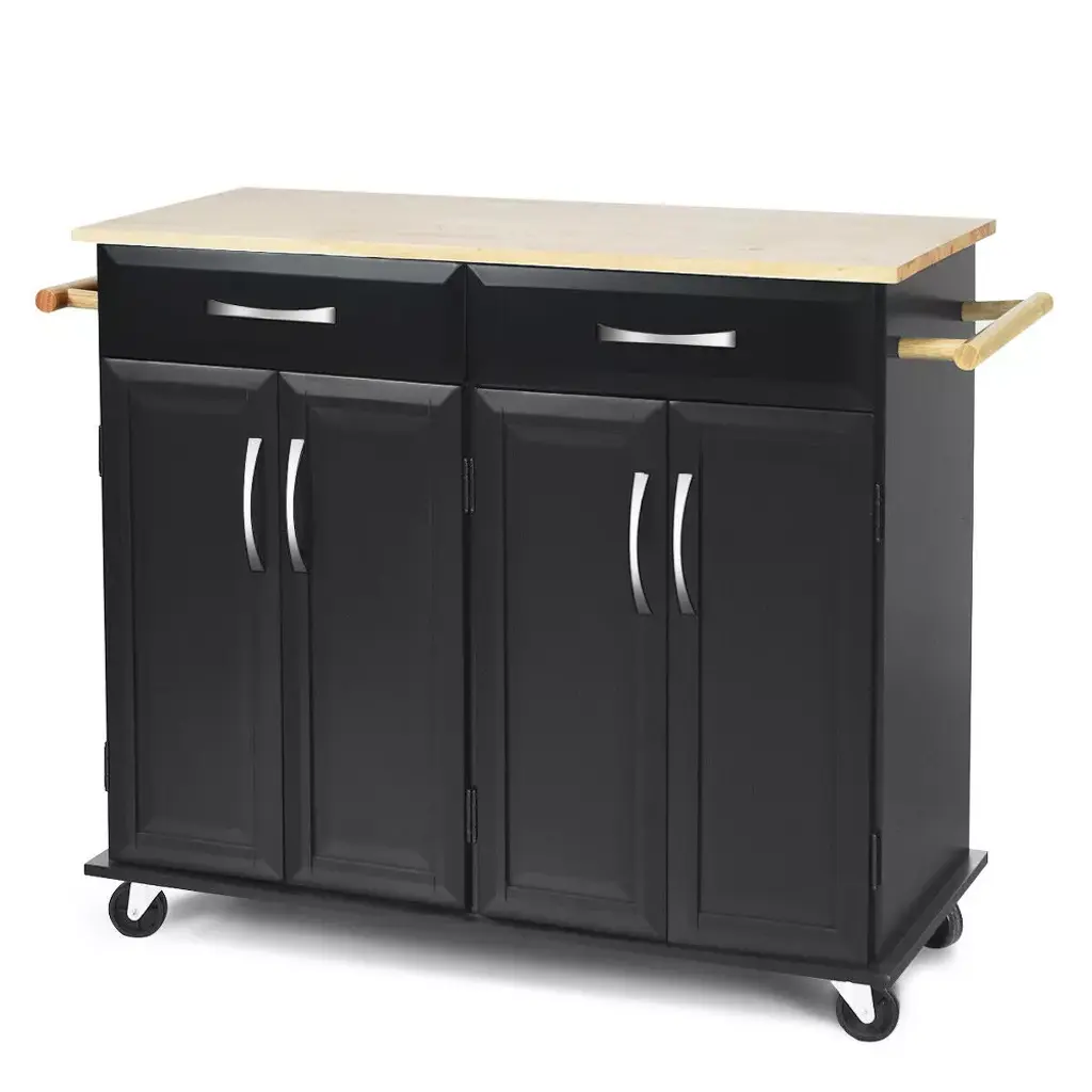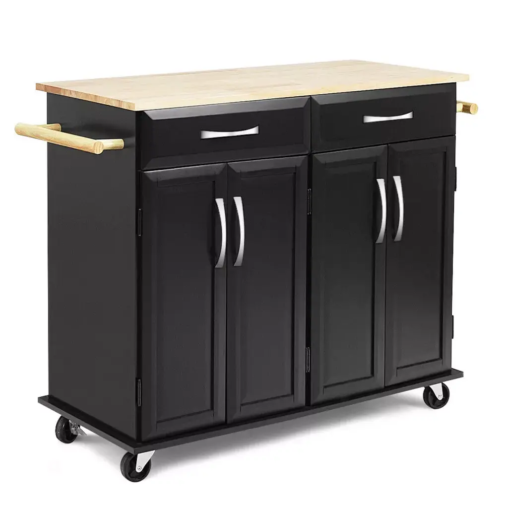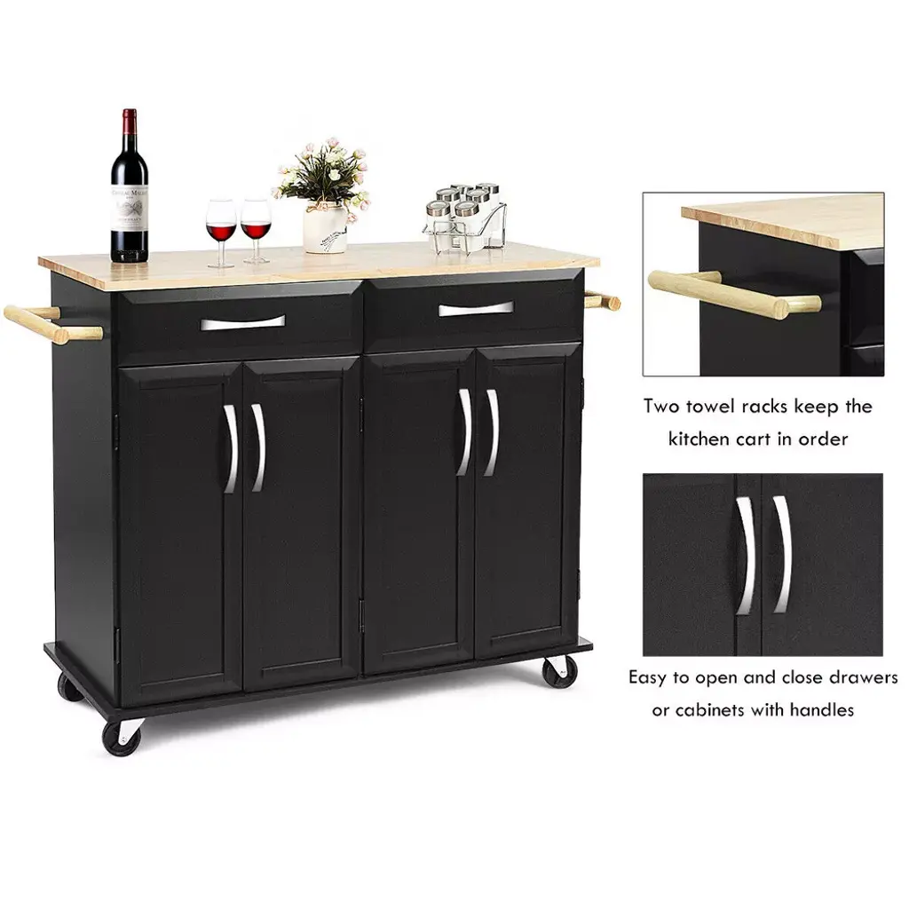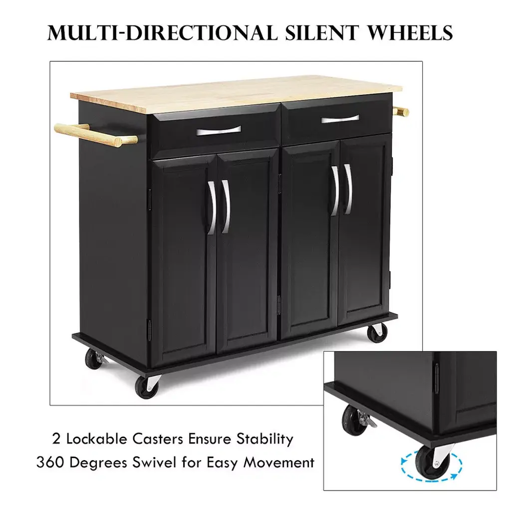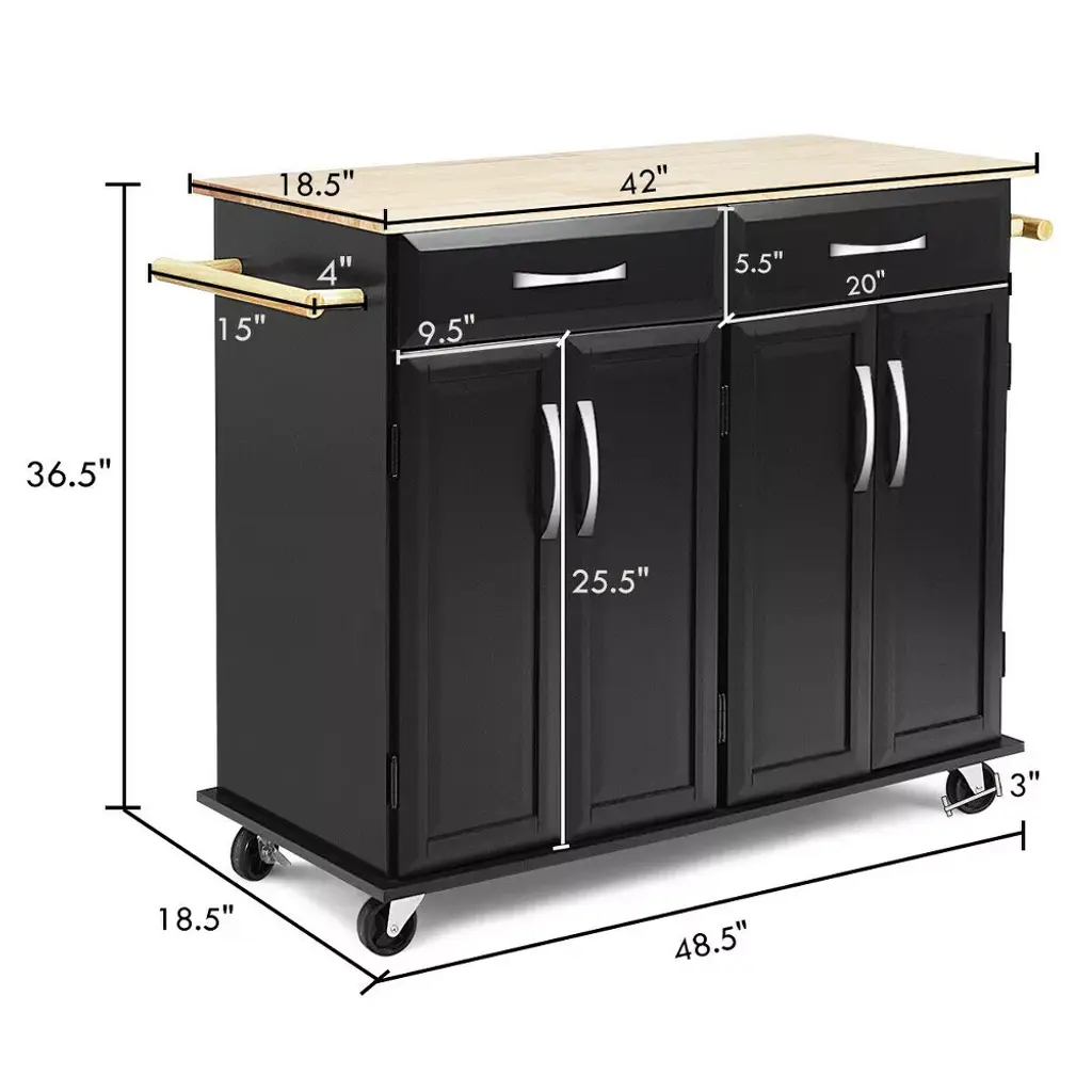 This is our new and high quality kitchen trolley cart which is an ideal choice for your kitchen or dining room. The frame is made of premium material, so this kitchen trolley is sturdy and sturdy enough for long time use. Features two drawers and two cabinets which provide large storage space to organize your items. The rubber wood top also provides extra counter space for kitchen to prepare delicious food. Two convenient handles make it more comfortable for push or you can use it as towel racks. Equipped with 4 rolling casters for easy movement, and 2 of them are lockable to ensure the stability while using the kitchen cart. What's more, Simple and elegant appearance blends perfectly with most decorative styles. Don't hesitate to buy oneFeaturesSpacious storage capacity Two cabinets and two drawers provide ample storage space Adjustable shelves to meet various storage requirements Easy to move with four flexible swivel wheels 2 lockable casters ensure stability when stop some place Two towel racks keep the kitchen cart in order Multi-directional silent wheels, 360 degrees swivel for easy movement Simple and classic design integrated with most home decoration style perfectly Suitable for kitchens, apartments, hallways, or anywhere you need more extra storage Easy to open and close drawers or cabinets with handles Easy to assemble and easy to cleanMaterial: rubber wood , pinewood, MDF, PB and PP iron wheels Overall dimensions: 48.5'' x 18.5'' x 36.5'' (L x W x H)Tabletop dimensions: 42'' x 18.5'' (L x W)Total weight capacity:220lbs Weight capacity of tabletop:110 lbsWeight capacity of each drawer:11 lbs Weigh capacity of each shelf:22 lbs Net weight: about 86 lbsPackage includes: 1 x kitchen trolley 1 x instruction