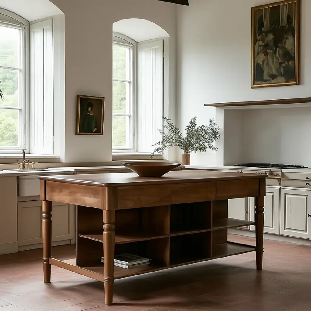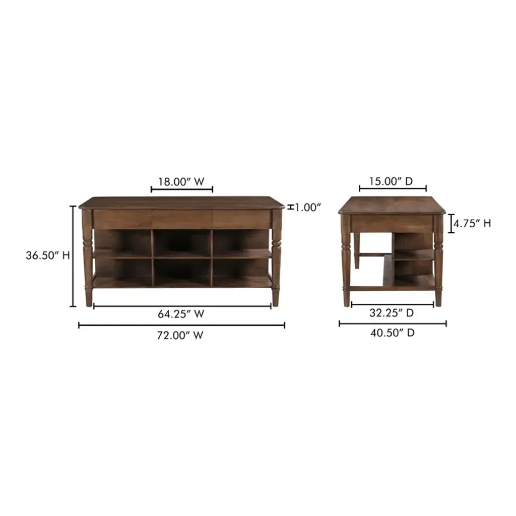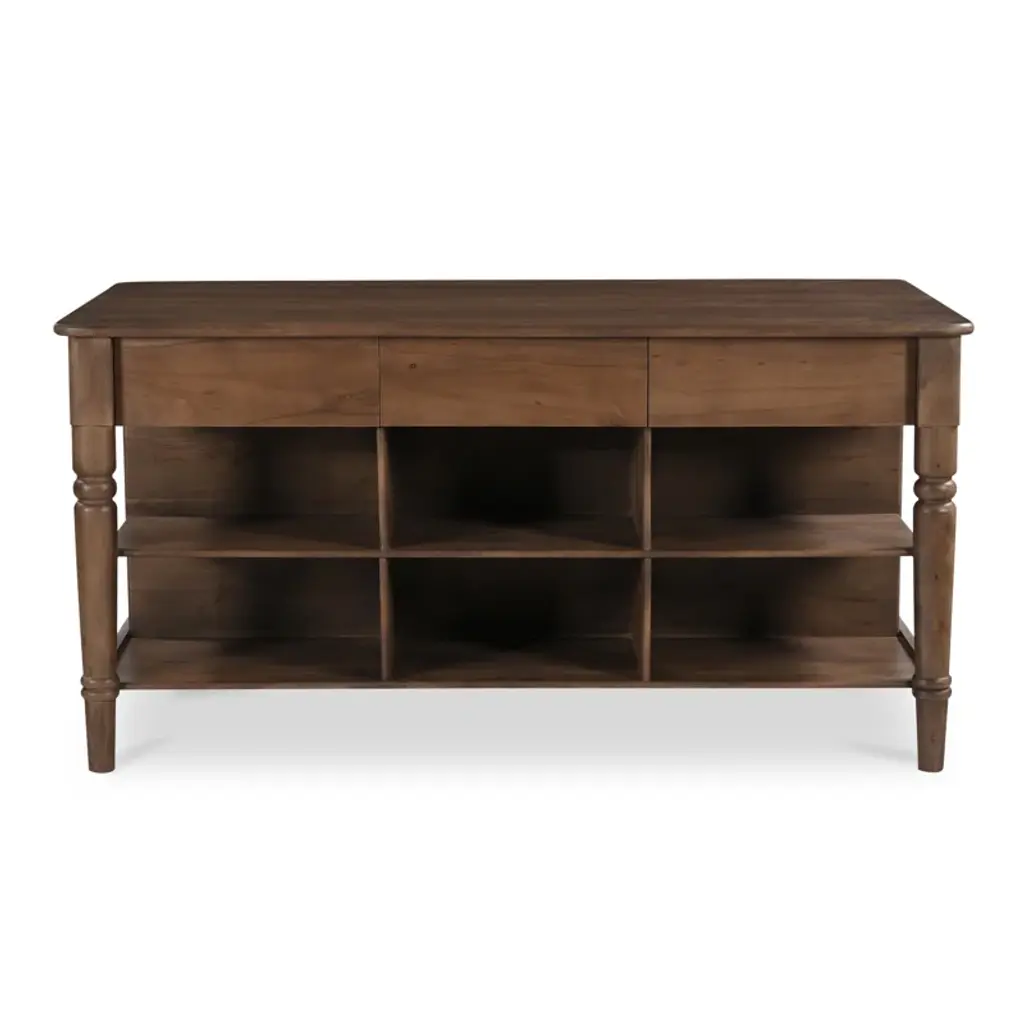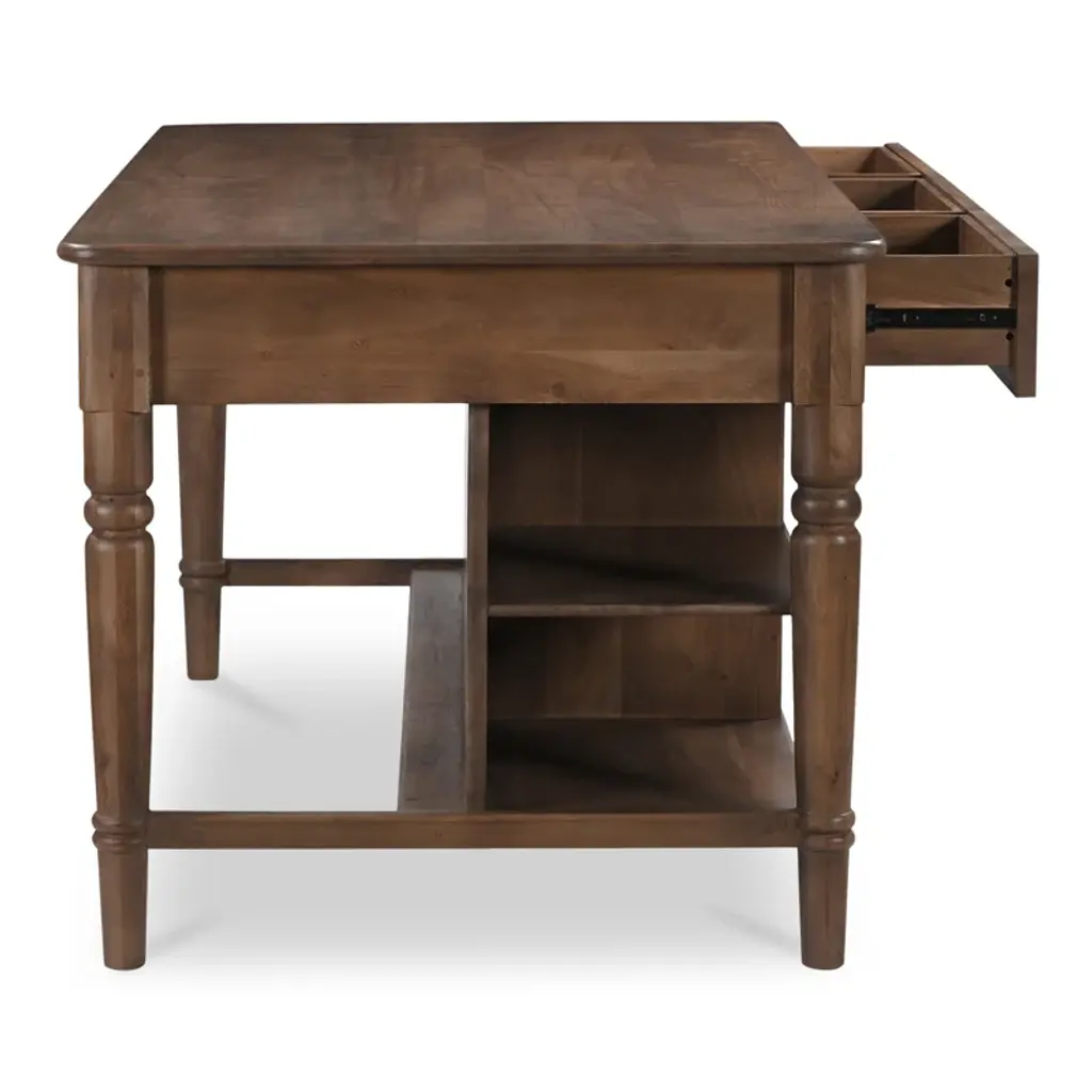 The Darian kitchen island features beautifully turned legs, intricately carved details, and a mid-tone brown finish that fits seamlessly into traditional and transitional homes. Adding to its charm are six open shelves and three drawers opposite the seating area. These are complemented by an overhanging tabletop that enhances its classic aesthetic--a timeless centerpiece, enriching the dining experience with style and functionality.