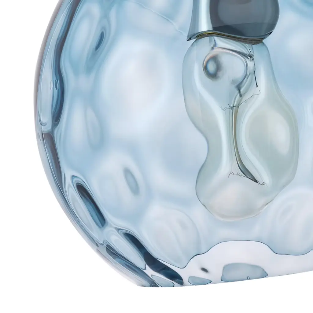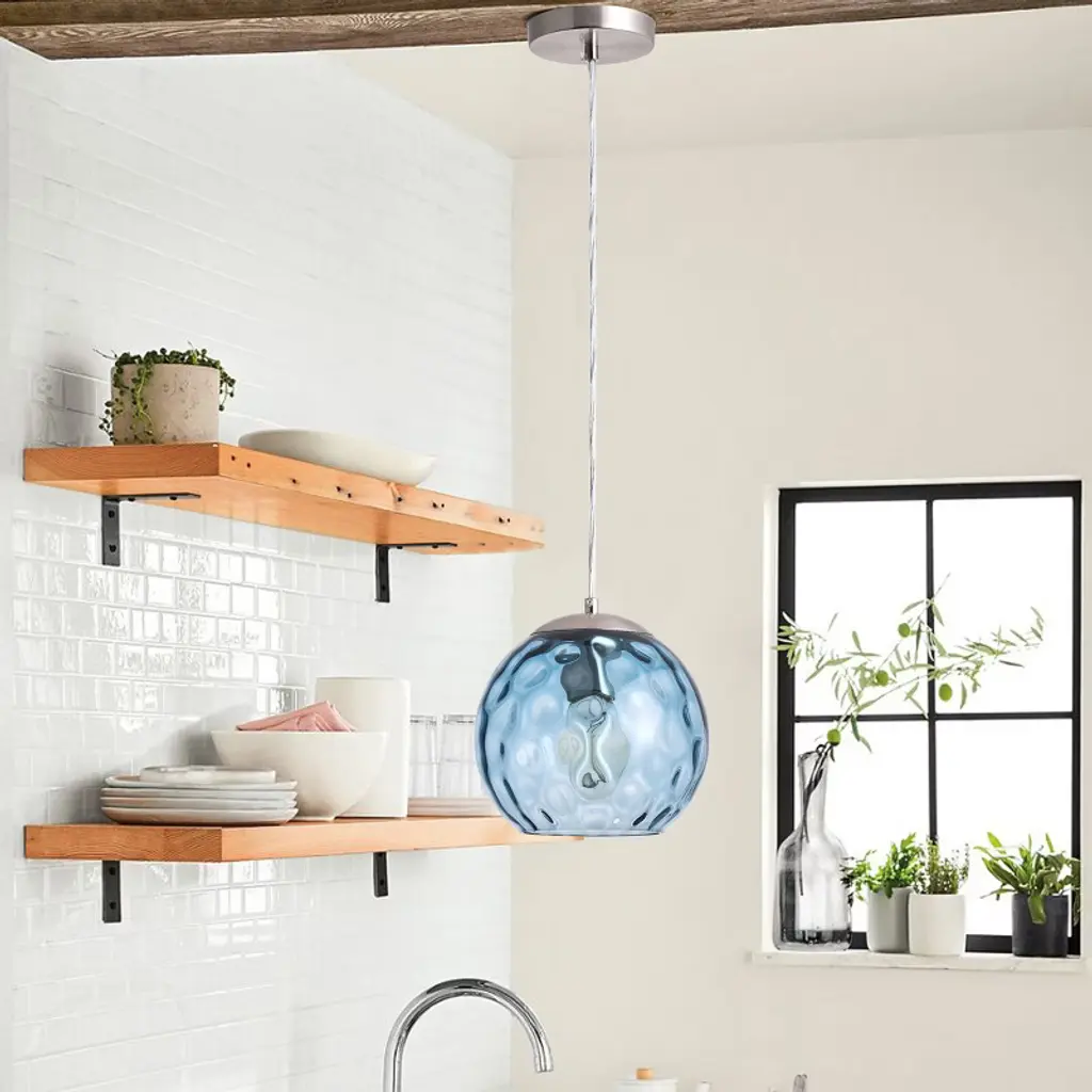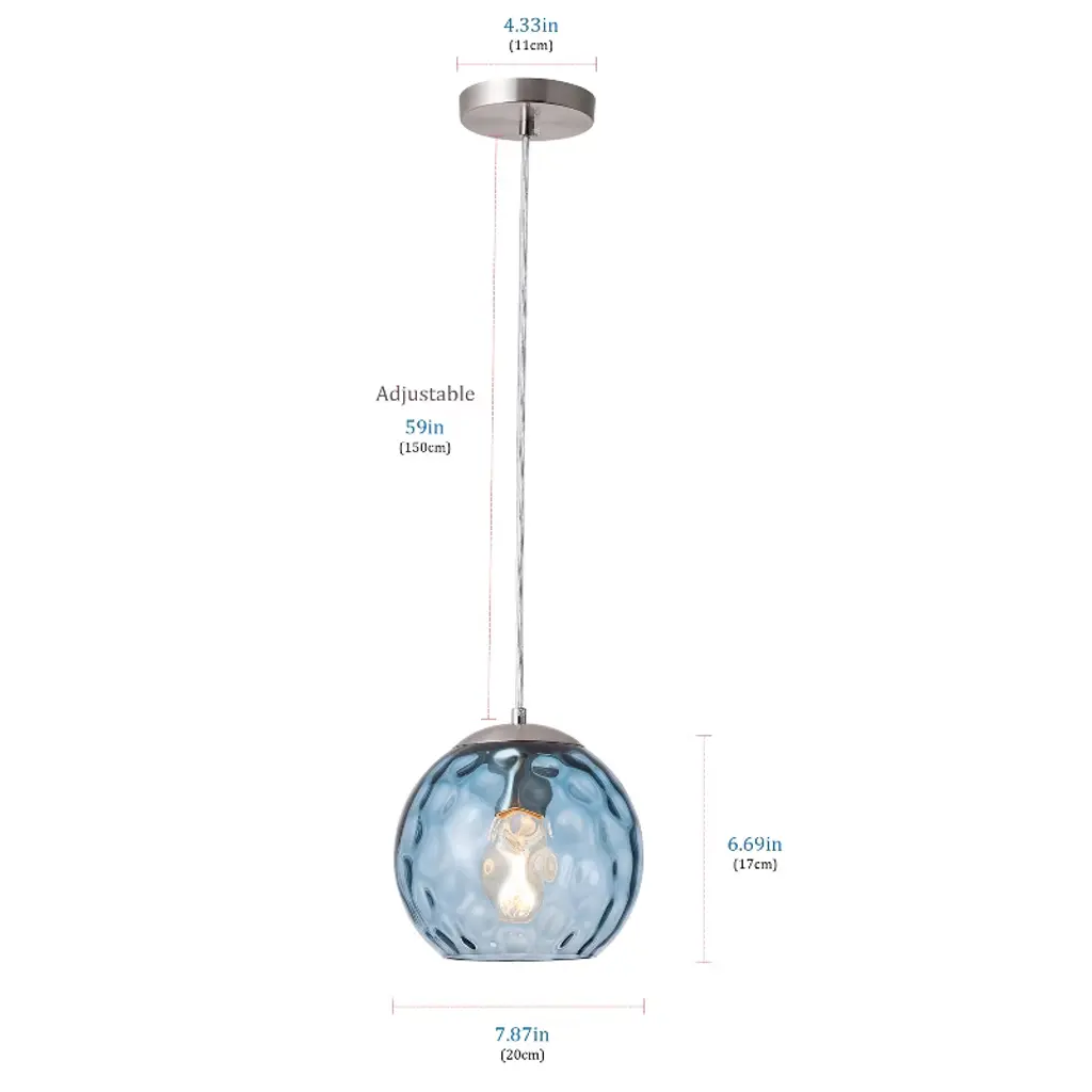 Dewdrop blue glass pendant light combines a brushed nickel frame with a textured blue globe shade, bringing a modern and artistic style to your home. ETL certified for safety, this fixture features one E26 socket (MAX 40W, bulb not included) and works with LED, CFL, or incandescent bulbs. Perfect for kitchen islands, dining areas, bars, or bedrooms, the hanging design adds a stylish accent while providing functional lighting. Durable iron and glass construction ensures long-lasting use, and installation is quick and simple with included hardware.