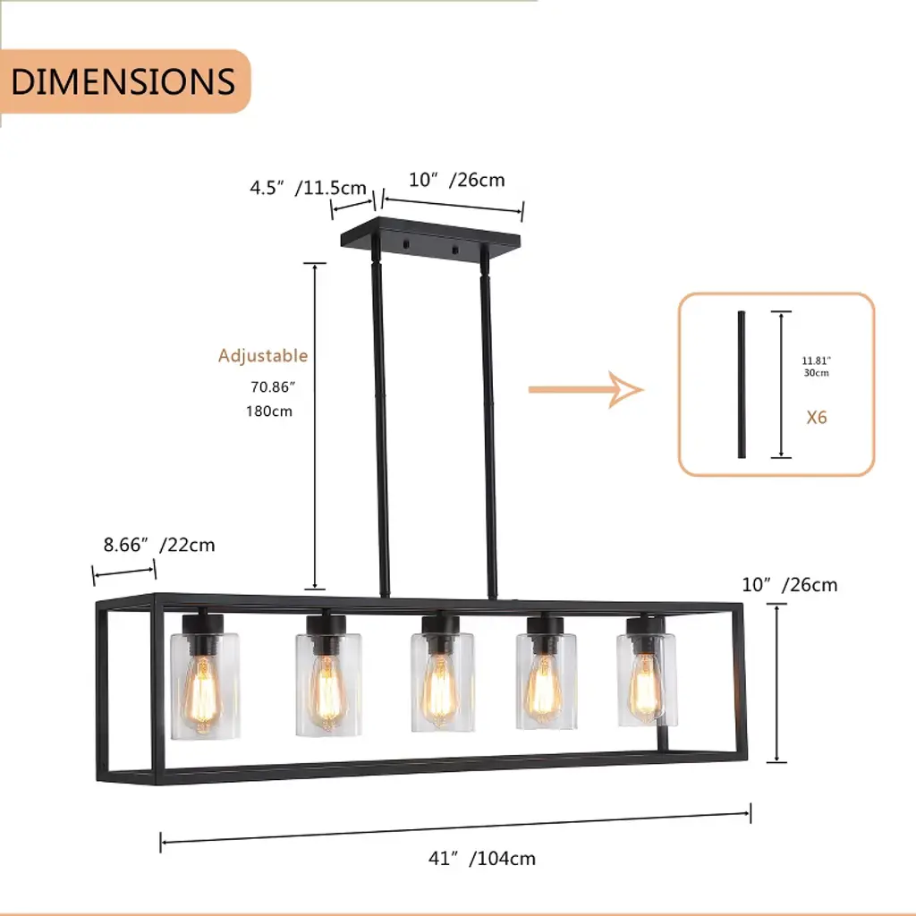 The Dewdrop Modern Farmhouse 5-Light Chandelier features a black iron rectangular frame and clear glass shades for an elegant industrial look. ETL certified and compatible with E26 bulbs (max 40W, not included), it¡¯s perfect for kitchen islands, dining rooms, and large spaces.