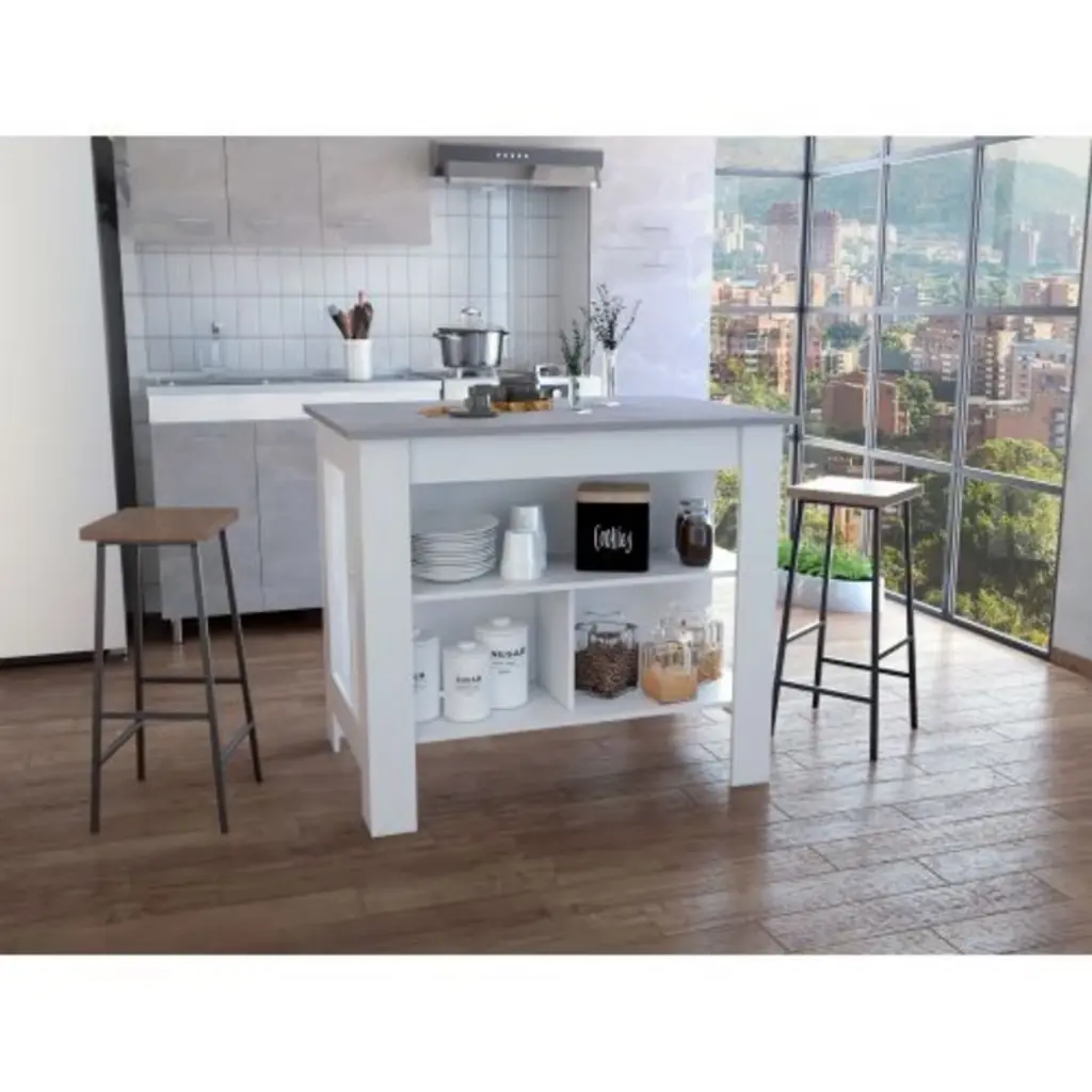 This kitchen island offers spacious legroom, a wide prep area, ample storage, functional design, and easy assembly. Ideal for organized, comfortable meal prep and kitchen storage.
