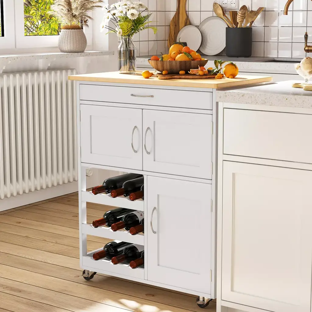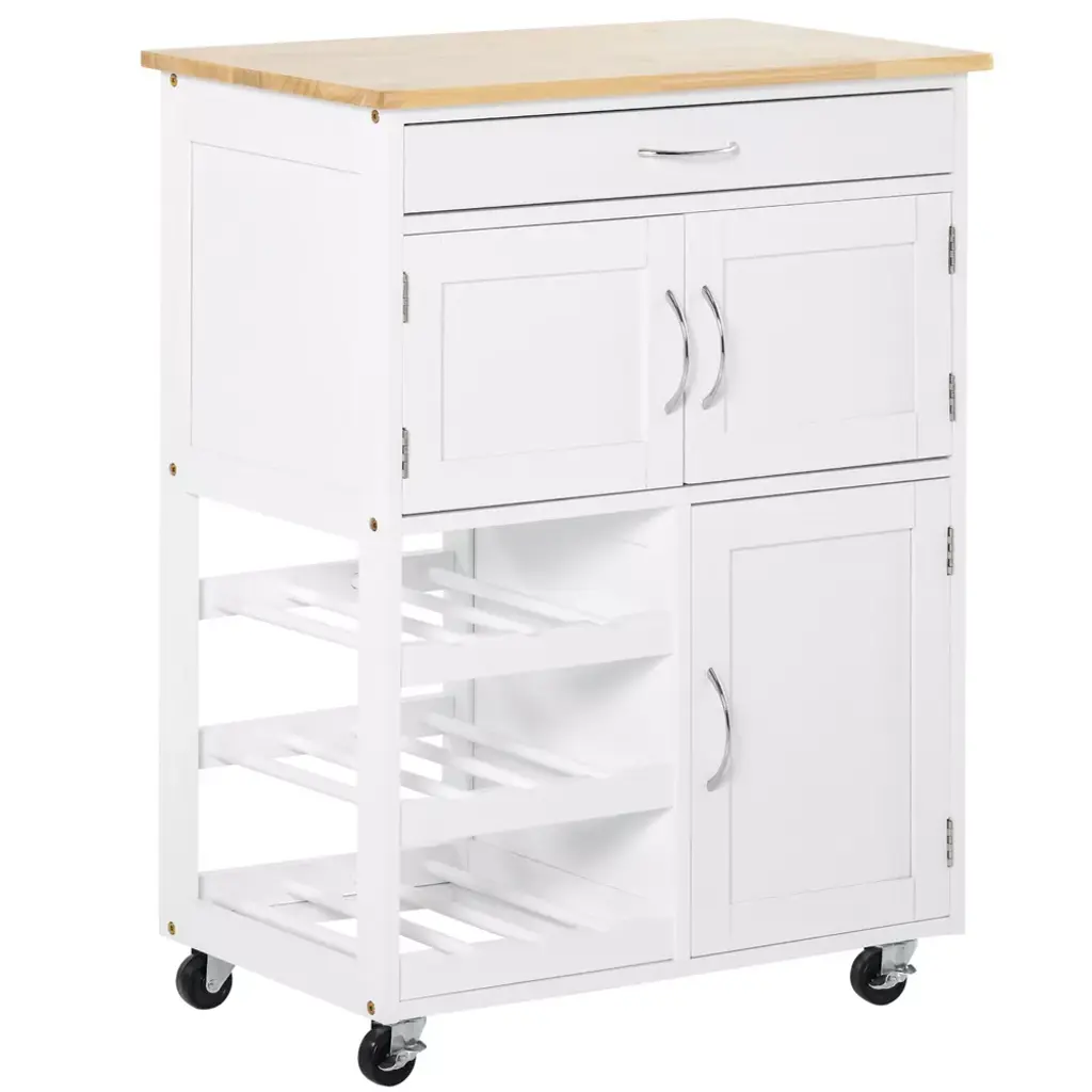 This rolling cart is an ideal option for any kitchen and dining space - no matter the size. It comes with a drawer, a 9-bottle wine rack, and two cupboards that provide plenty of room for holding everything together. Wheels allow you to move it where you desire. The rubberwood countertop is hard and quality and is ideal for prepping drinks and garnishes when friends come over. Make your house a home with HOMCOM.