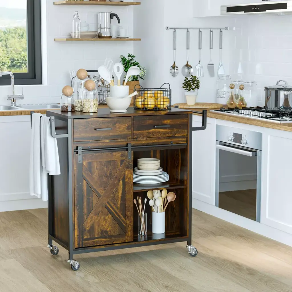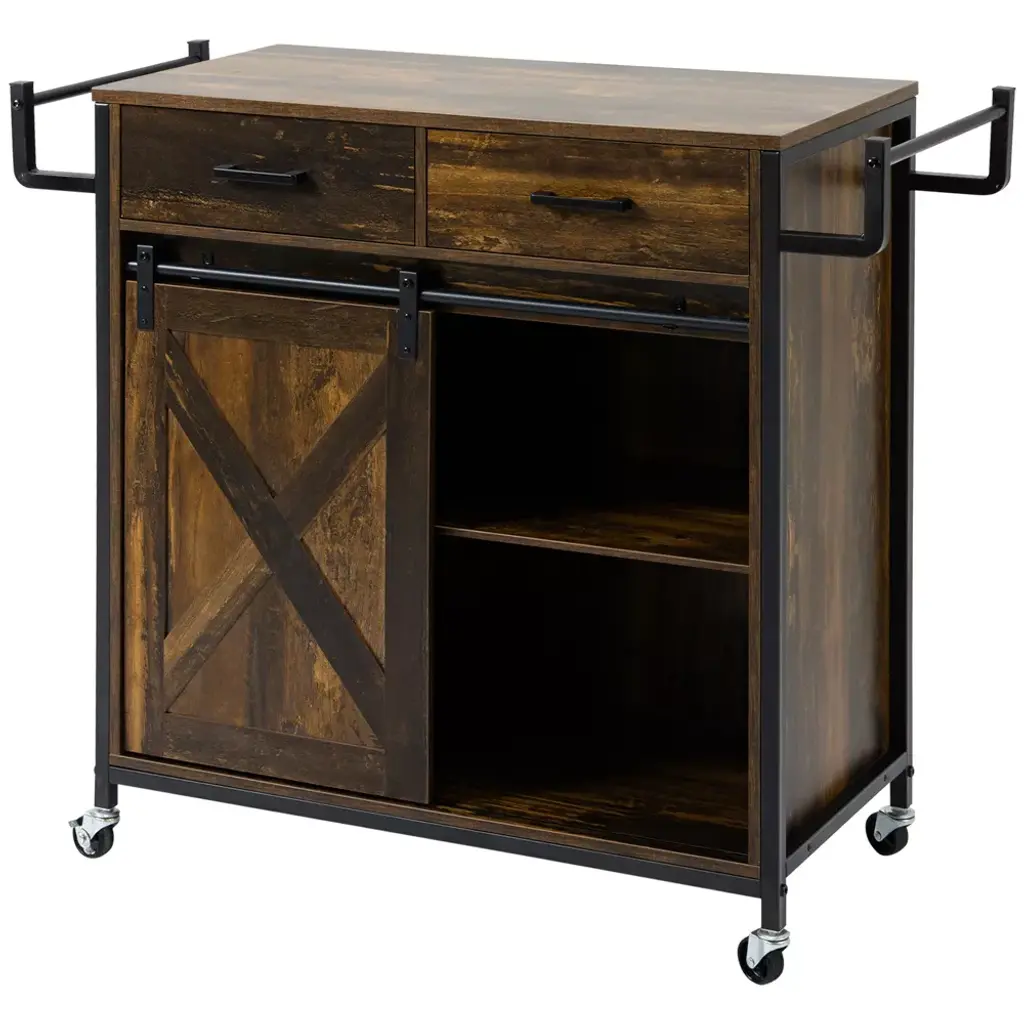 Homcom Rustic Farmhouse Kitchen Cart, Rolling Storage Island With Adjustable Shelf, Two Drawers, Sliding Barn Door Cabinet And Towel Rack