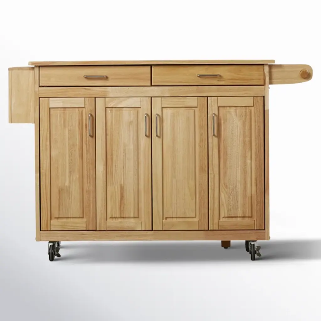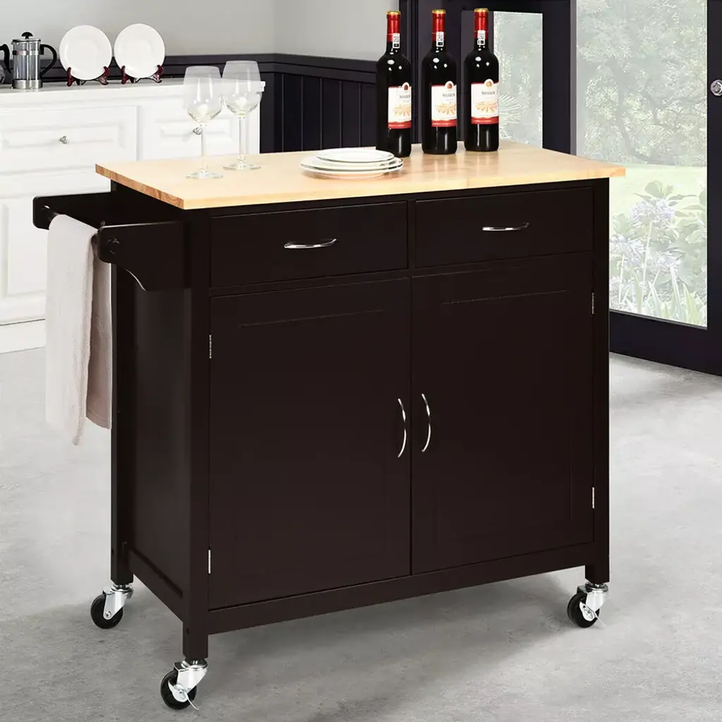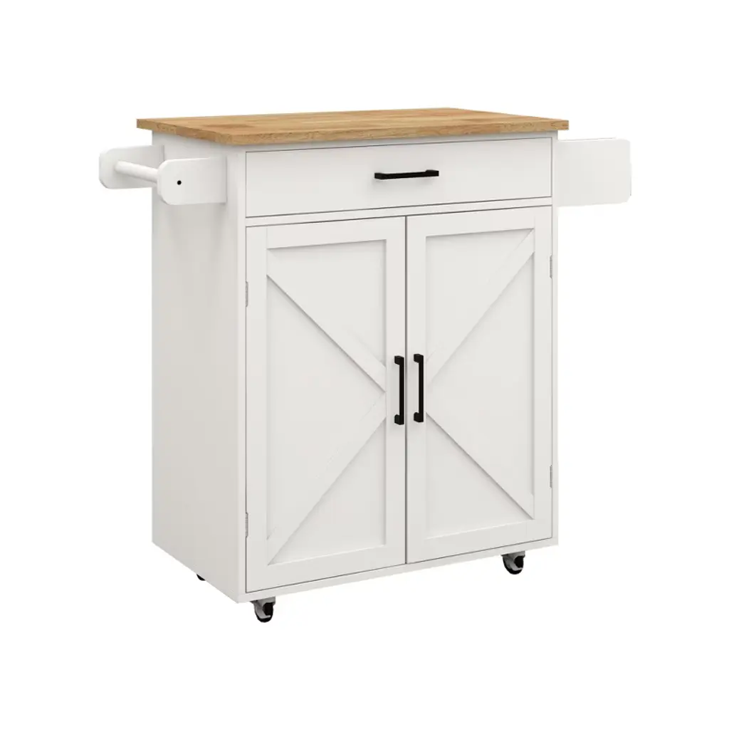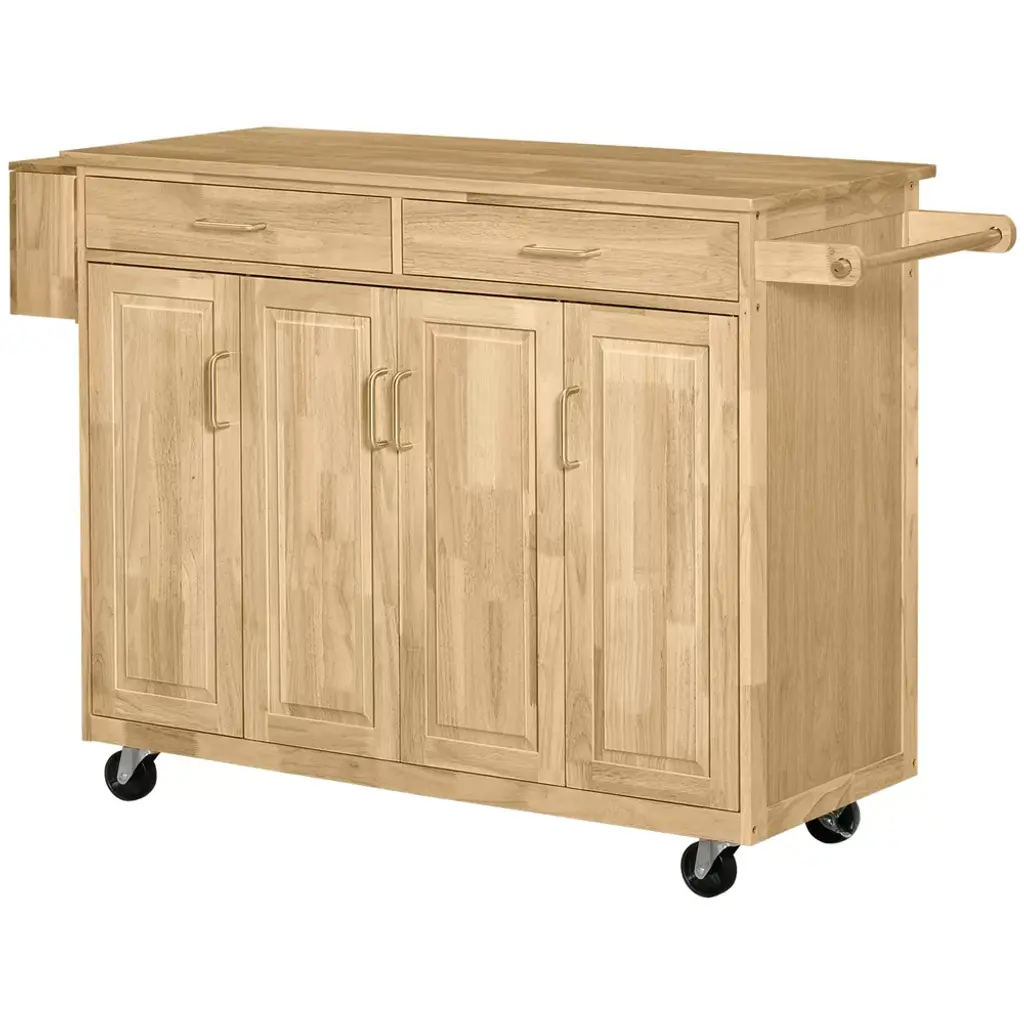 Intend to keep your kitchenware neatly organized? This kitchen cart is a must-have. Made of varnished rubberwood frame with engineered wood shelves, it boasts a natural appearance and spacious countertop. Comes with 2 easy-glide drawers, 3 cabinets for all your kitchen utensils, plates, and baking dishes. 1 spice bottle holder, 3 knife holders, and 1 towel bar complete the compact design.