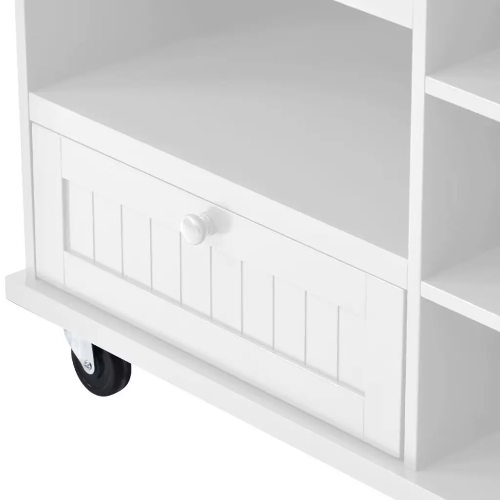 This 50.8'' fixed kitchen storage island features a sturdy MDF and rubberwood tabletop with a load capacity of 220 pounds and a smooth, heat-resistant, moisture-resistant surface. It comes with 2 drawers, an adjustable shelf, and 4 open storage compartments, providing ample space for a microwave, coffee machine, and other kitchen appliances. The island is equipped with 5 smooth-running casters (2 with locking devices) for easy movement and fixing; it can also be replaced with four solid wood cabinet feet for enhanced stability.
