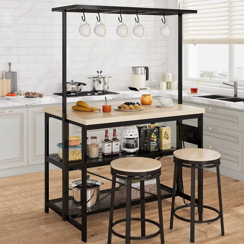 Kitchen Island with Wheels - Microwave Stand & Baker's Rack with 3-Tier Storage Shelves, 5 Hooks & Removable Top