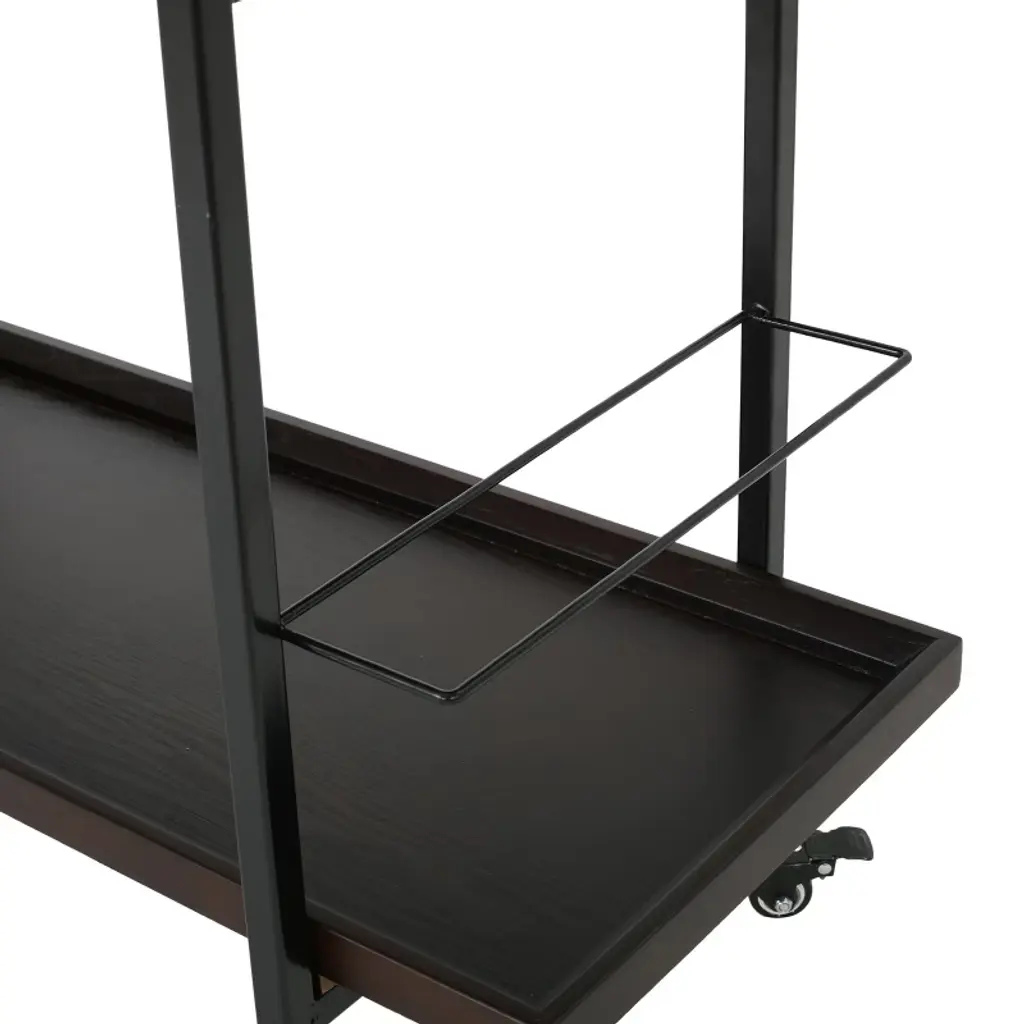 This stylish industrial rolling kitchen cart combines functionality with modern design for versatile home use. The powder-coated metal frame contrasts beautifully with the smooth wood-look shelves, creating an attractive contemporary aesthetic. With two lipped shelves and integrated bottle holders, this mobile kitchen storage cart keeps your beverages and bar accessories securely organized. The locking wheel casters provide smooth mobility between rooms while ensuring stability when stationary. Measuring 38 inches wide with a streamlined profile, this kitchen island cart fits perfectly in kitchens, dining areas, or living spaces. The practical design makes this rolling island cart for kitchen ideal for entertaining guests or adding extra storage to your home.