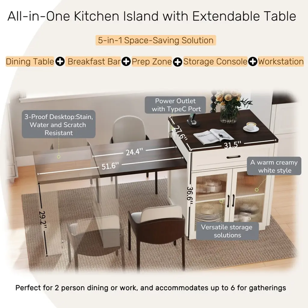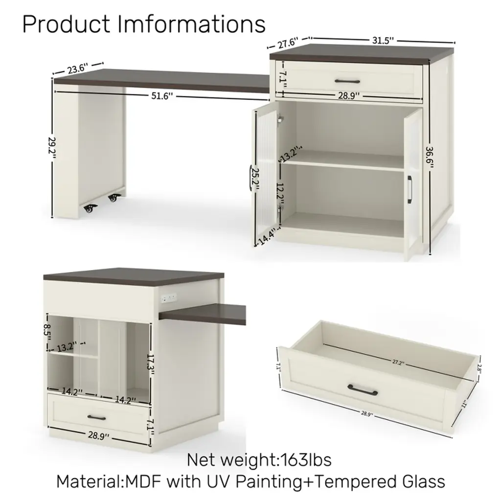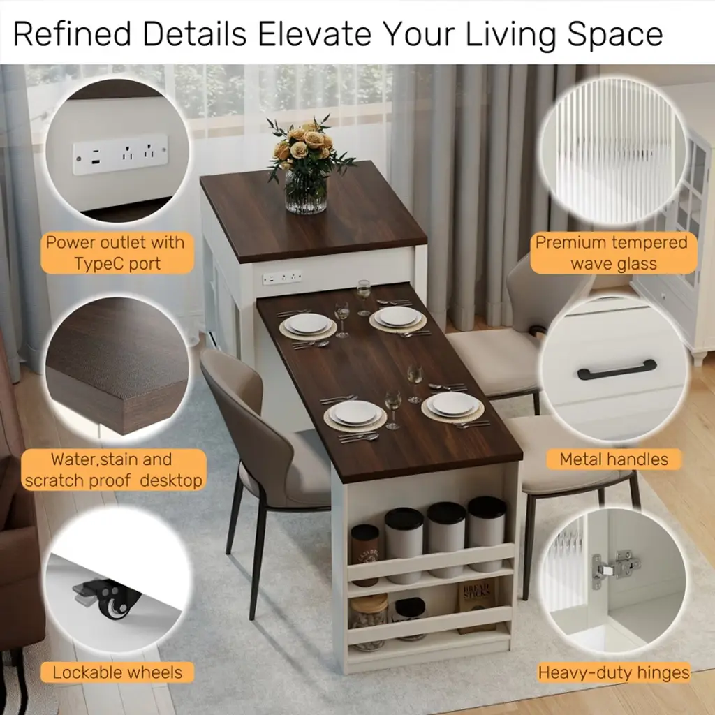 1.Kitchen island with extendable dinning table(from55.9'' to 83.1''); 2.Premium Material with CARB Phase 2 Compliant Certified MDF board and waterbased painting finish; 3.Double-sided large storage capacity; 4.Premium tempered wave glass; 5.Heavy-duty hinges; 6.3-in-1 power outlet with typeC port; 7.Water,stain,scratch proof tabletop; 8.Extendable table with storage racks and lockable wheels;