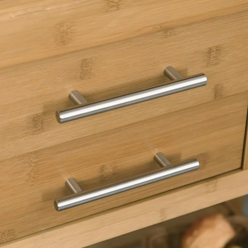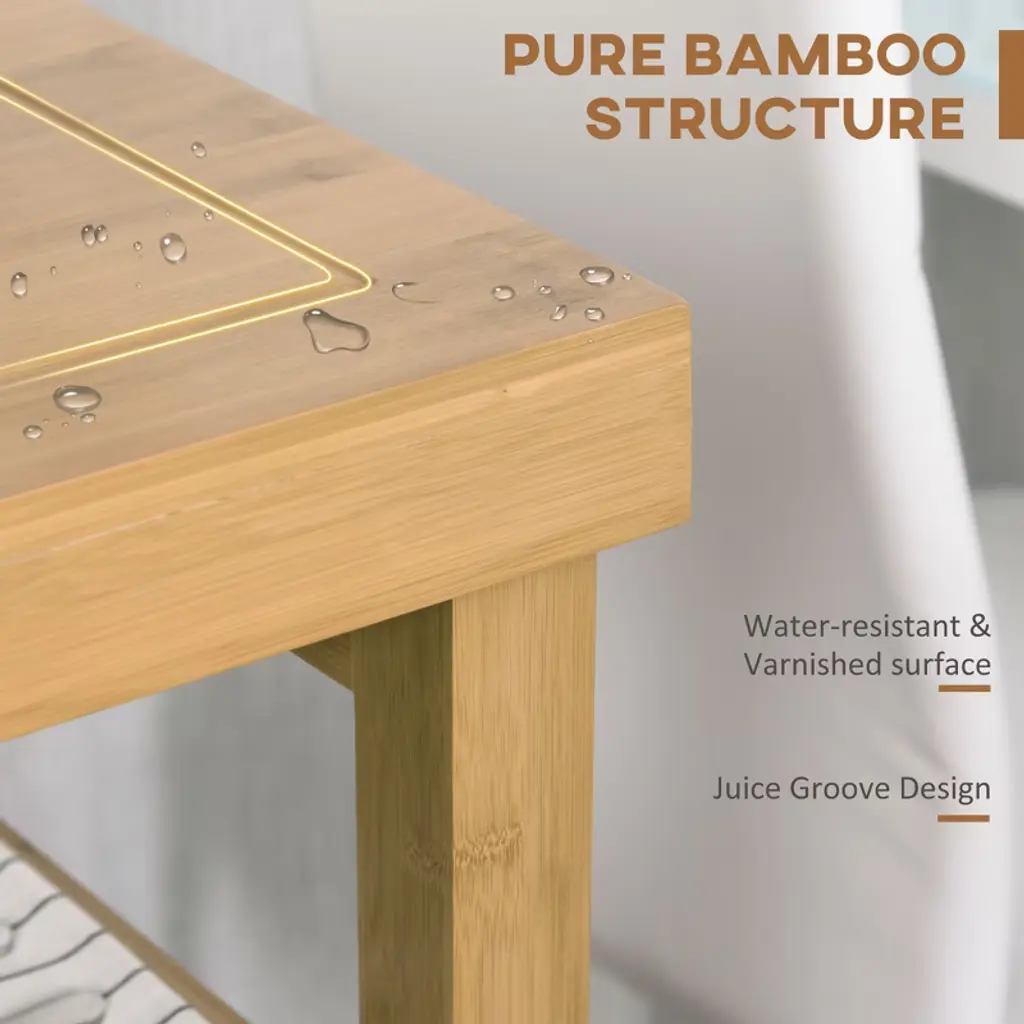 Upgrade your culinary space with this multi-functional bamboo kitchen island, combining generous storage with professional functionality. The butcher block countertop features a practical liquid groove to contain spills, while the varnished bamboo construction ensures lasting durability. With 2 drawers, 2 shelves, and a side towel rack, it organizes everything from utensils to aprons. Four lockable casters provide mobility between kitchen, dining, or laundry areas.