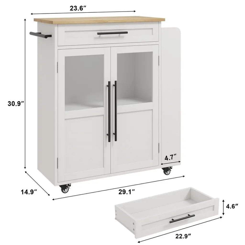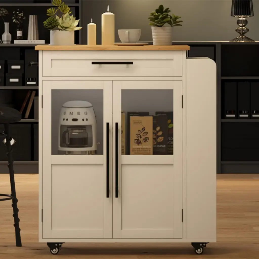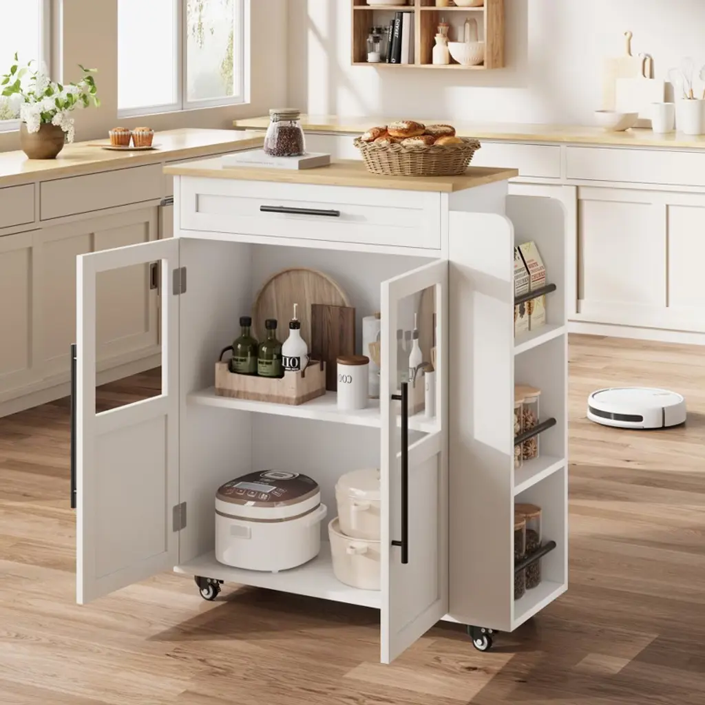 Enhance your kitchen space with our Mobile Kitchen Island Cart, designed specifically for small kitchens and tight spaces. This versatile kitchen island cart features 360° rolling wheels with two lockable casters, allowing you to move it effortlessly and secure it in place during food preparation or serving. Crafted from high-quality engineered wood, it combines durability with a modern rustic look that complements any kitchen or dining decor. Maximize your storage options with two transparent-door cabinets and two interior shelves that provide ample room for your cookware and essentials. The large pull-out drawer offers additional space for utensils and tools, while the 3-tier spice rack with secure tubes keeps your spice bottles organized and prevents them from falling. The sleek black handle doubles as a convenient towel rack, adding functional elegance and saving valuable space. The scratch-resistant countertop and easy-to-clean glass doors make maintenance simple, ensuring your kitchen island cart stays looking new with minimal effort. Whether you need extra prep space, a mobile serving station, or additional storage, this compact kitchen island adapts seamlessly to your needs. Perfect for small kitchens, dining rooms, or even outdoor cooking, this kitchen cart with wheels brings flexibility and style wherever you need it. Its compact design and versatile features make it an essential addition for anyone looking to optimize space and enhance kitchen functionality.