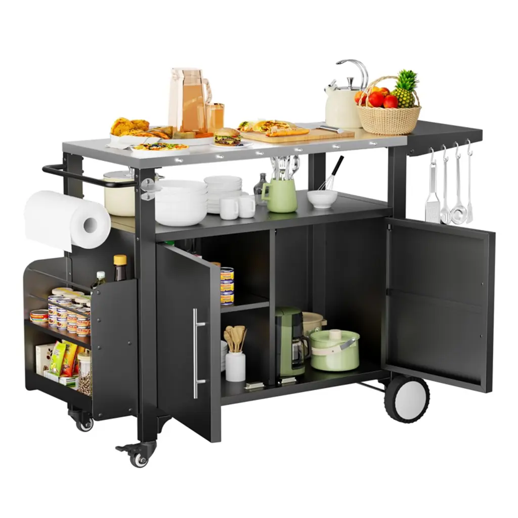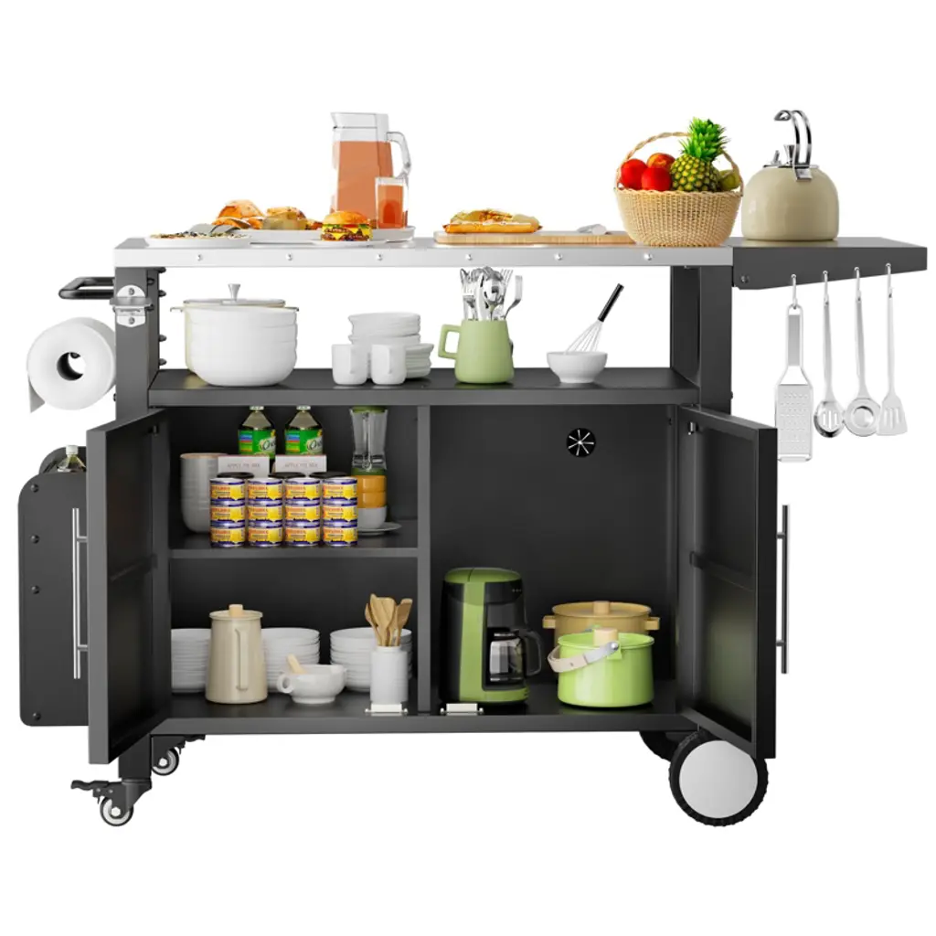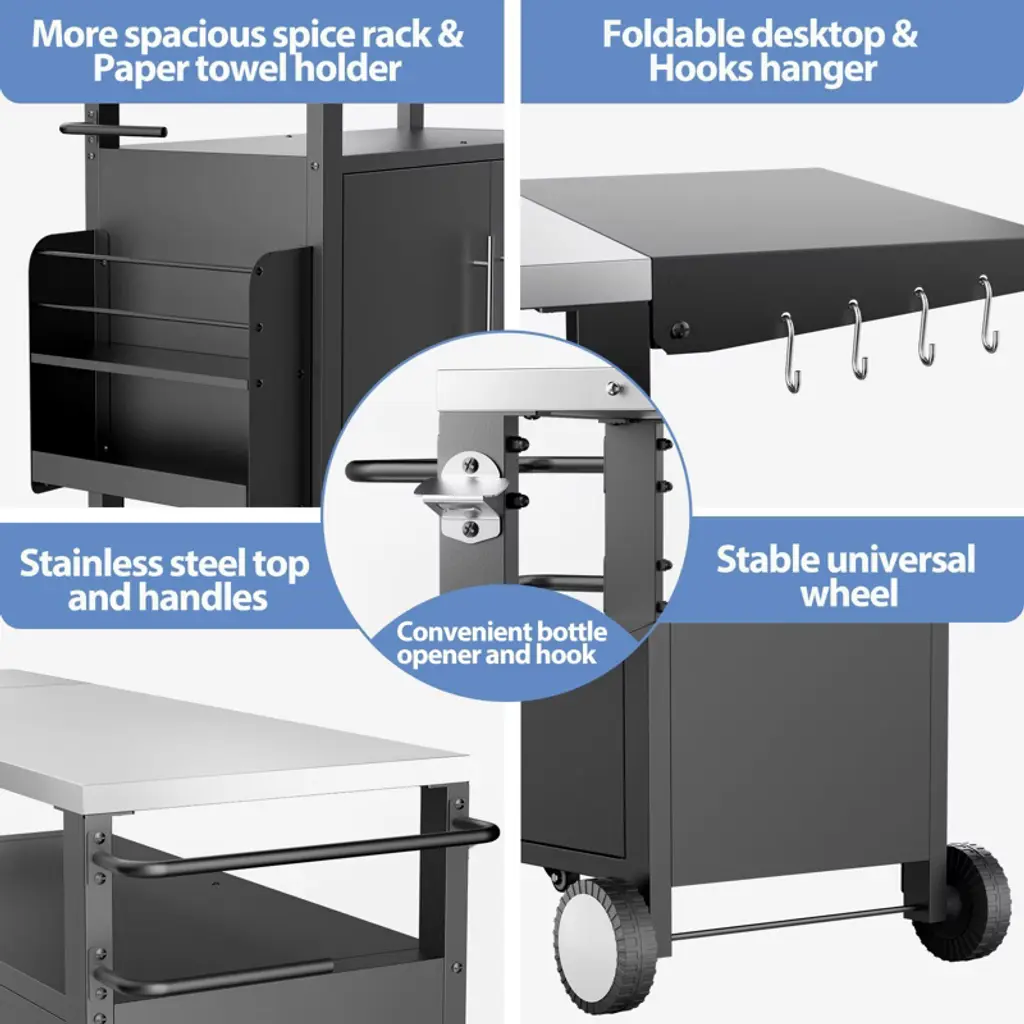 Upgrade your outdoor cooking with this versatile grill cart! Featuring 83 gallons of total storage, a stainless steel top, spice rack, and 4 hooks. With 360° wheels and brakes for easy mobility and stability. Perfect as a patio kitchen island, BBQ prep table, or rolling bar cart for home parties. Durable, waterproof, and fully equipped for all your grilling needs!
