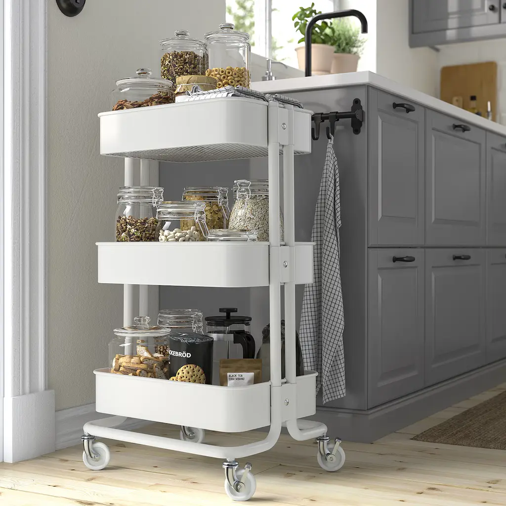 RÅSKOG Utility cart - white 13 3/4x17 3/4x30 3/8 ". Perfect for use in your kitchen or where you need some extra storage space. The sturdy construction and four castors make it easy for you to move the trolley and use it wherever you like. It even fits in tight spaces because of its small size.