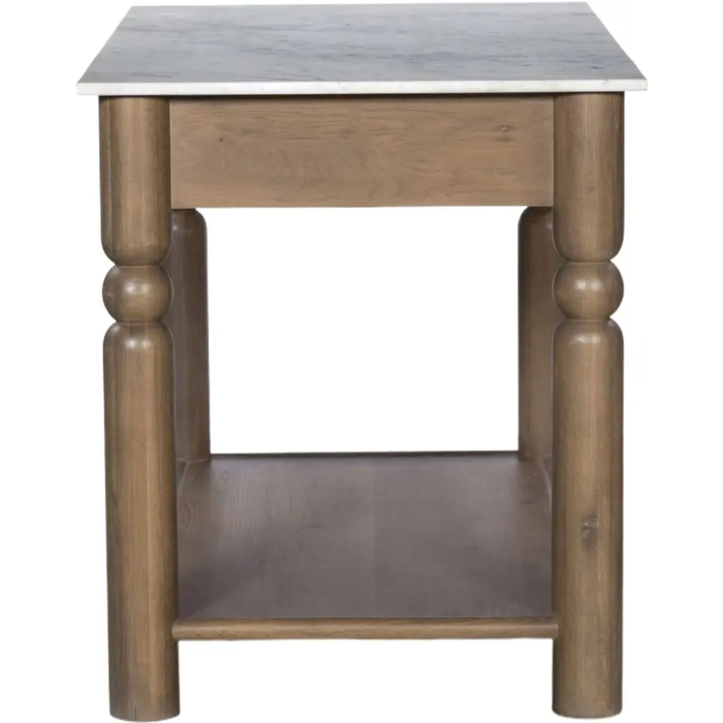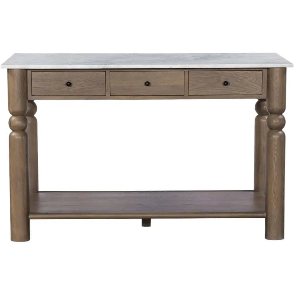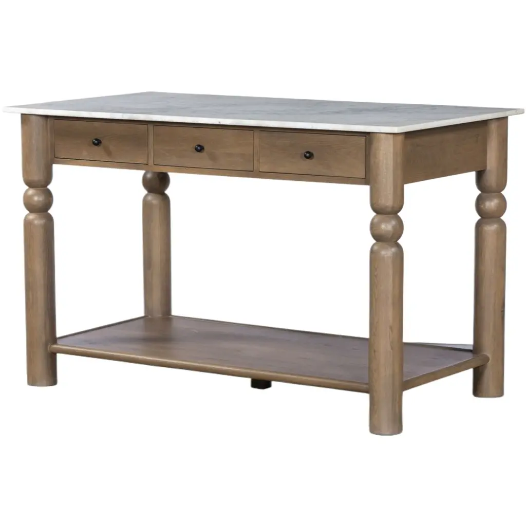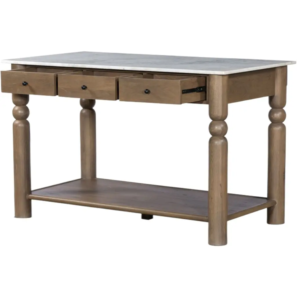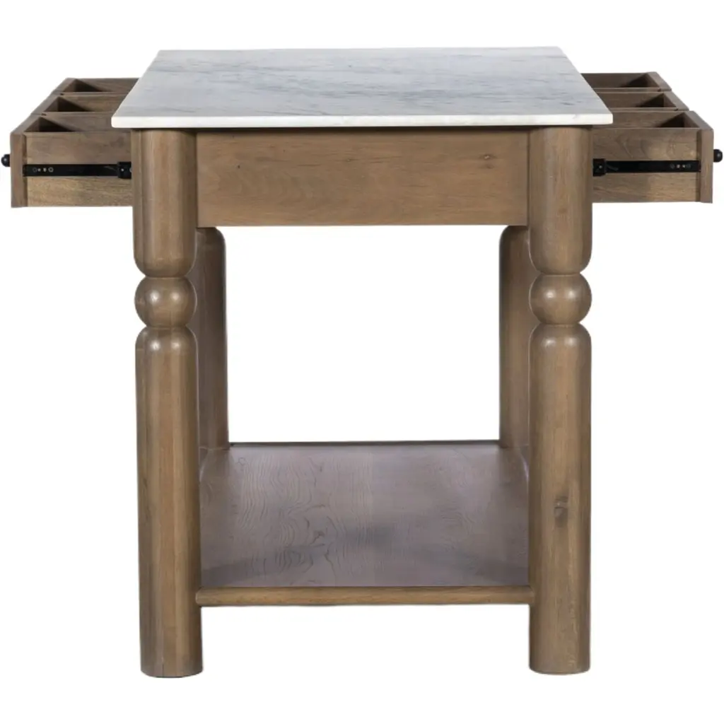 Antique turn shape-inspired with a fresh geometric twist, the Rigby Kitchen Island offers a perfect blend of style and functionality. It features three drawers on each side, providing ample storage, along with a spacious bottom shelf for additional space. This kitchen island is a versatile addition to any kitchen, combining elegance with practicality.