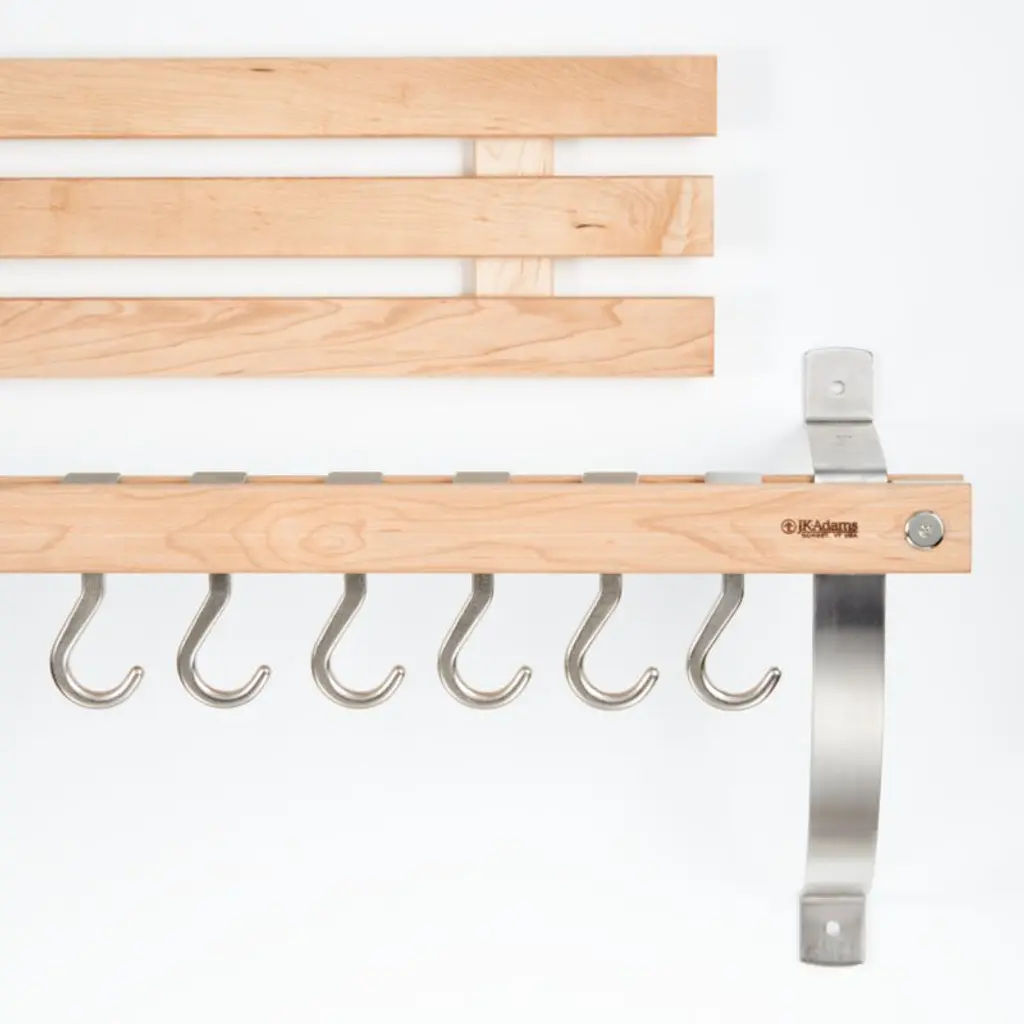 An attractive solution to cookware storage. Hang your pots and pans on the wall for easy, space-saving access on this clever rack worthy of your finest cookware. Six metal hooks make the most of small spaces by holding oft-used cookware where it can be accessed and admired, while the maple slatted shelf offers display space and warm, organic beauty. This wall-mounted maple pot rack supports up to 75 pounds, and hanging hardware is included.Offering fine craftsmanship, J.K. Adams has been creating housewares since 1945.