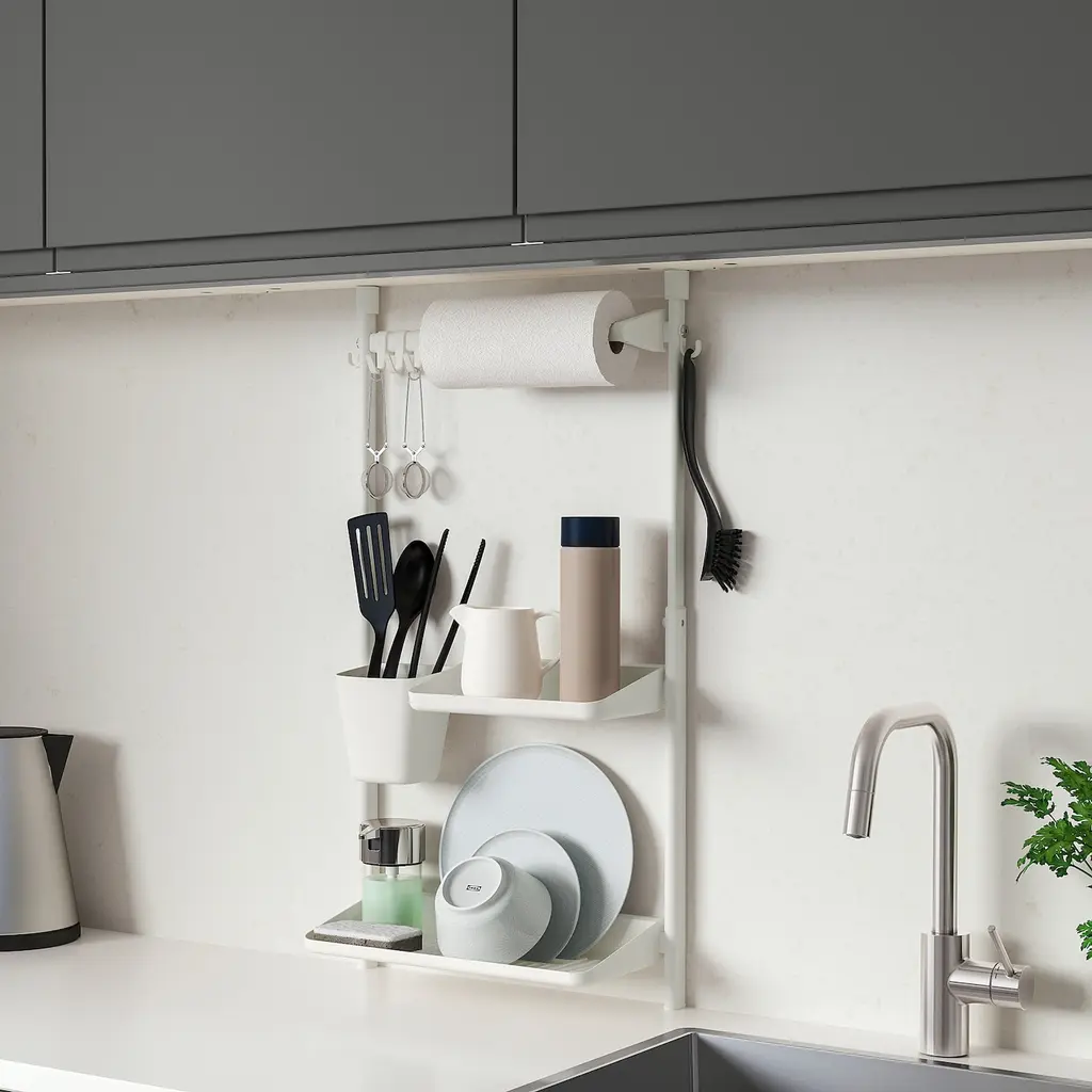 SUNNERSTA Adjustable rack with hooks. Use the hooks to store your kitchenware on the wall and fit more into your cabinets and drawers. Can be used in high humidity areas. Recommended for indoor use only. May be used with SUNNERSTA kitchen accessories. Easy assembly, no need to drill.