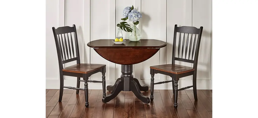 Create an elegant dining space with this Taylor Drop-Leaf Table with Ladder-Back Chairs Set from Winsome. This three-piece walnut dining set includes a rectangle drop-leaf table and two ladder-back chairs - each chair features a slightly-curved back and legs for comfort and simple style. The drop-leaf design helps you customize this dining set depending on the situation, making it a great option whether you're drinking your morning coffee or entertaining guests. The table top and frame are made of solid wood for long lasting durability. Overall size with drop leaf extended 41.7"W x 30.5"D x 29"H. The drop leaf is well supported by folding side panels. The easy glide drawer is finished with a brushed nickel handle. Each table leg has a built-in floor protector to prevent scuffing. The Hamilton Chairs have a comfortable 4-slat back design and are made of solid wood. Finished in a rich Walnut. Assembly required.