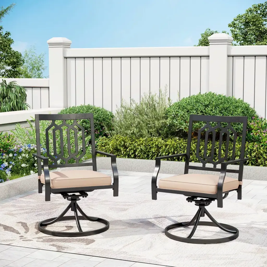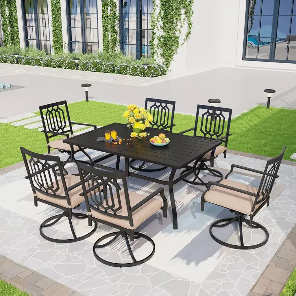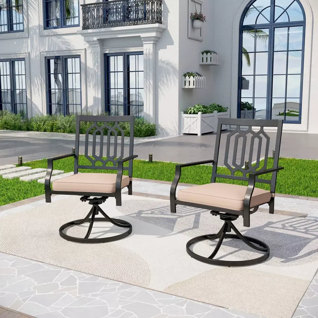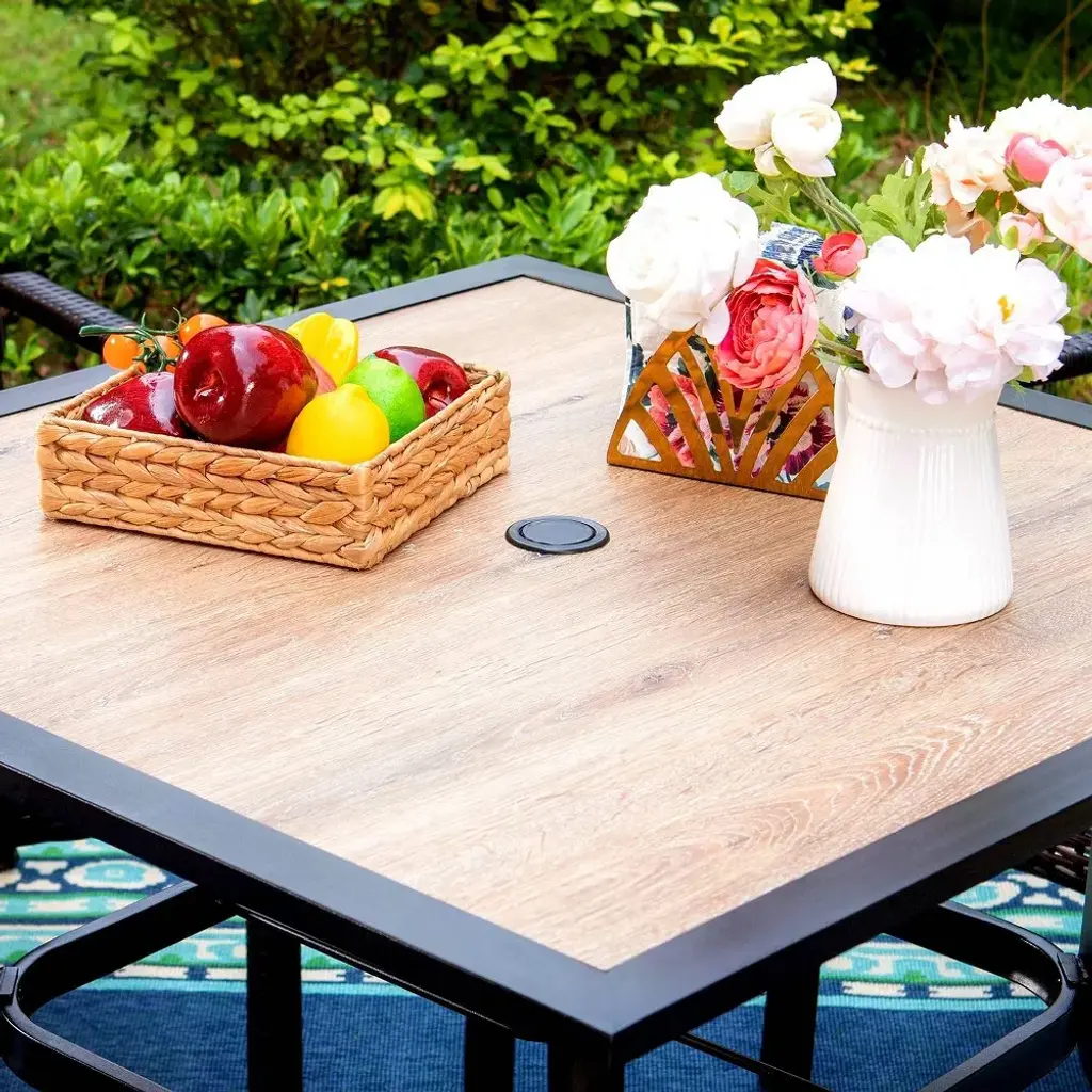 [CAPTIVA DESIGNS] Upgrade your outdoor dining with our 5pc Patio Set with steel square table & armrest chairs. The robust black steel dining table features a wood-like tabletop, seating for four, and an umbrella hole. The 360°swivel chairs, designed with a chic perforated back design, boast straight armrests for style and thick cushions for a comfortably cozy seating experience. Crafted from E-coating and powder-coated steel frame, it's both sturdy and durable, making it suitable for any outdoor setting. Resistant to rust, weather, and fading, it is suitable for indoors and outdoors, with easy assembly and maintenance for hassle-free enjoyment.FEATURESWood-Like Table Top for an elegant appearance.1.57" Umbrella Hole for shade on sunny days.360-Degree Swivel Chairs provide flexible seating options.Fusiform-shaped Backs with stylish and functional design.Straight armrests and thick cushions for enhanced comfort.E-coating and Powder-Coated Steel Frame for a sturdy centerpiece.SPECIFICATIONDining Table: 28"H x 37"W x 37"L, 26.4" (floor to apron height)Arm Chair: 35"H x 22"W x 25"D, 21.3" (seat back height)Seat Dimensions: 20"W x 20"D, Thickness: 2.7"Floor to seat top:15.5" [cushion thickness not included]Weight: 23.7 lbsPackage Includes1 x dining table (1 box)4 x swivel chairs (2 boxes)Instruction Manuals (come with each box)(Decorations on the table are not included)Tips: Allow all the holes in the section to line up correctly and then tighten the screws. Assembly: 30 minutes to set up the table and about 40 minutes to put the chairs together.