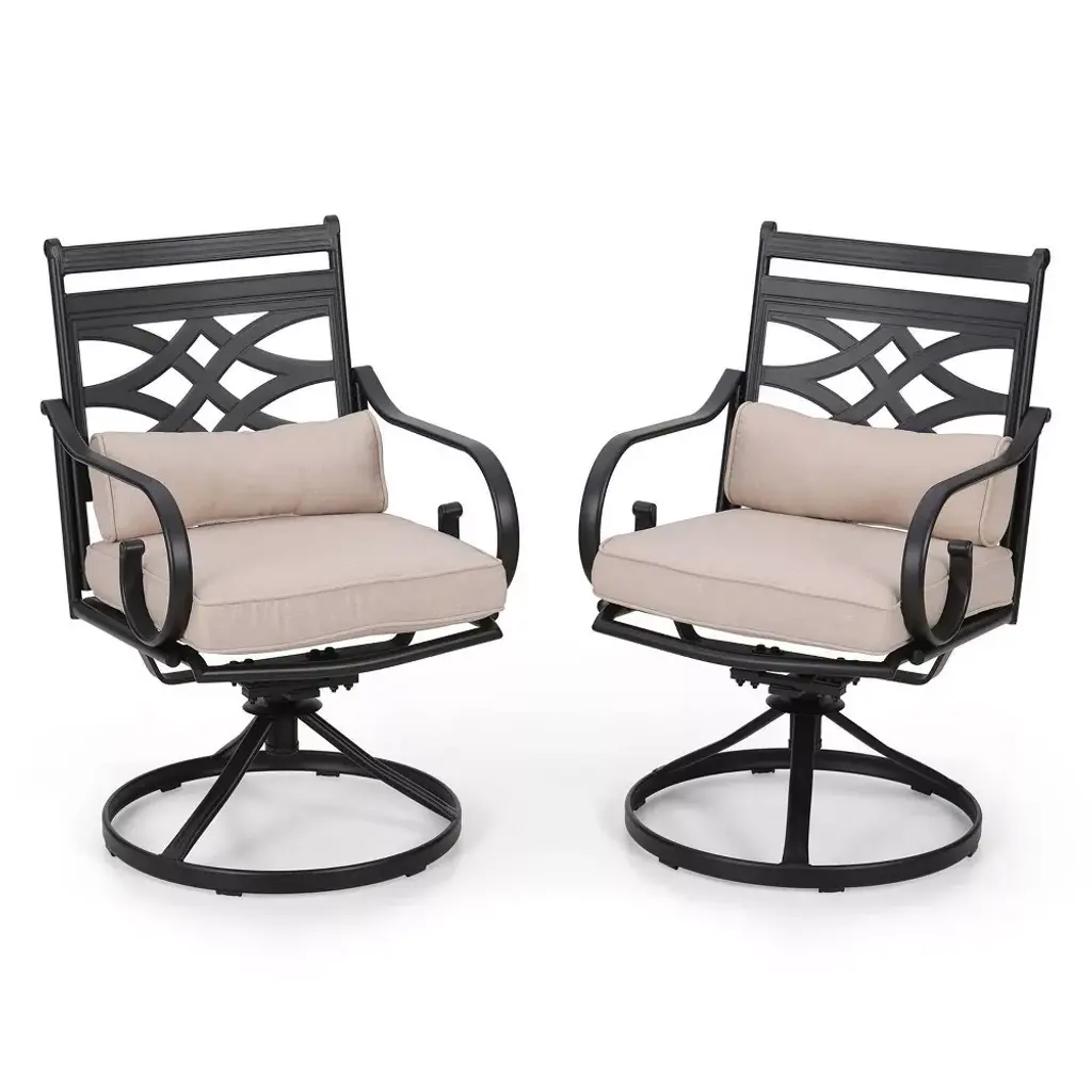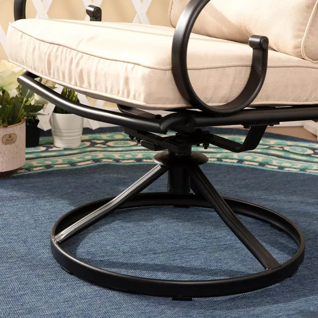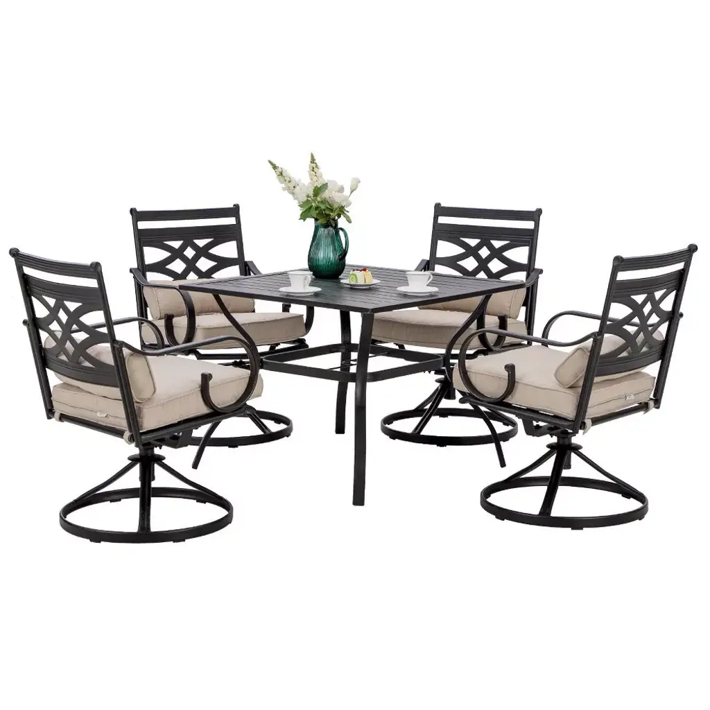 [CAPTIVA DESIGNS] Elevate your outdoor dining with our 5-piece Patio Dining Set. The sturdy steel dining table, with a chic slatted tabletop, is complemented by a 1.57"umbrella. Crafted by hand for durability, these 360° Swivel chairs feature thick cushions and waist pillows for ultimate comfort. Crafted from E-coating and powder-coated metal frame, it's both sturdy and durable, making it suitable for any outdoor setting. Rediscover the joy of outdoor living with our chic and comfortable patio furniture set, perfect for relaxation and hosting distinguished guests in style.FEATURESSleek Slat Tabletop - Stylish and easy to maintain.Umbrella Hole - Ready for various weather conditions.Spacious Seats - Generous seat size for outdoor living.Comfortable Seating - Seat cushions and waist pillows.360-degree Swivel - Provides flexibility and easy movement.Double-coated Frame - For added protection against outdoor elements.SPECIFICATIONDining Table: 28"H x 37"W x 37 "L, 26.6" (floor to apron height)Swivel Chair: 37"H x 22.8"W x 22.5"D, 22" (seat back height)Seat Dimensions: 20"W x 20"D, Cushion Thickness: 4"Floor to seat top: 15.5" [cushion thickness not included]Floor to armrest: 25.5", Weight: 32 PoundsPackage Includes1 x dining table (1 box)4 x arm chairs (2 boxes)Instruction Manuals (come with each box)(Decorations on the table are not included)Tips: Allow all the holes in the section to line up correctly and then tighten the screws. Assembly: 30 minutes to set up the table and 40 minutes to put the chairs together.