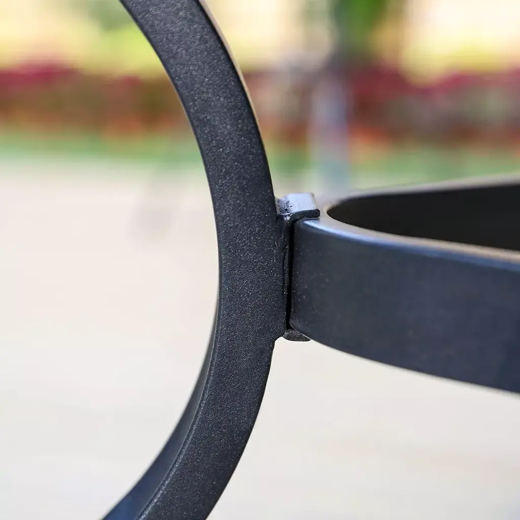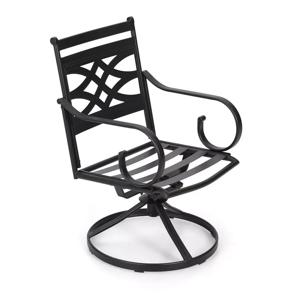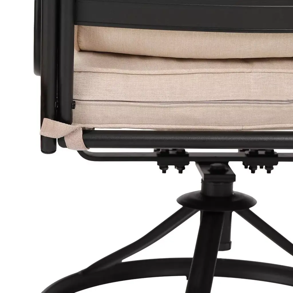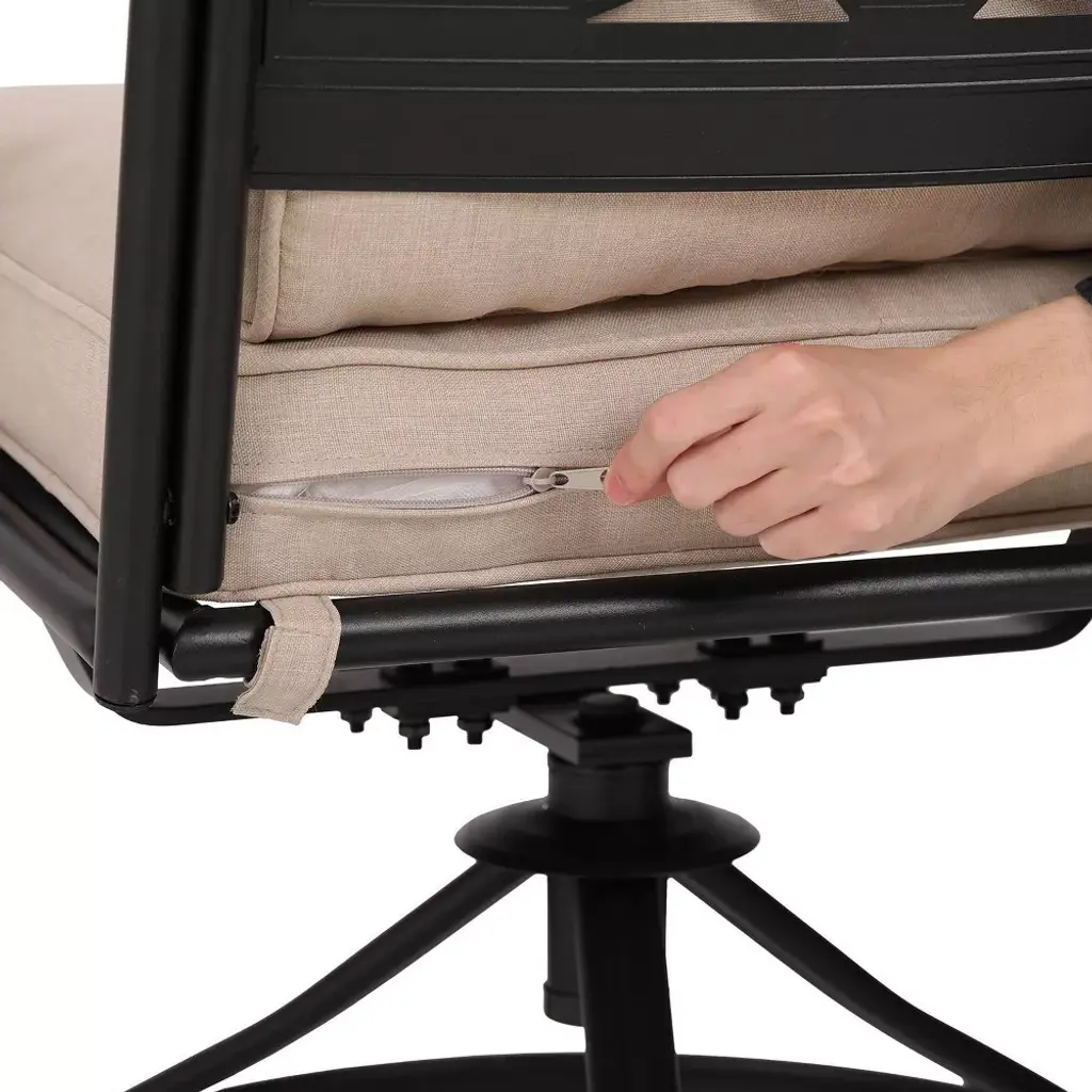 [CAPTIVA DESIGNS] Elevate your outdoor dining with our 5-piece Patio Dining Set. The sturdy steel dining table, with a chic slatted tabletop, is complemented by a 1.57"umbrella. Crafted by hand for durability, these 360° Swivel chairs feature thick cushions and waist pillows for ultimate comfort. Crafted from E-coating and powder-coated metal frame, it's both sturdy and durable, making it suitable for any outdoor setting. Rediscover the joy of outdoor living with our chic and comfortable patio furniture set, perfect for relaxation and hosting distinguished guests in style.FEATURESSleek Slat Tabletop - Stylish and easy to maintain.Umbrella Hole - Ready for various weather conditions.Spacious Seats - Generous seat size for outdoor living.Comfortable Seating - Seat cushions and waist pillows.360-degree Swivel - Provides flexibility and easy movement.Double-coated Frame - For added protection against outdoor elements.SPECIFICATIONDining Table: 28"H x 37"W x 37 "L, 26.6" (floor to apron height)Swivel Chair: 37"H x 22.8"W x 22.5"D, 22" (seat back height)Seat Dimensions: 20"W x 20"D, Cushion Thickness: 4"Floor to seat top: 15.5" [cushion thickness not included]Floor to armrest: 25.5", Weight: 32 PoundsPackage Includes1 x dining table (1 box)4 x arm chairs (2 boxes)Instruction Manuals (come with each box)(Decorations on the table are not included)Tips: Allow all the holes in the section to line up correctly and then tighten the screws. Assembly: 30 minutes to set up the table and 40 minutes to put the chairs together.