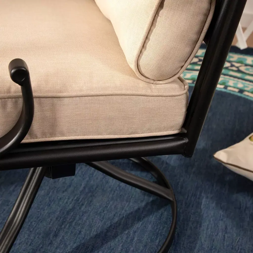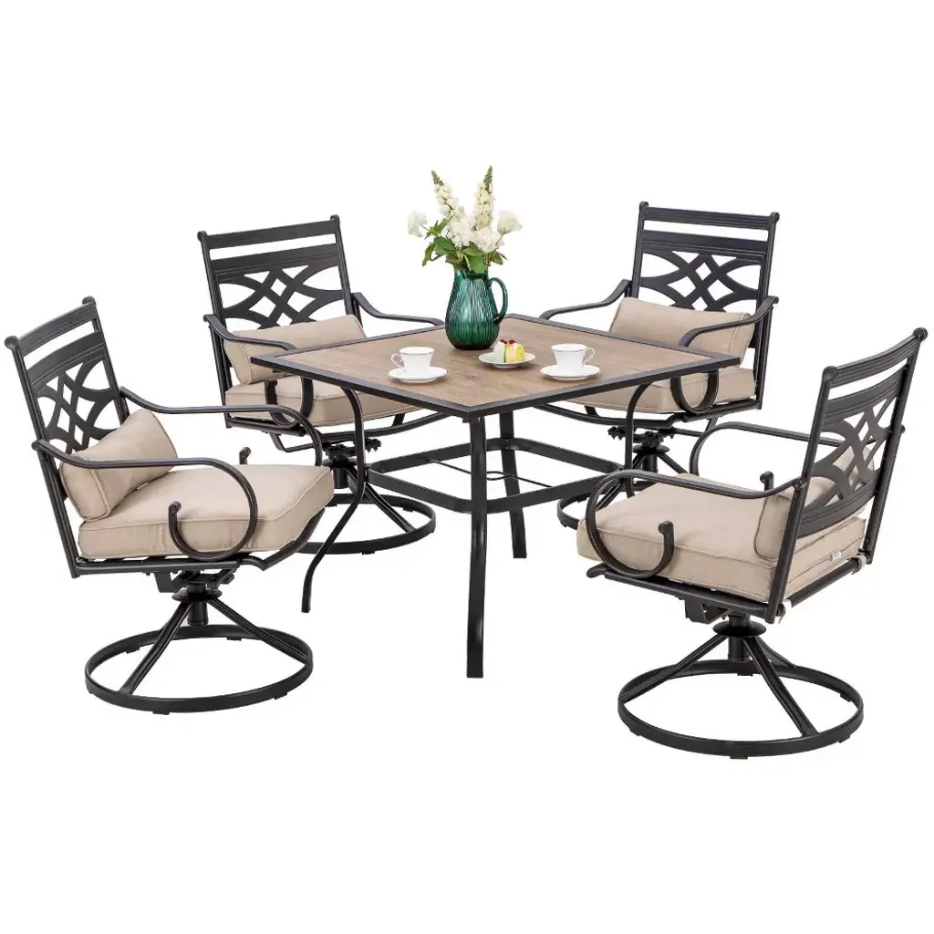 [CAPTIVA DESIGNS] Upgrade your outdoor dining with our 5pc Patio Set with steel square table & armrest chairs. The robust black steel dining table features a wood-like tabletop, seating for four, and an umbrella hole. These chairs feature thick cushions and waist pillows for ultimate comfort and durability. Constructed with sturdy metal, the large seats ensure a cozy dining ambiance. Crafted from E-coating and powder-coated steel frame, it's both sturdy and durable, making it suitable for any outdoor setting. Resistant to rust, weather, and fading, it is suitable for indoors and outdoors, with easy assembly and maintenance for hassle-free enjoyment.FEATURES1.57" Umbrella Hole for shade on sunny days.Wood-Like Table Top for an elegant appearance.Spacious seat size for comfortable outdoor living.Comfortable Seating with seat cushions and waist pillows.360-degree swivel chairs provide flexibility and easy movement.E-coating and Powder-Coated Steel Frame for a sturdy centerpiece.SPECIFICATIONDining Table: 28"H x 37"W x 37"L, 26.4" (floor to apron height)Swivel Chair: 37"H x 22.8"W x 22.5"D, 22" (seat back height)Seat Dimensions: 20"W x 20"D, Cushion Thickness: 4"Floor to seat top: 15.5" [cushion thickness not included]Floor to armrest: 25.5", Weight: 32 PoundsPackage Includes1 x dining table (1 box)4 x swivel chairs (2 boxes)Instruction Manuals (come with each box)(Decorations on the table are not included)Tips: Allow all the holes in the section to line up correctly and then tighten the screws. Assembly: 30 minutes to set up the table and about 50 minutes to put the chairs together.
