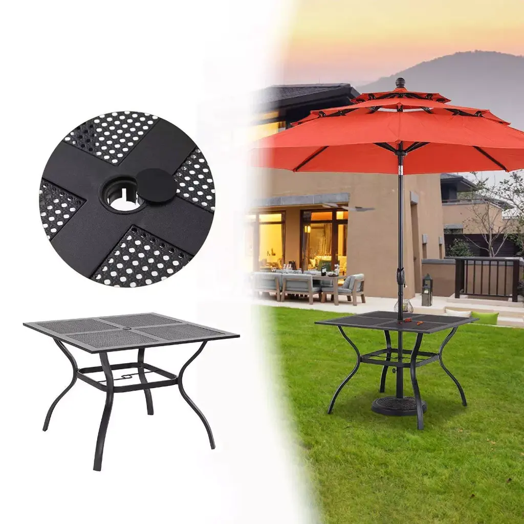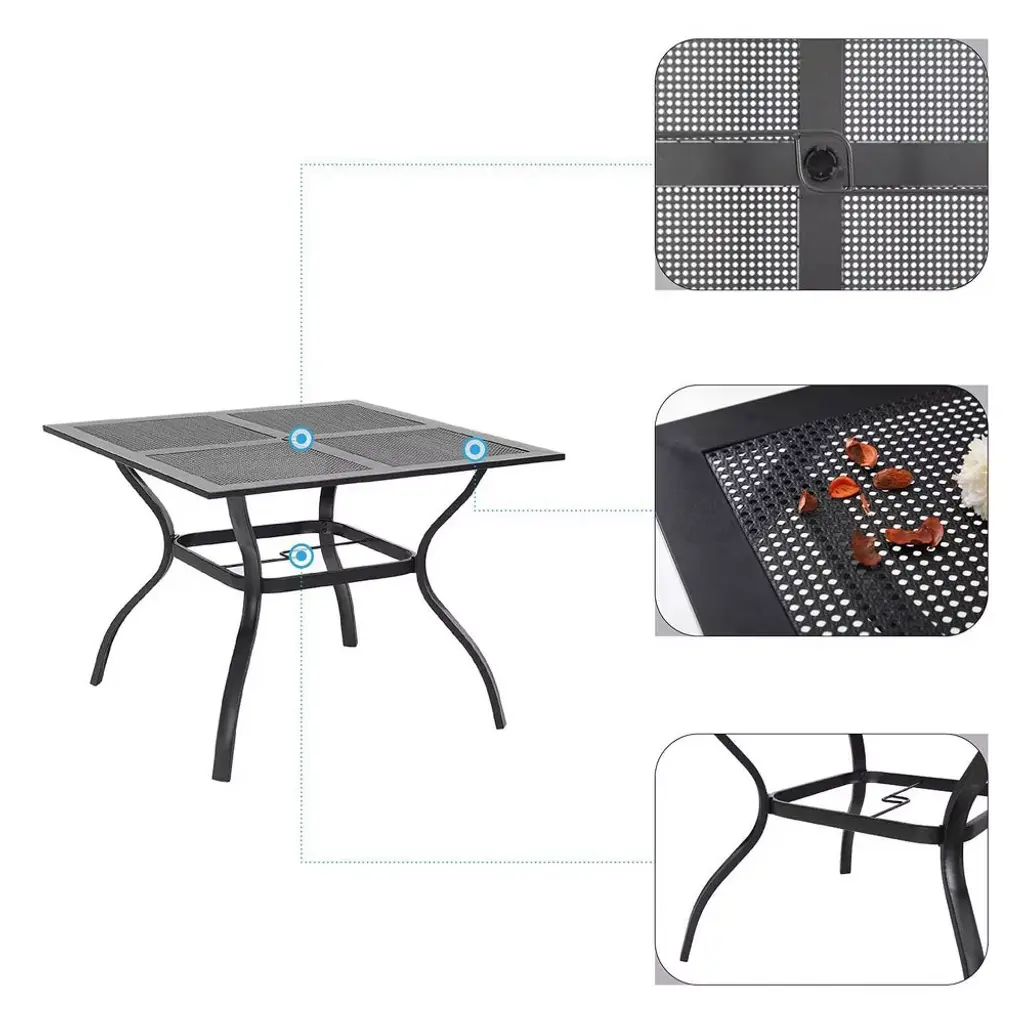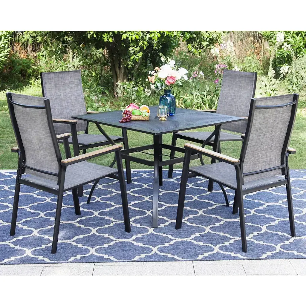 [CAPTIVA DESIGNS] Upgrade your outdoor dining with our Patio Dining Set with umbrella. The sturdy metal dining table, with a chic mesh tabletop, is complemented by a 1.57"umbrella. Paired with stackable sling chairs featuring breathable fabric and a sturdy yet lightweight aluminum frame, this set seamlessly blends comfort, style, and space-saving convenience for both indoor and outdoor settings. It is designed to make your dining moments memorable. Crafted from E-coating and powder-coated metal frame, this durable set seamlessly blends style, function and durability, making it the perfect choice for your outdoor dining needs. Elevate your outdoor space effortlessly with this stylish, comfortable, and durable dining set.FEATURESMesh Tabletop beautifies and drains efficiently.Convenient 1.57" umbrella hole for sunny days.Space-saving design of stackable chairs for compact storage.Breathable sling fabric & comfortable wood-like armrests.Lightweight aluminum chairs are easy to move and stack.Durable-coated metal frame for Long-lasting ProtectionSPECIFICATIONDining Table: 28"H x 37"W x 37 "L, 26.6" (floor to apron height)Arm Chair: 39.4"H x 24"W x 24.8"D, 22.5" (seat back height)Seat Dimensions: 20.5"W x 20.5"D x 17"H [floor to seat top]25" [floor to armrest] & Weight: 9 lbsPackage Includes1 x dining table (1 box)4x armrest chairs (2 boxes)Instruction Manuals (come with each box)(Decorations on the table are not included)Tips: Allow all the holes in the section to line up correctly and then tighten the screws. Assembly: About 20 minutes to set up the table and 40 minutes to put the chairs together.