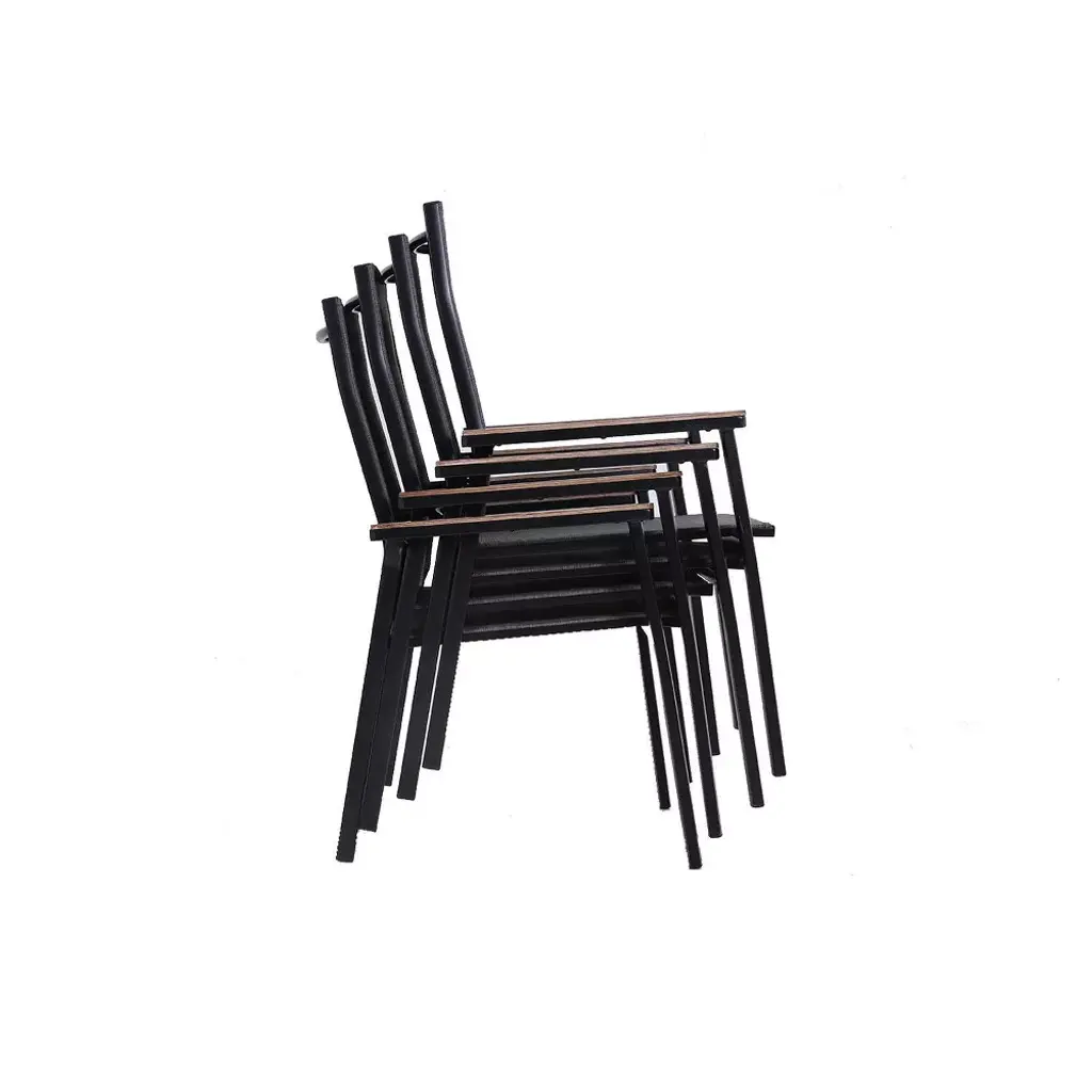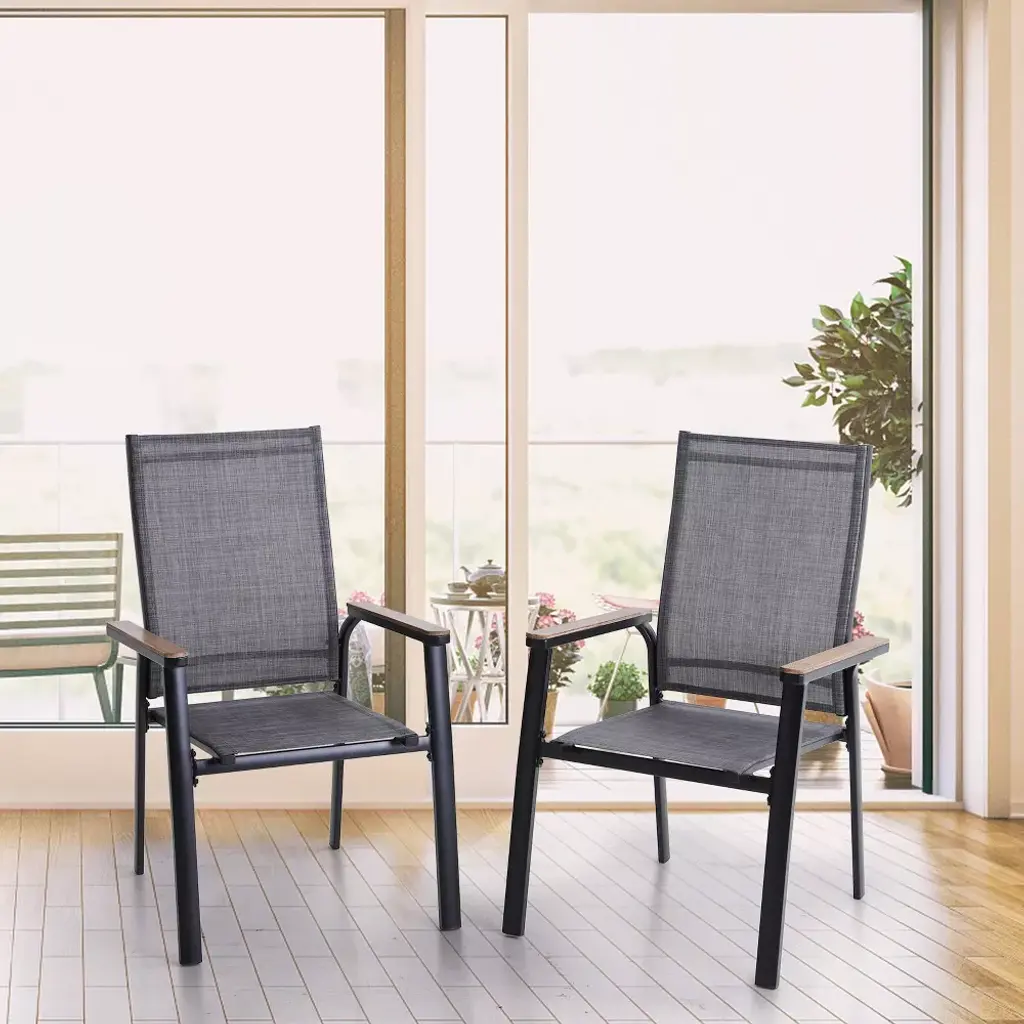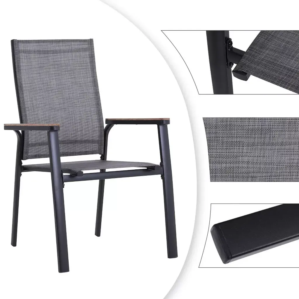 [CAPTIVA DESIGNS] Upgrade your outdoor dining with our Patio Dining Set with umbrella. The sturdy metal dining table, with a chic mesh tabletop, is complemented by a 1.57"umbrella. Paired with stackable sling chairs featuring breathable fabric and a sturdy yet lightweight aluminum frame, this set seamlessly blends comfort, style, and space-saving convenience for both indoor and outdoor settings. It is designed to make your dining moments memorable. Crafted from E-coating and powder-coated metal frame, this durable set seamlessly blends style, function and durability, making it the perfect choice for your outdoor dining needs. Elevate your outdoor space effortlessly with this stylish, comfortable, and durable dining set.FEATURESMesh Tabletop beautifies and drains efficiently.Convenient 1.57" umbrella hole for sunny days.Space-saving design of stackable chairs for compact storage.Breathable sling fabric & comfortable wood-like armrests.Lightweight aluminum chairs are easy to move and stack.Durable-coated metal frame for Long-lasting ProtectionSPECIFICATIONDining Table: 28"H x 37"W x 37 "L, 26.6" (floor to apron height)Arm Chair: 39.4"H x 24"W x 24.8"D, 22.5" (seat back height)Seat Dimensions: 20.5"W x 20.5"D x 17"H [floor to seat top]25" [floor to armrest] & Weight: 9 lbsPackage Includes1 x dining table (1 box)4x armrest chairs (2 boxes)Instruction Manuals (come with each box)(Decorations on the table are not included)Tips: Allow all the holes in the section to line up correctly and then tighten the screws. Assembly: About 20 minutes to set up the table and 40 minutes to put the chairs together.