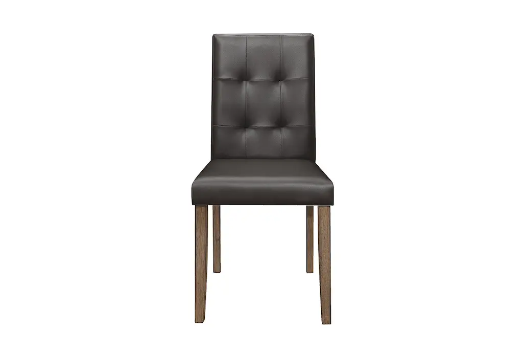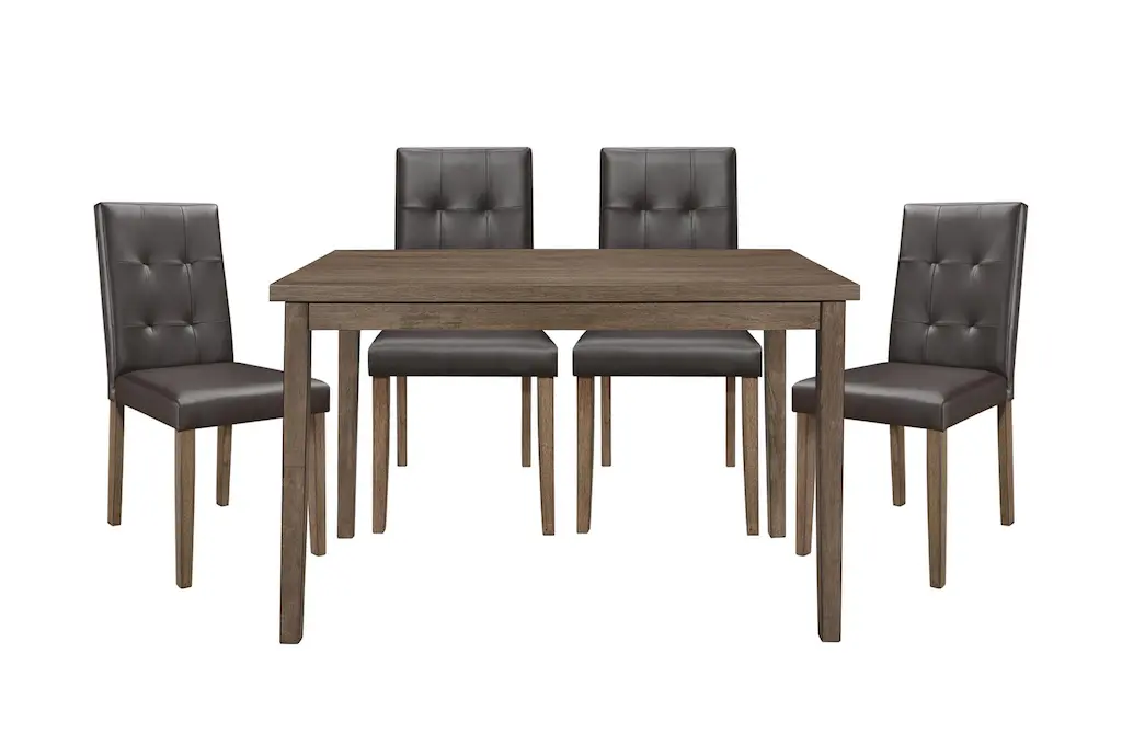 The Liliana Dining Set for 4 is a stylish and casual addition to any dining room, featuring a button-tufted chair back and a warm brown color scheme. Made from durable wood and faux leather materials, this set includes a dining room table and four armless side chairs that comfortably seat four.