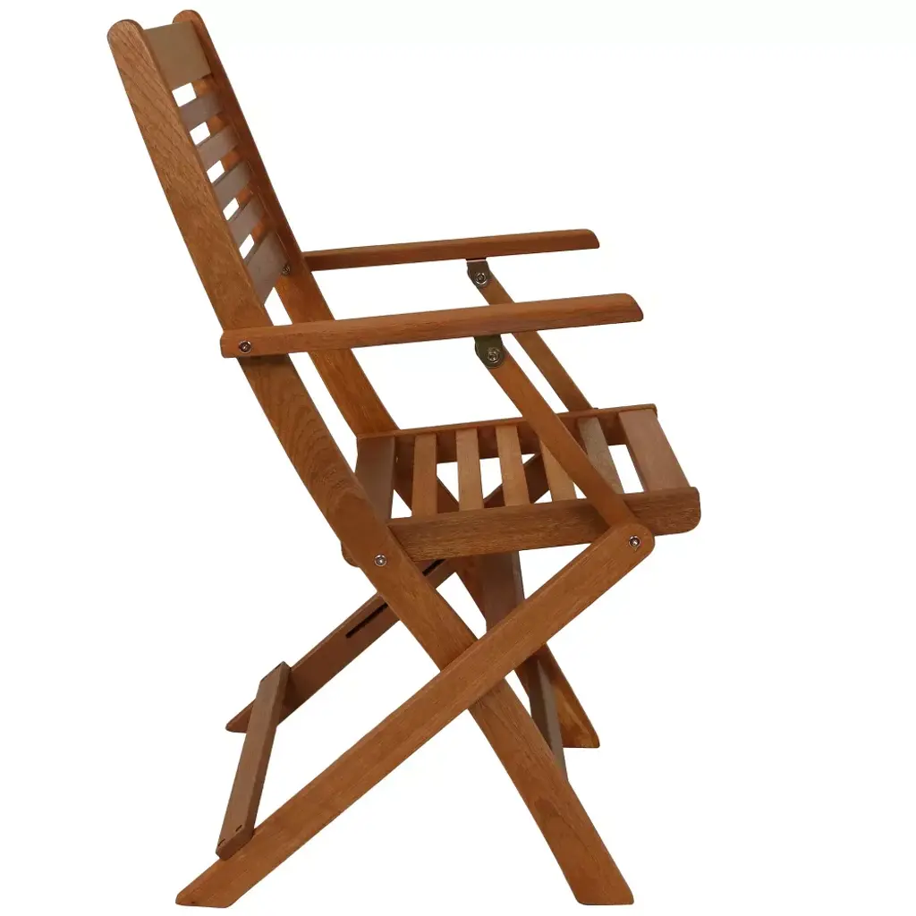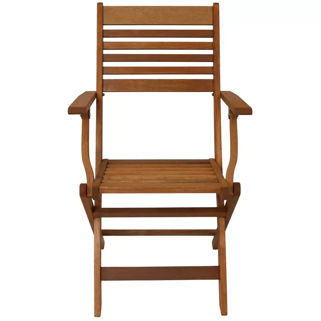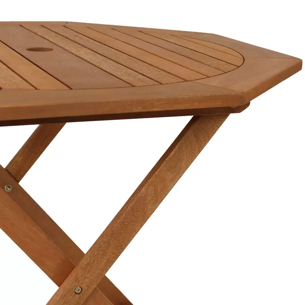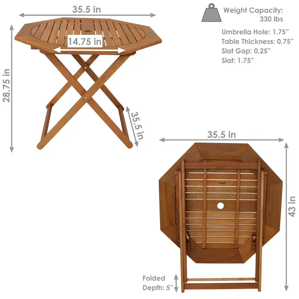 Enjoy a leisurely brunch in the garden or in the backyard with this Meranti wood, 5-piece, foldable dining patio set featuring four identical chairs and one octagonal table. Two of the chairs have arm rests and two of the chairs do not. This attractive outdoor furniture set is constructed of meranti wood with a beautiful teak oil finish, sure to complement any outdoor style. It features a simple yet striking design on the chairs and table to add a timeless, warm, and attractive feature that works well with other styles of outdoor decor. Perfect for creating a welcoming gathering space outdoors, this patio set is sure to look beautiful, stand strong against outdoor elements, and stay functional so you can enjoy dinners, parties, or relaxing time outdoors with friends and family effortlessly. Plus, no assembly is required, as each piece of furniture unfolds straight from the box for easy setup, take down, mobility, and storage when not in use.• ATTRACTIVE PATIO SET: The table measures 35.5" W x 35.5" D x 28.75" H and weighs 21 lbs. The table has a 330 lb weight capacity. The center of the patio table features a 1.75" diameter to accommodate a patio umbrella. The chairs without arms measure 18" W x 22.5" D x 36" H and weigh 11 lbs each. The armchairs measure 20.25" W x 22.5" D x 36" H and weigh 12 lbs each. Each chair has a weight capacity of 220 lbs.• SOLID WOOD CONSTRUCTION: This outdoor wooden furniture is made of meranti wood with an attractive teak oil finish. The patio furniture set includes 1 folding table, 2 folding chairs, and 2 folding armchairs. Imagine starting the day by enjoying breakfast outdoors or having a delicious dinner on the patio in the evening.• EASY TO PUT TOGETHER: No assembly is required as each piece folds for easy setup and storage. Simply unfold each piece right out of the box and this set is ready to go.• COMFORTABLE OUTDOOR SEATING: Enjoy dinner al fresco or great conversation with family and friends while gathered around this patio dining set in the yard or by the pool.• WORRY-FREE PURCHASING: Sunnydaze Decor backs its products with a 1-year manufacturer's warranty.